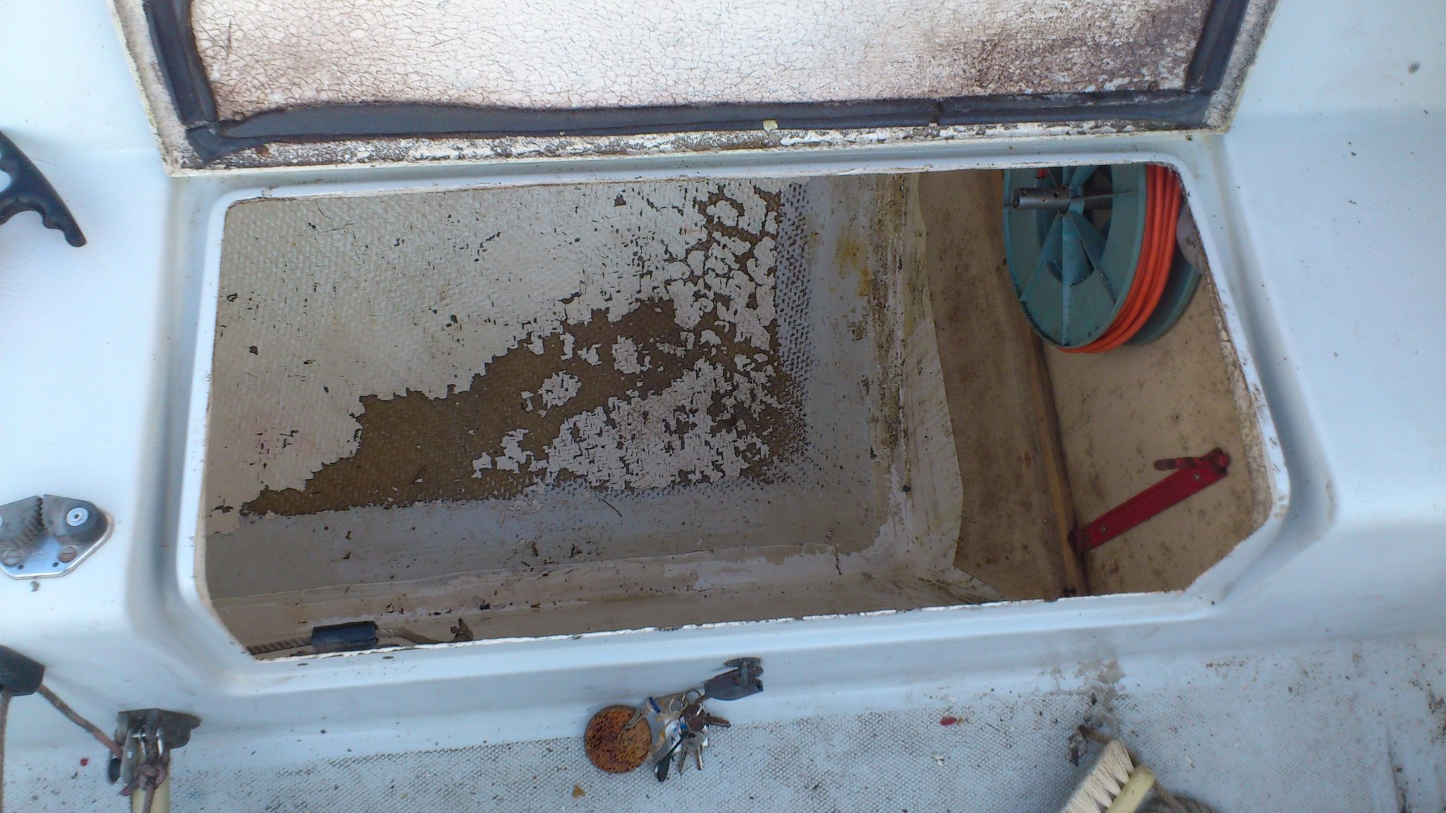 Le coffre est désormais rangé et propre (même si un bon coup de ponçage et de peinture serait bienvenu), mais pas de palan d’écoute de GV.