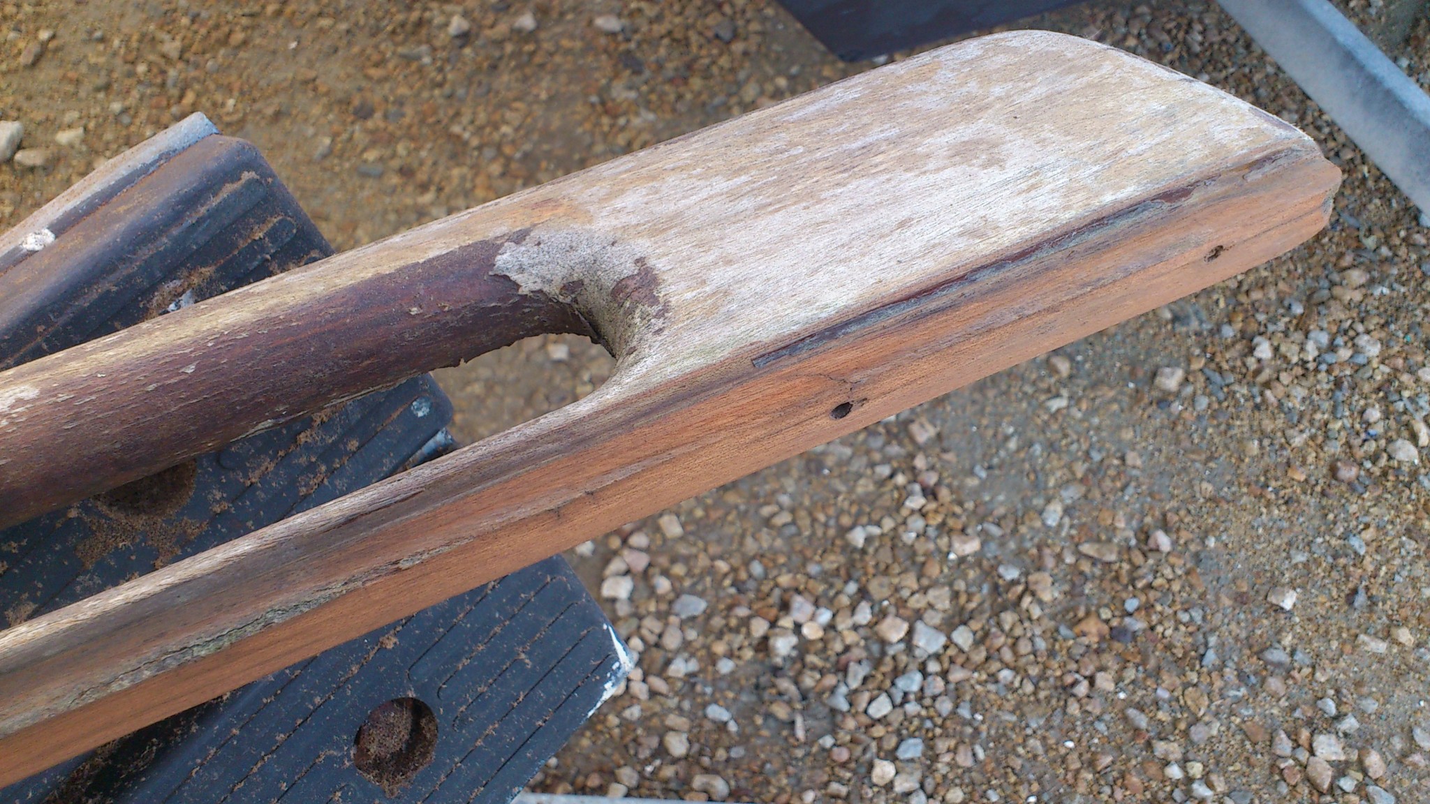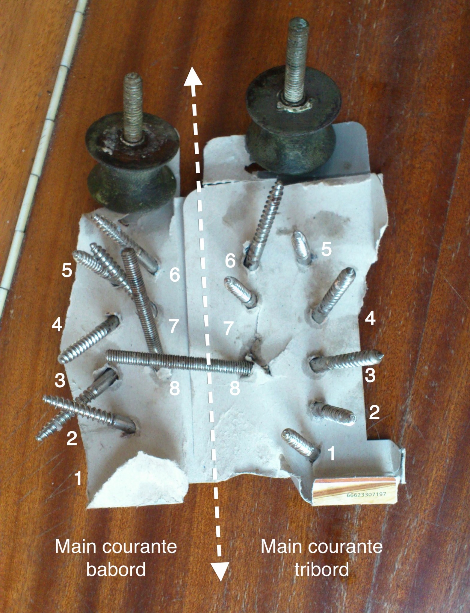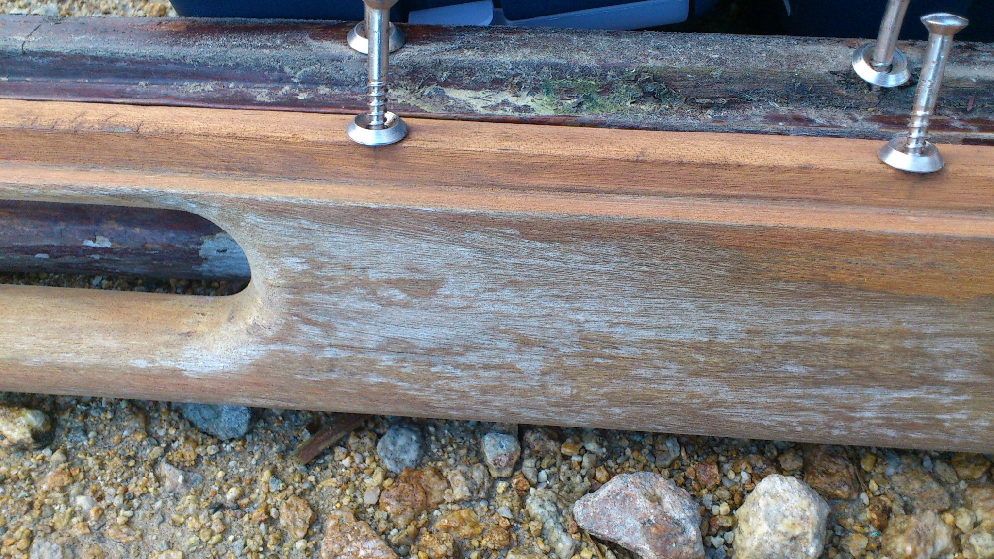 La seconde opération consistait à démonter les longues mains courantes sur l’extérieur du roof, j’avais essayé la dernière fois de les démonter, mais la dernière vis tournait dans le vide. J’avais investit dans un gros tournevis à la taille de la vis, mais malgré le bel outil, ça tournait toujours dans la semoule… Et c’est là que mon fils me dit : « il doit y avoir un écrou dessous », au début je ne le crois pas, pourquoi un boulon au bout de la main courante alors que toutes les autres accroches se font par une vis plantée directement dans des contre-moulages… Et lui de triompher depuis la cabine avant : « Oui ! C’est ça ! ». Un peu vexé mais content tout de même de finalement décrocher les mains courantes, j’ai pu m’atteler au ponçage de ces pièces de bois bien fatiguées… Ponçage au 40 (ponçage à main), ça décape bien les restes de vernis, même si ça s’encrasse assez vite. La finition est grossière, il serait sans doute pas inintéressant d’y revenir avec un grain plus fin. Petite surprise : il semblerait que la couleur (jaune) du bois des mains courantes extérieures soit très différentes de celle (rouge) des listons et des mains courantes du roof relevable… Je me demande ce que ça va donner une fois traité au lin qui ne colore pas vraiment le bois…