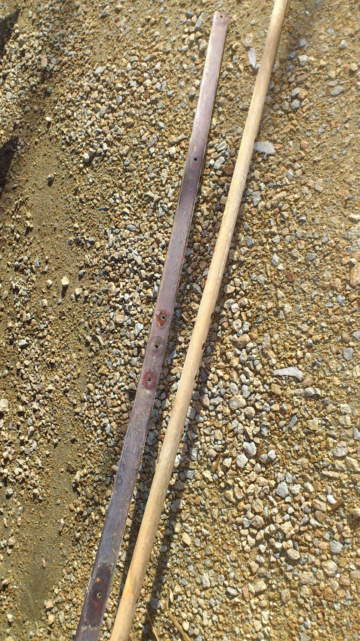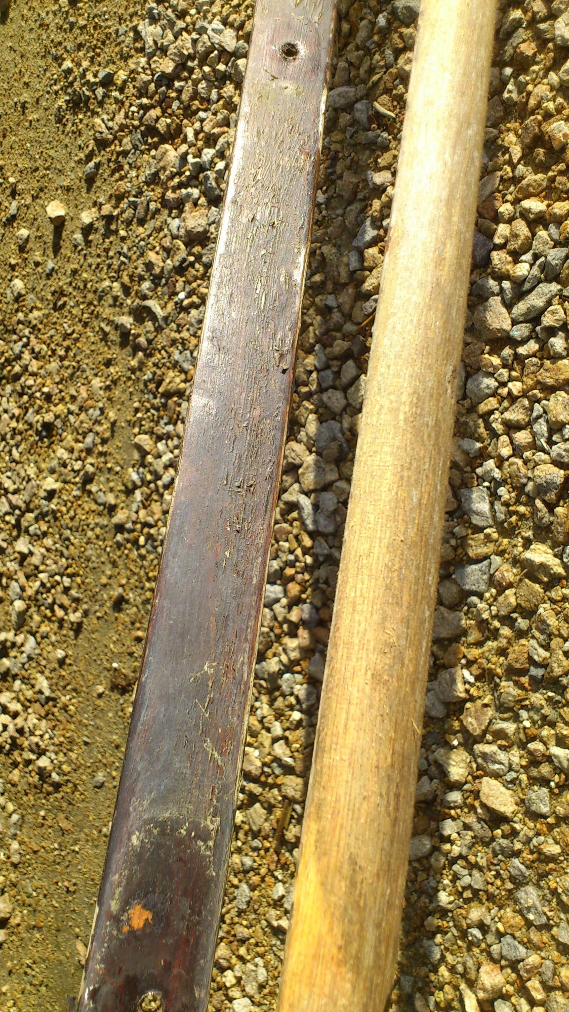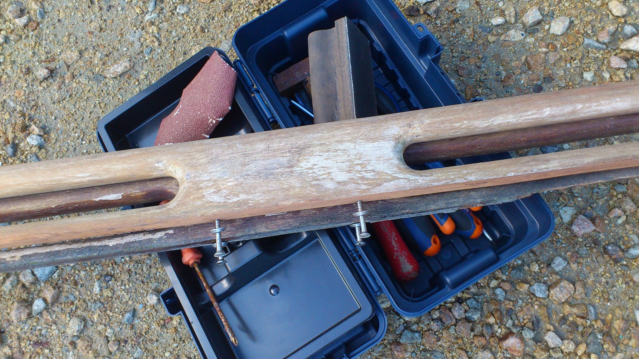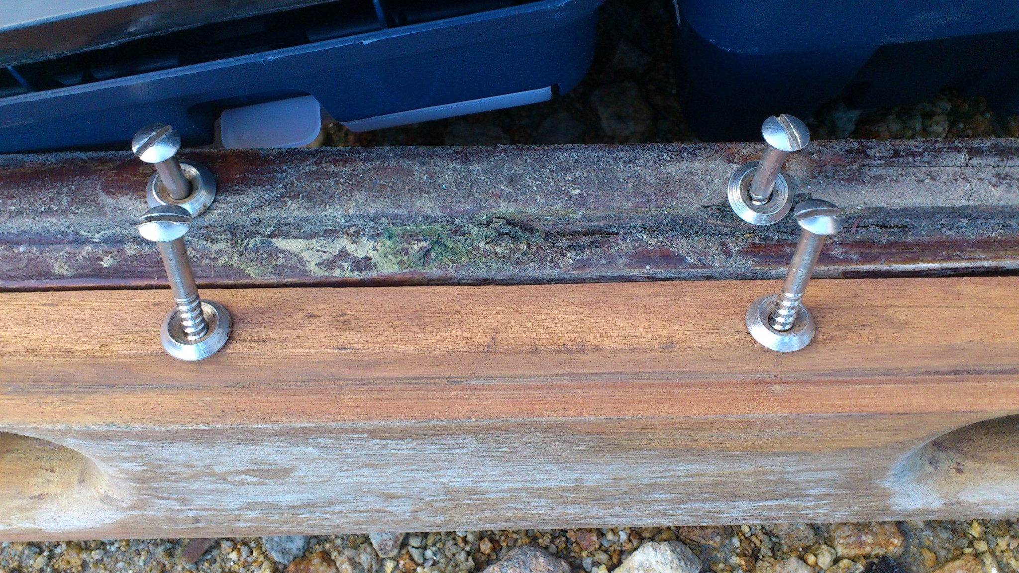 La seconde opération consistait à démonter les longues mains courantes sur l’extérieur du roof, j’avais essayé la dernière fois de les démonter, mais la dernière vis tournait dans le vide. J’avais investit dans un gros tournevis à la taille de la vis, mais malgré le bel outil, ça tournait toujours dans la semoule… Et c’est là que mon fils me dit : « il doit y avoir un écrou dessous », au début je ne le crois pas, pourquoi un boulon au bout de la main courante alors que toutes les autres accroches se font par une vis plantée directement dans des contre-moulages… Et lui de triompher depuis la cabine avant : « Oui ! C’est ça ! ». Un peu vexé mais content tout de même de finalement décrocher les mains courantes, j’ai pu m’atteler au ponçage de ces pièces de bois bien fatiguées… Ponçage au 40 (ponçage à main), ça décape bien les restes de vernis, même si ça s’encrasse assez vite. La finition est grossière, il serait sans doute pas inintéressant d’y revenir avec un grain plus fin. Petite surprise : il semblerait que la couleur (jaune) du bois des mains courantes extérieures soit très différentes de celle (rouge) des listons et des mains courantes du roof relevable… Je me demande ce que ça va donner une fois traité au lin qui ne colore pas vraiment le bois…