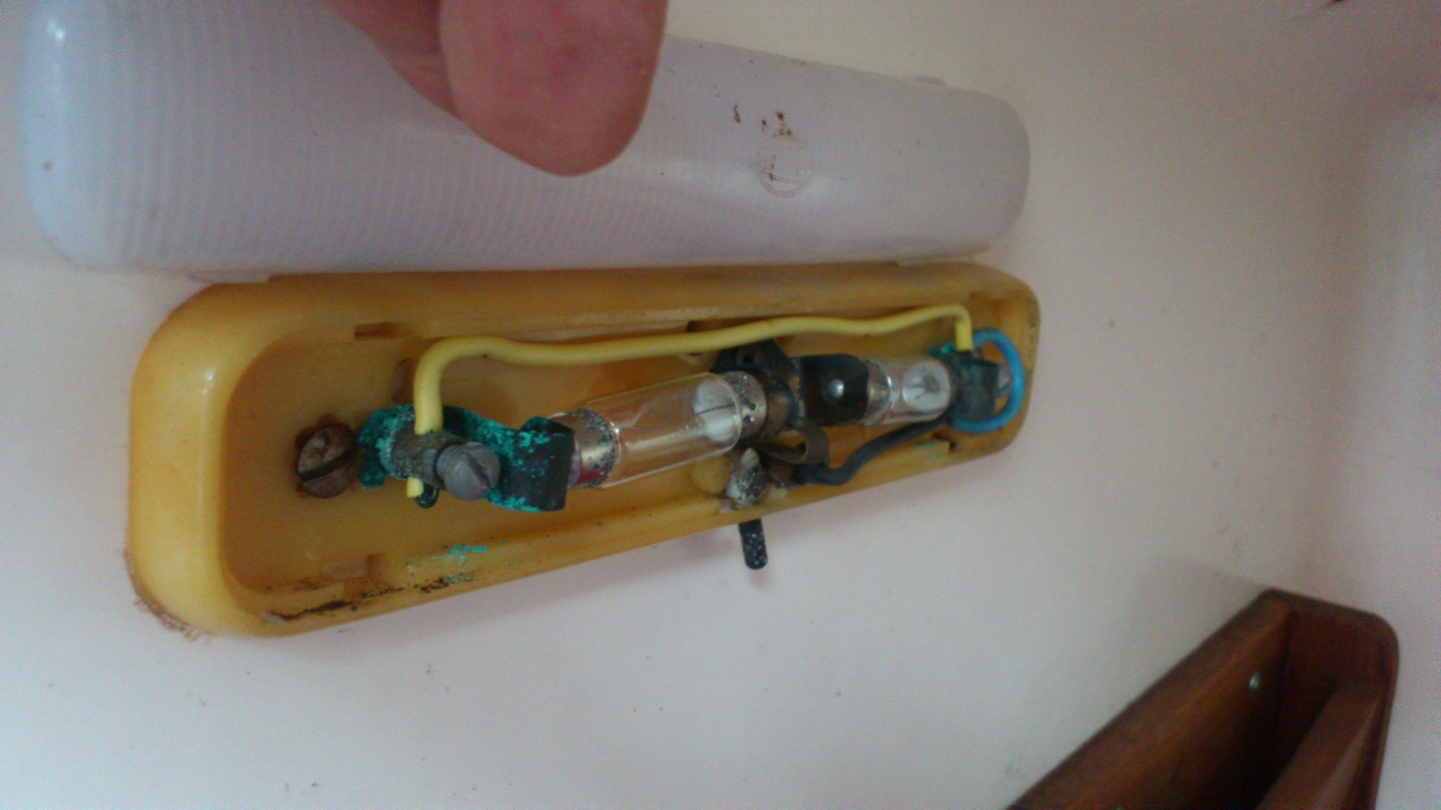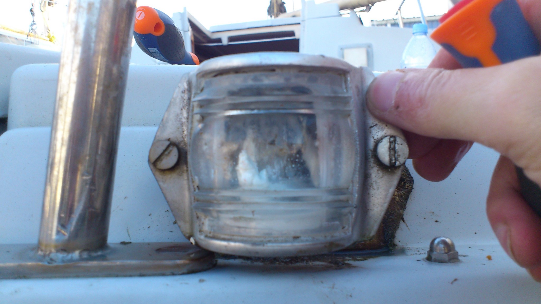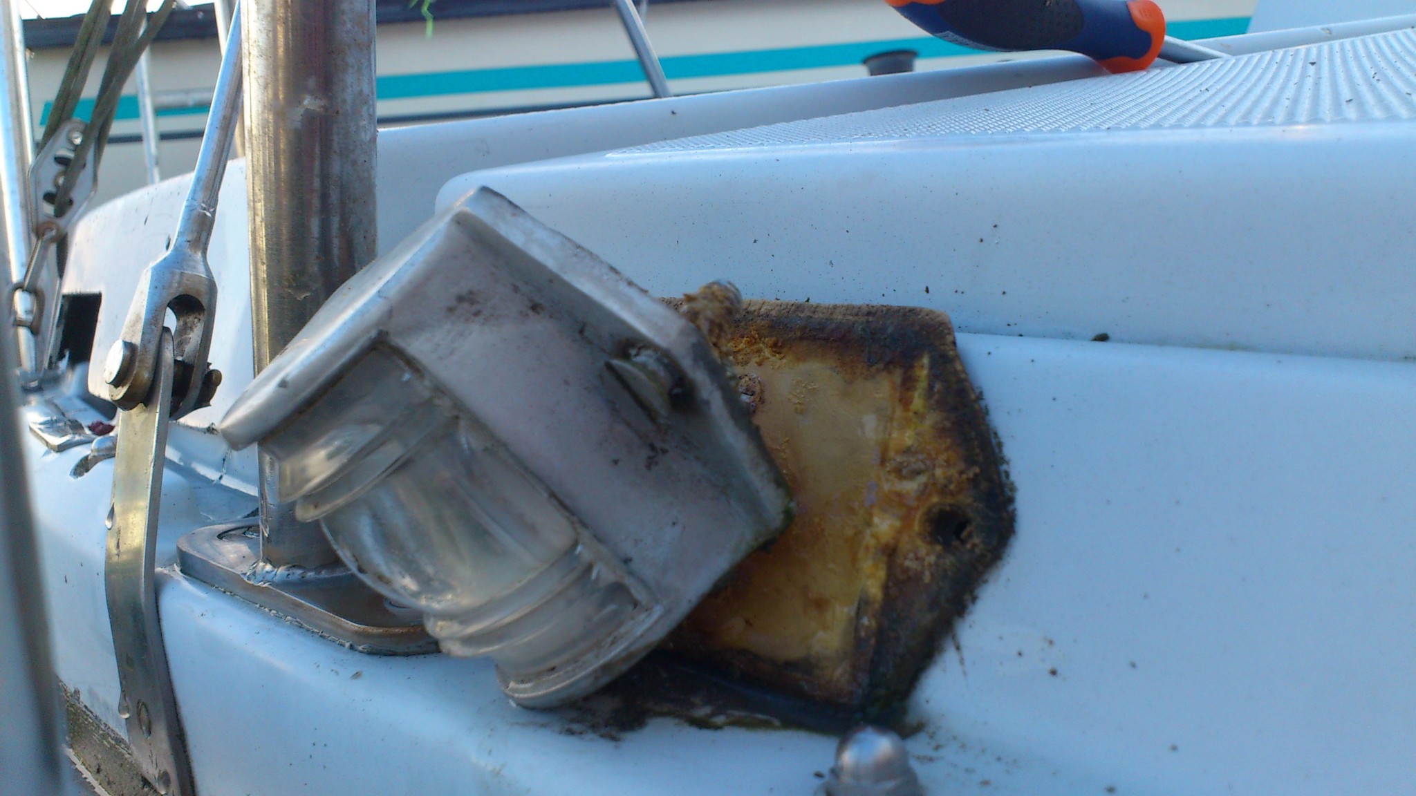 Et puis divers travaux annexes : petit tour de l’électricité, je voudrais remplacer les ampoules par du LED dans le bateau mais conserver les appliques que je trouve assez chouettes avec leur petit look vintage, les connecteurs sont bien oxydés, je me demande ce que ça peut donner (car la batterie que j’ai essayé de charger cette semaine ne dépasse pas les 4v après 48h en charge). Le feu de poupe laisse apparaître un amas blanc d’oxydation (et en le retirant, c’est un jus du même blanc qui venait avec le câble), ça m’étonnerait bien qu’il fonctionne encore… L’accroche basse du safran bouge pas mal, il faudra la resserrer, la bonne nouvelle, c’est que l’ancien propriétaire semble avoir fait ces travaux, on a une trappe d’accès à l’arrière de la fixation. La poulie tribord du rail de génois est complètement grippée, même avec du dégrippant et des coups de marteaux, il ne veut pas bouger…