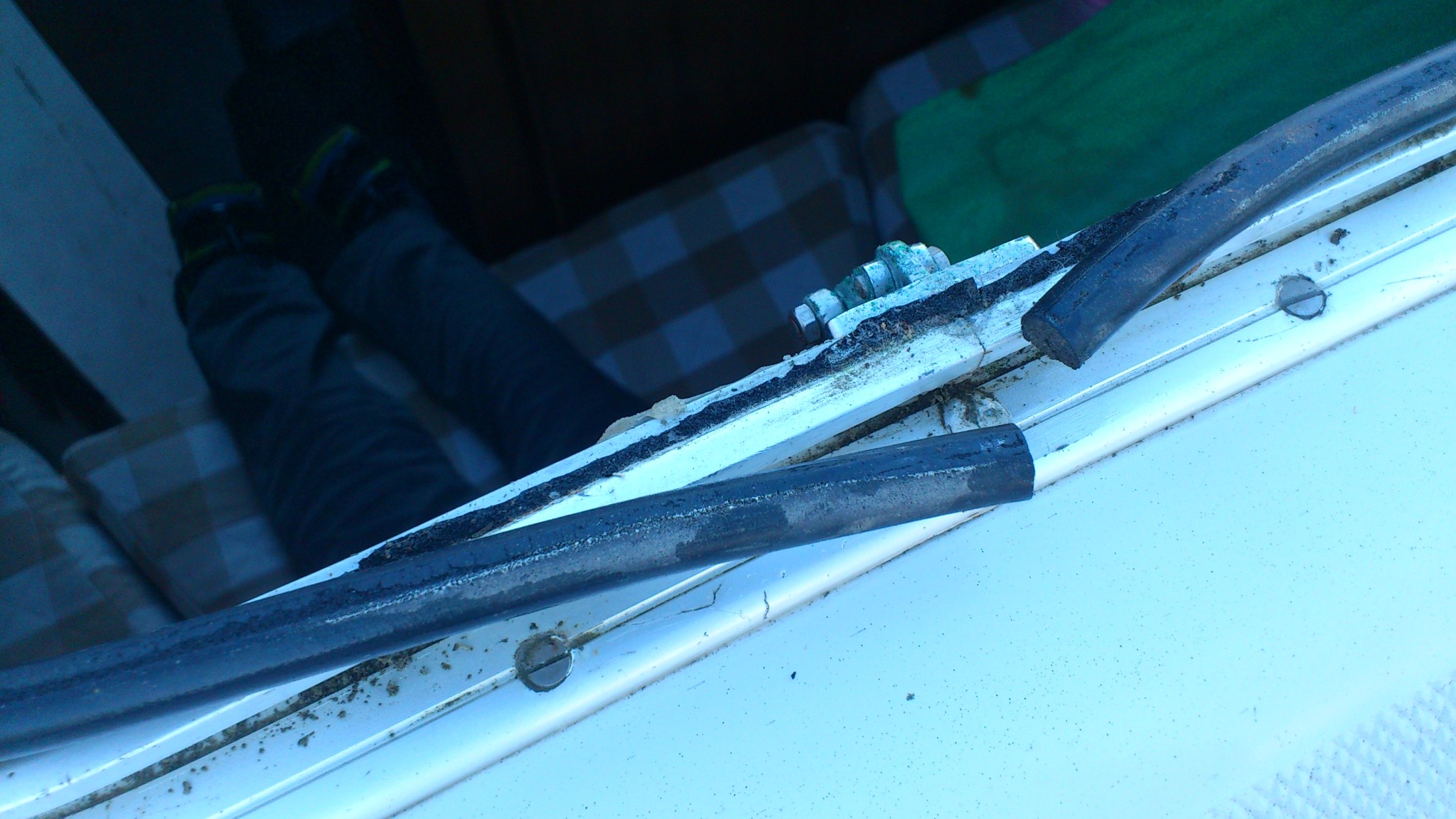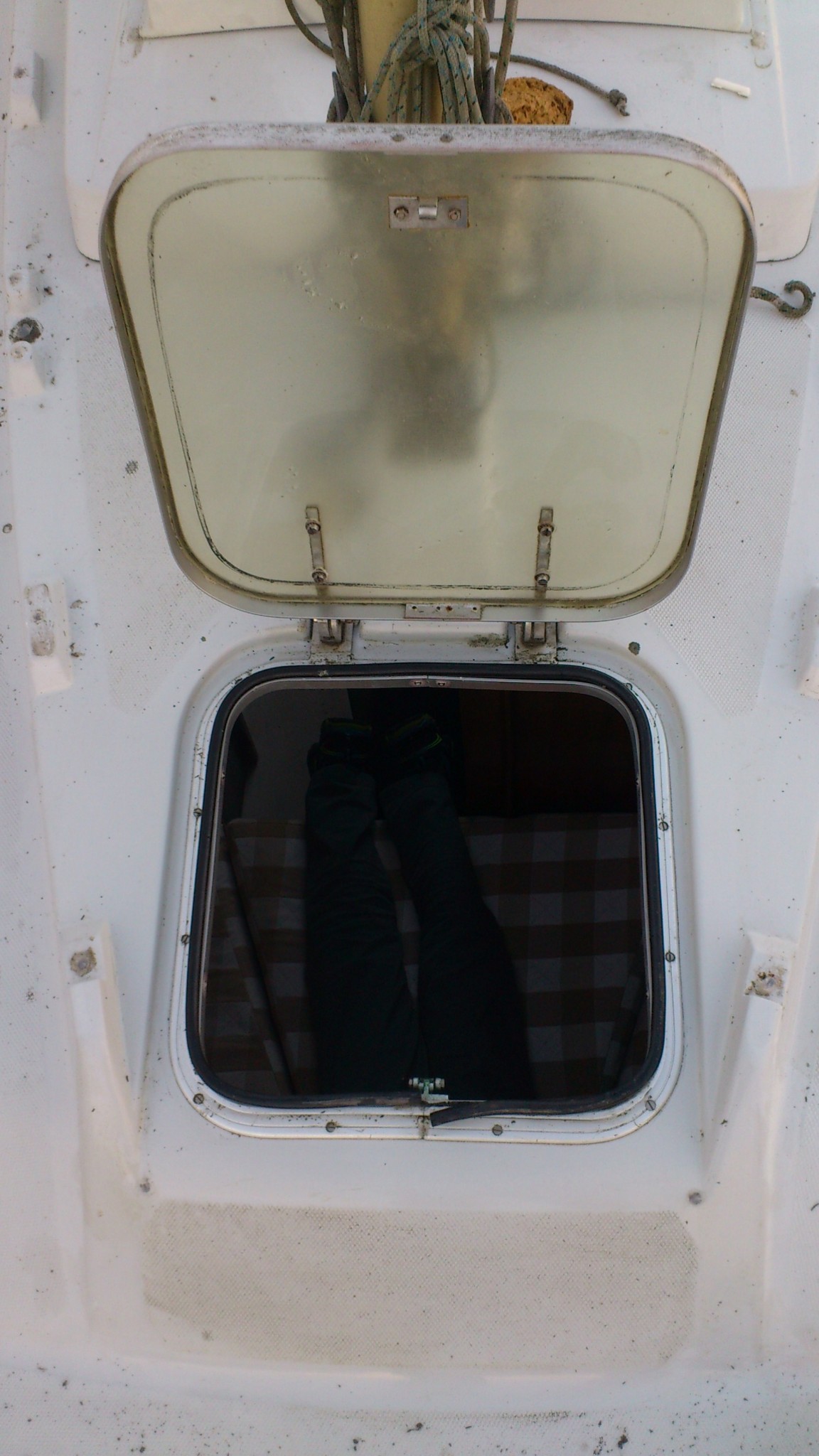 C’est aussi la première fois que je parviens à ouvrir le panneau de pont qui n’est décidément pas en bonne forme, le plexi est bien faïencé, le joint est cassant (et cassé) et pris entre deux cercles d’alu rivetés, je ne sais pas si je parviendrai à réparer ça aussi simplement.