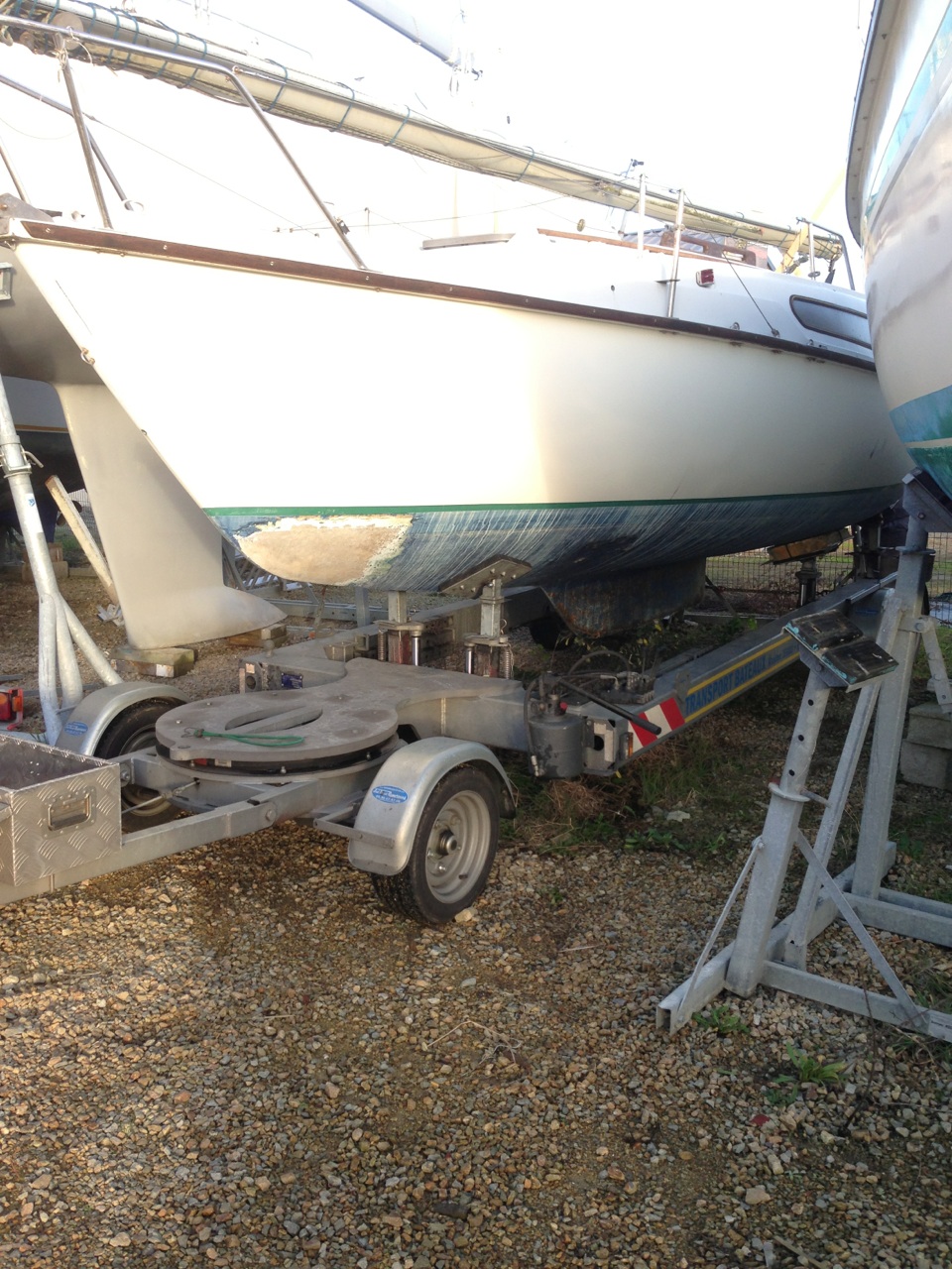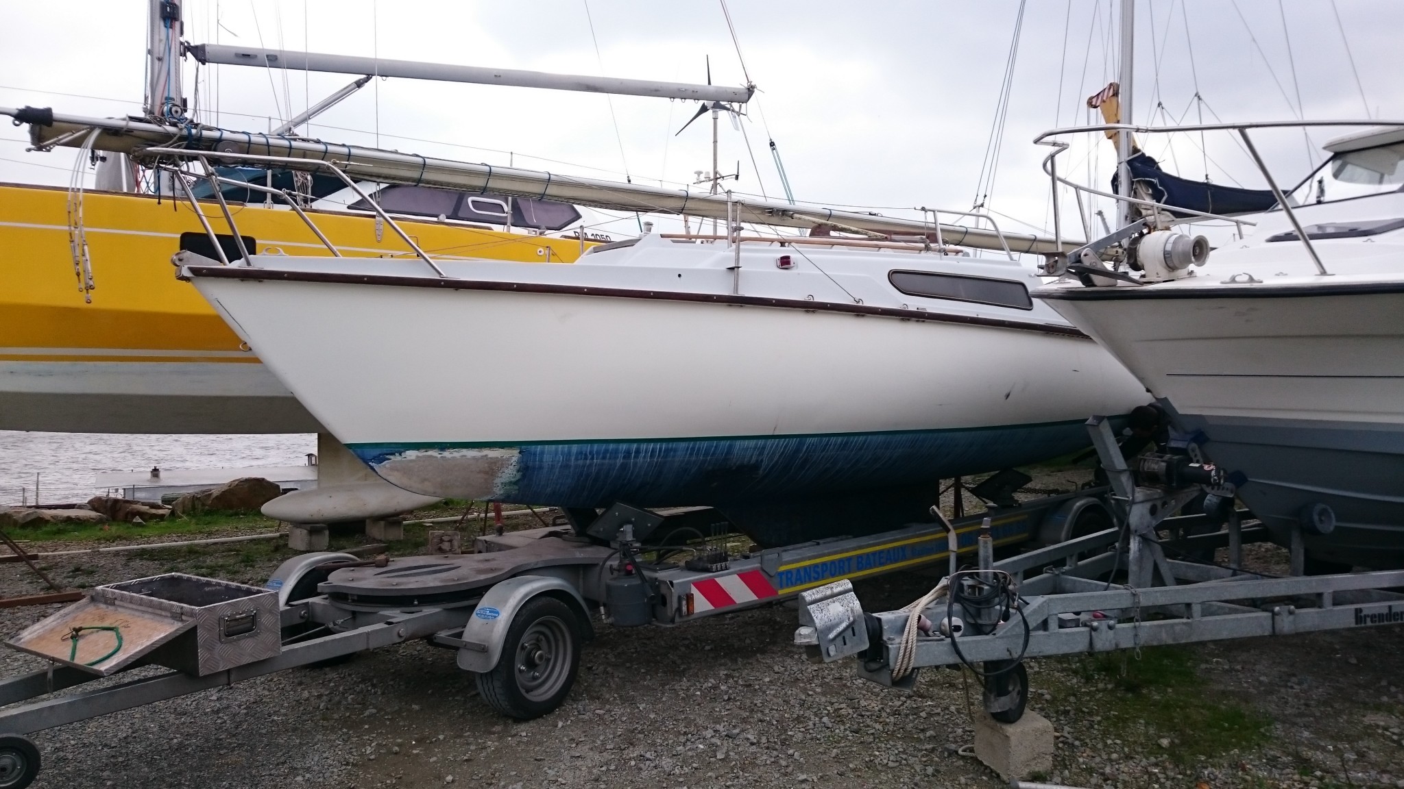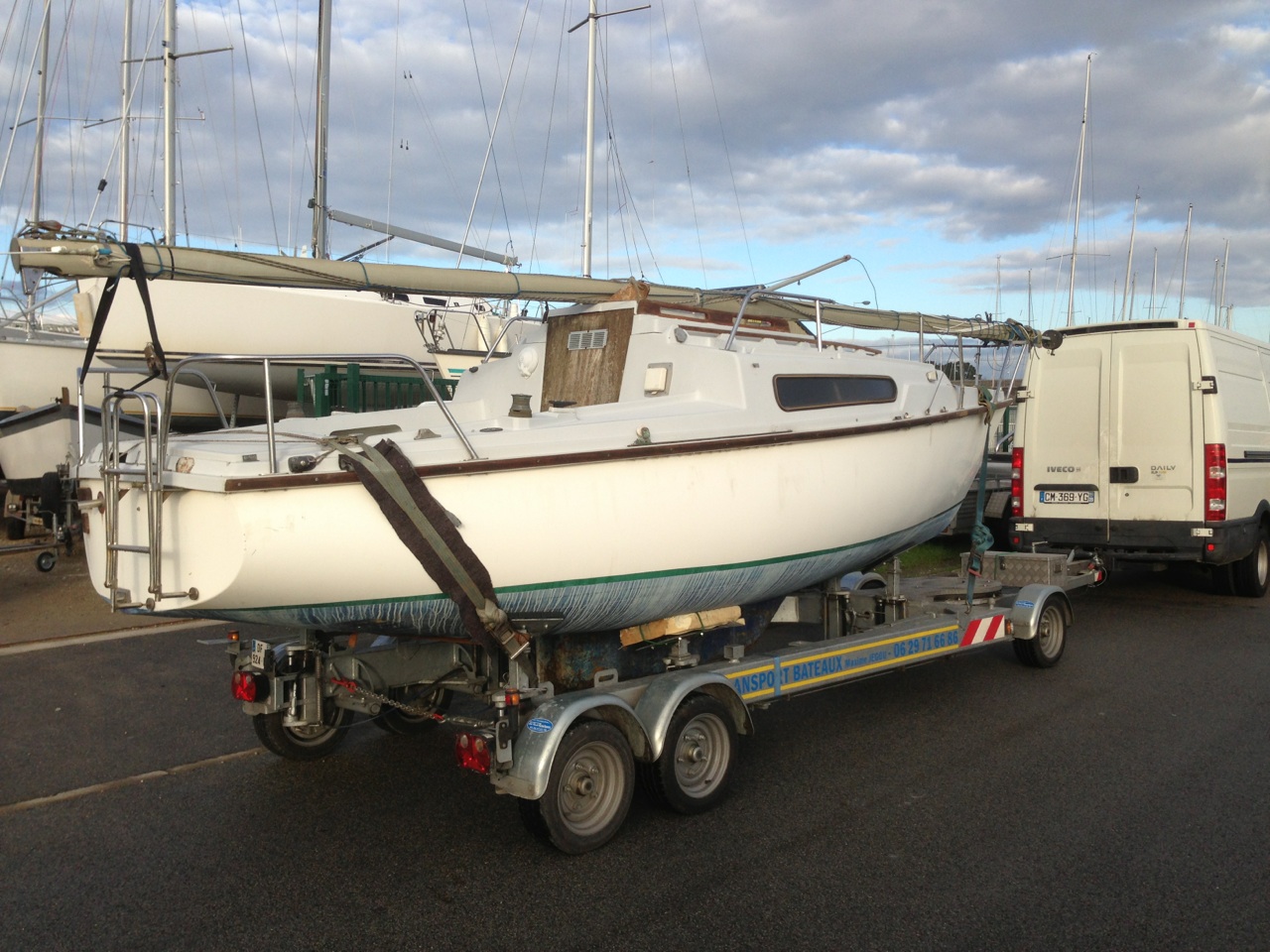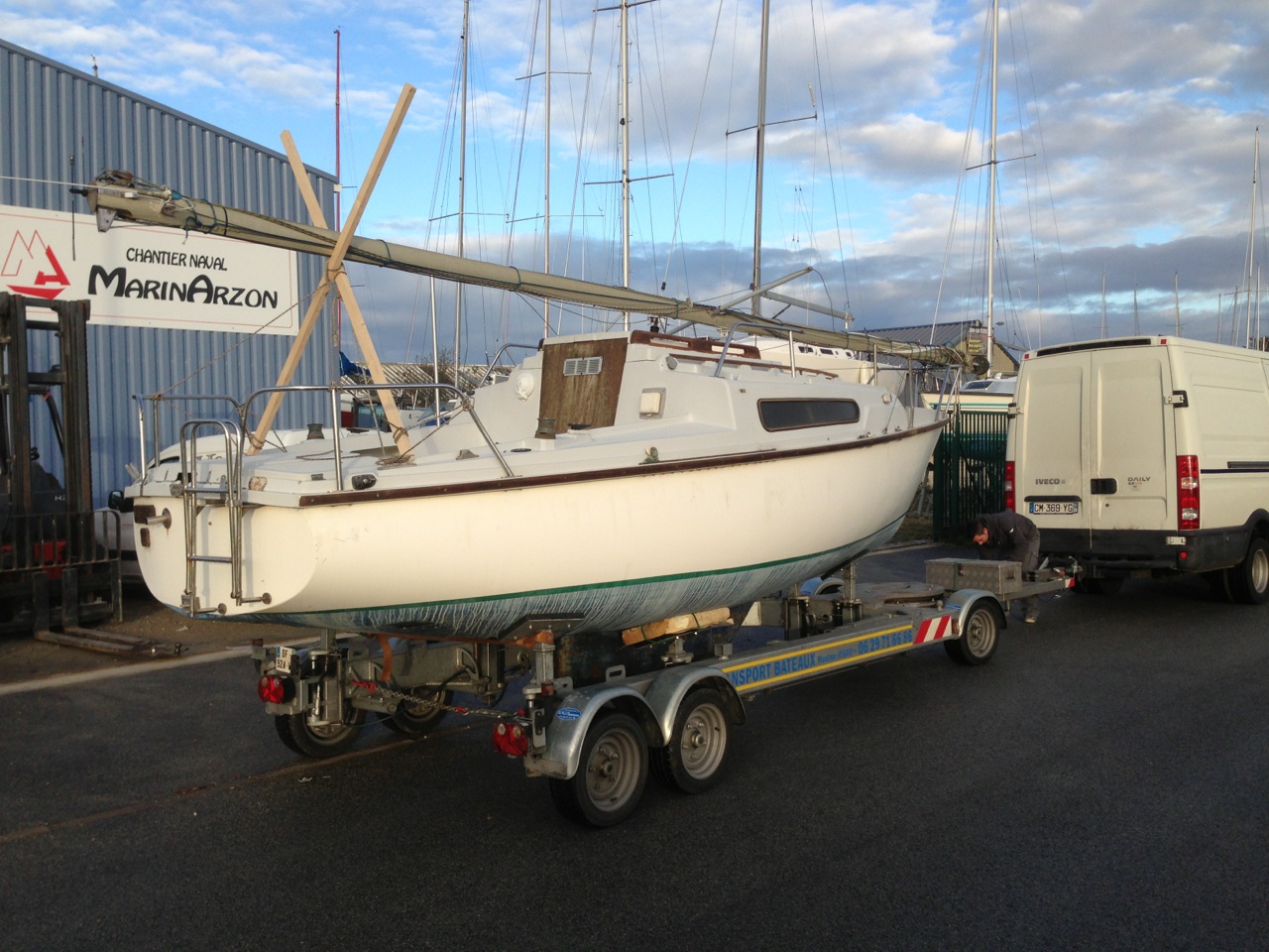 En ce qui nous concerne, c’est Pouldu Naval qui a réalisé ce transport, et on le recommande chaudement : d’abord Maxime est très cool, très actif, et ensuite il dispose d’une remorque rare : un ber routier qui nous aura fait économiser les frais de manutention sur le chantier de départ comme celui d’arrivé, en nous évitant l’usage d’une grue.