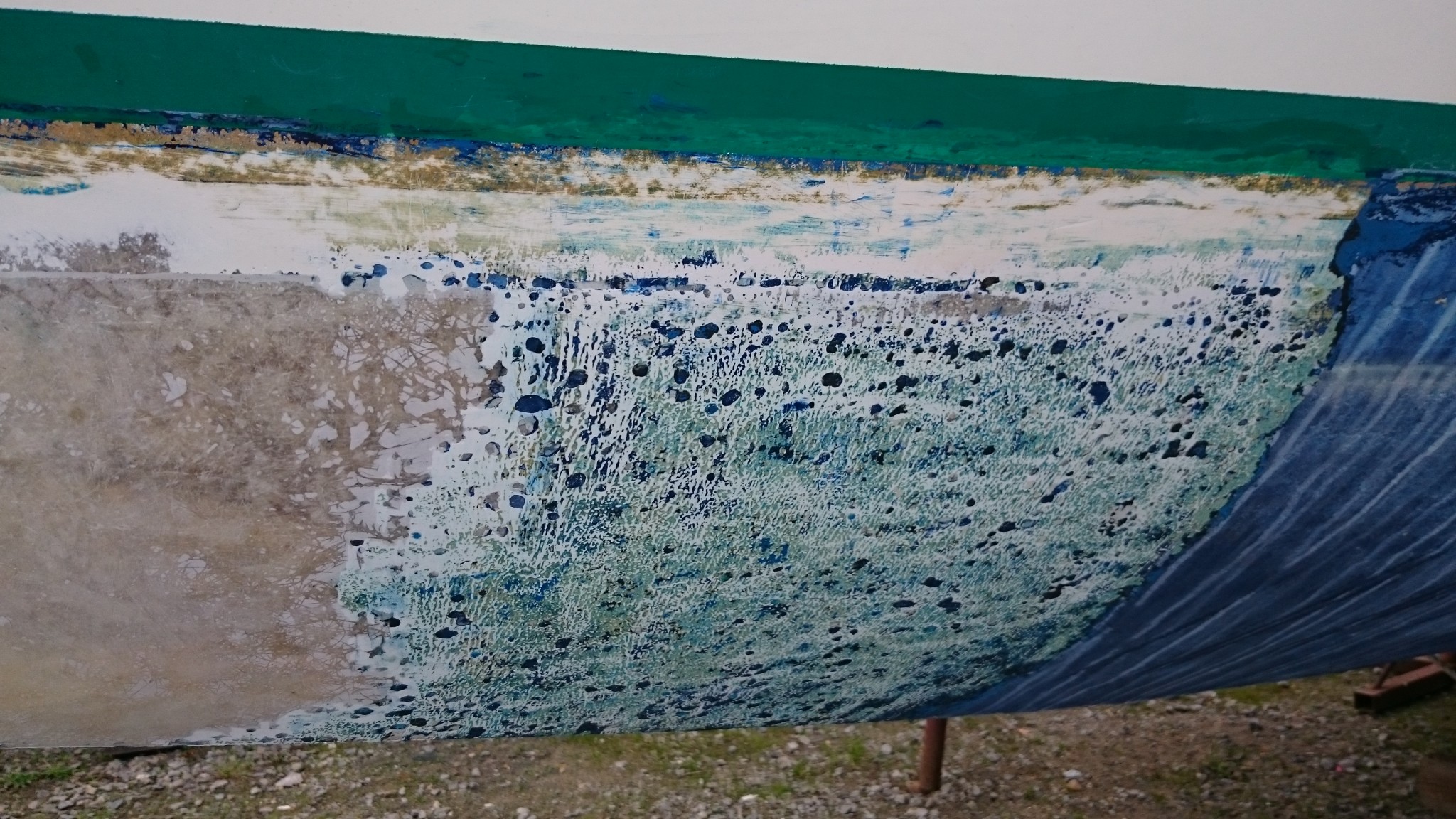 Sur le bateau aujourd’hui avec du décapant pour tester le grattage de l’antifouling, ça marche très bien, mais sous l’antifouling, on pourrait se prendre pour Neil Armstrong…