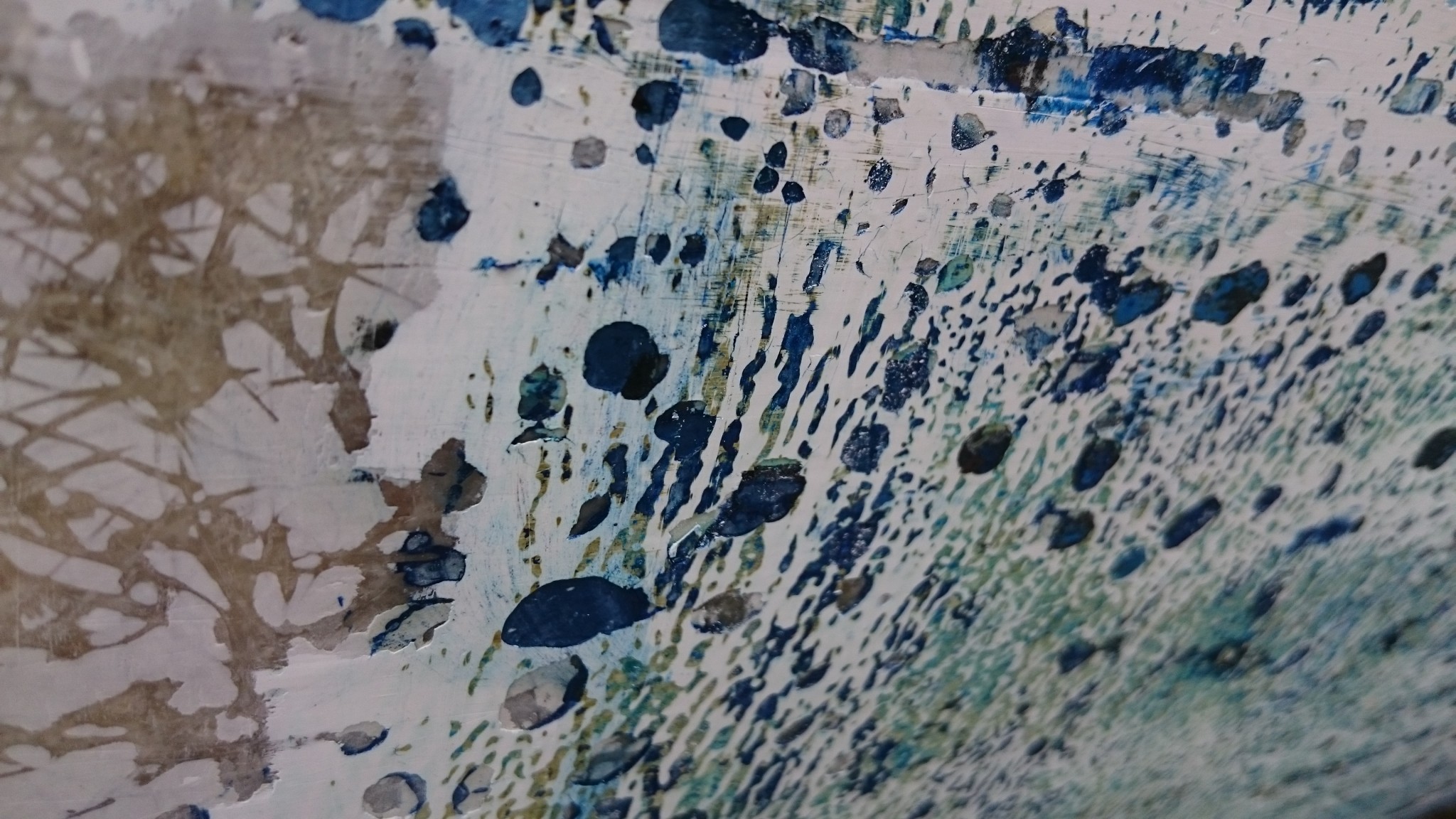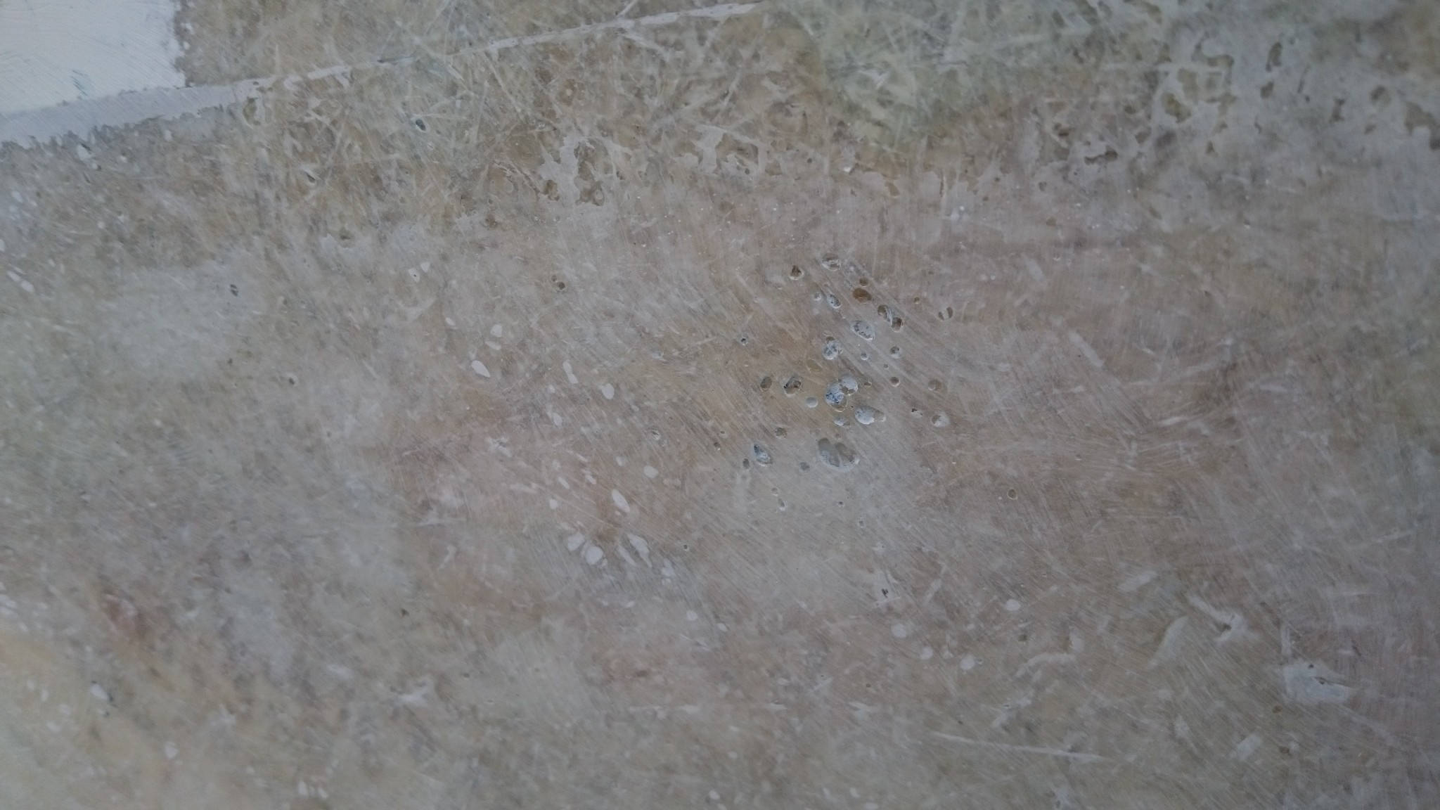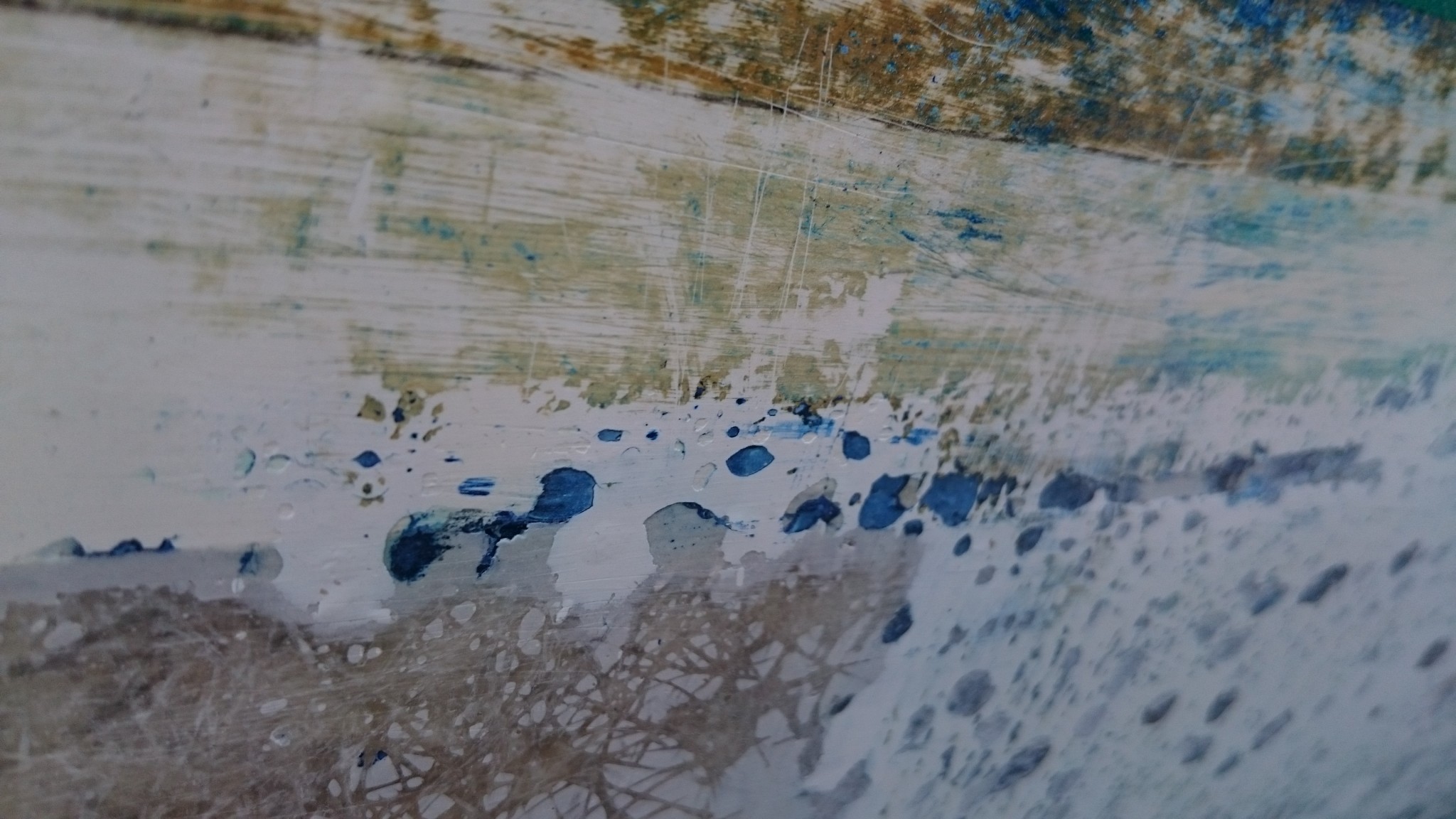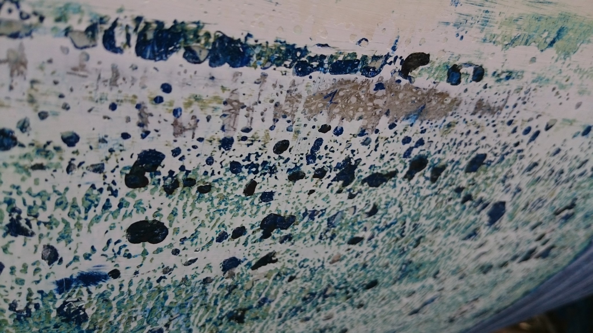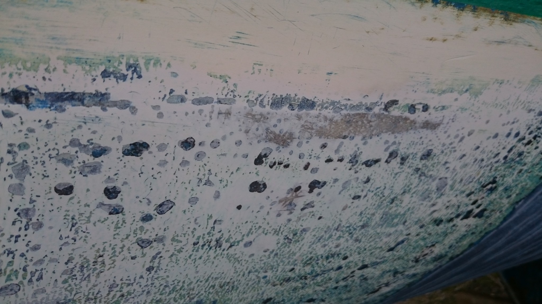 En grattant une autre bande, je retrouve une autre caractéristique de la surface sous l’antifouling : le gelcoat présente comme des coulures. Ca peut vouloir dire quoi ? Est-ce vraiment des coulures ou bien une dégradation normale de ce type de surface ? Est-ce que ça pourrait dire que le gelcoat a été enlevé à un moment, puis reposé mais pas totalement dans les règles de l’art ? C’est l’impression que ça me donne : le gelcoat semble bien plus épais au dessus dans l’ancienne ligne de flottaison (du moins ce que j’ai identifié comme tel). Serait-il possible sinon qu’à force de poser/retirer l’antifouling, le gelcoat se soit amincit ?