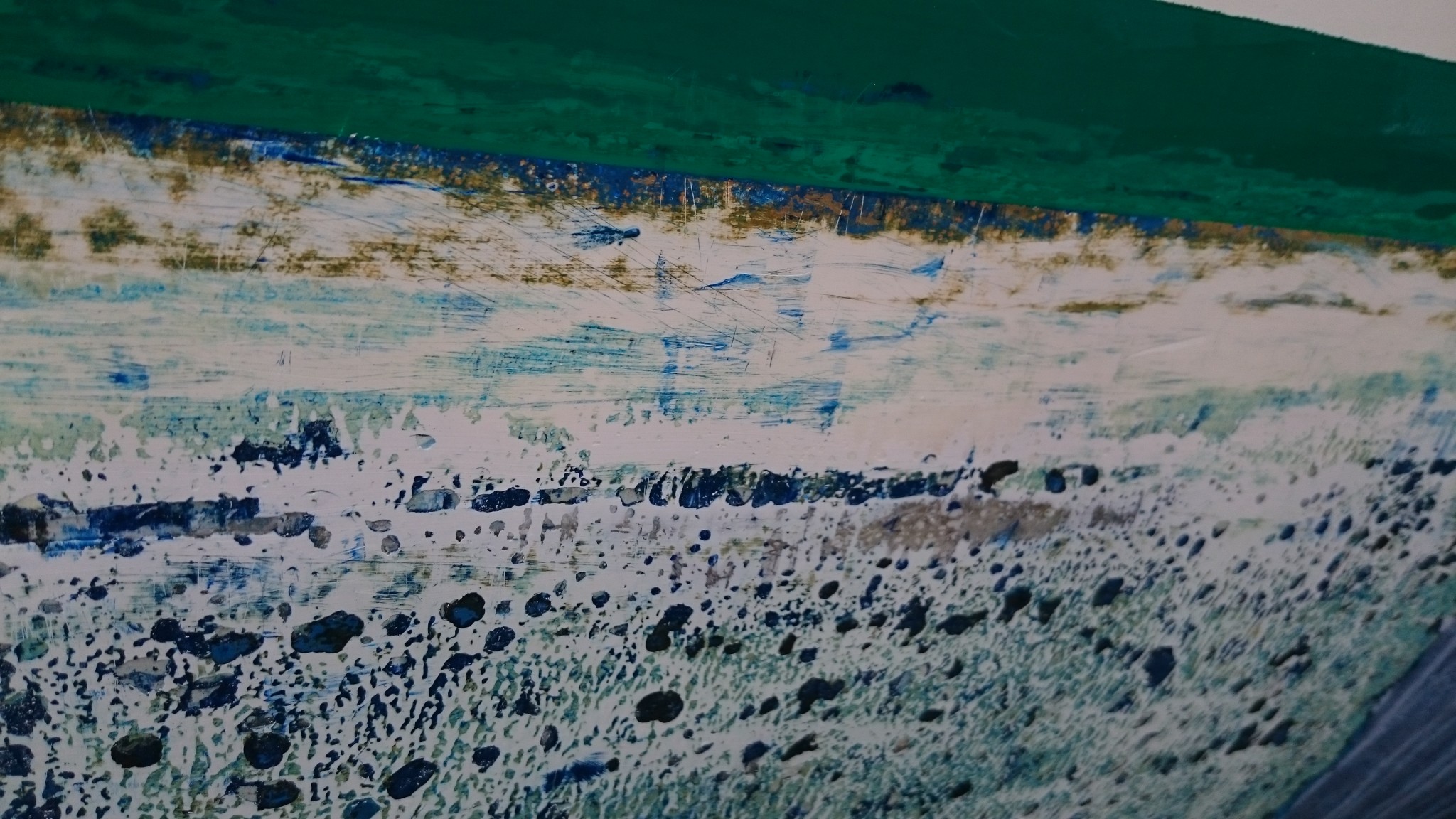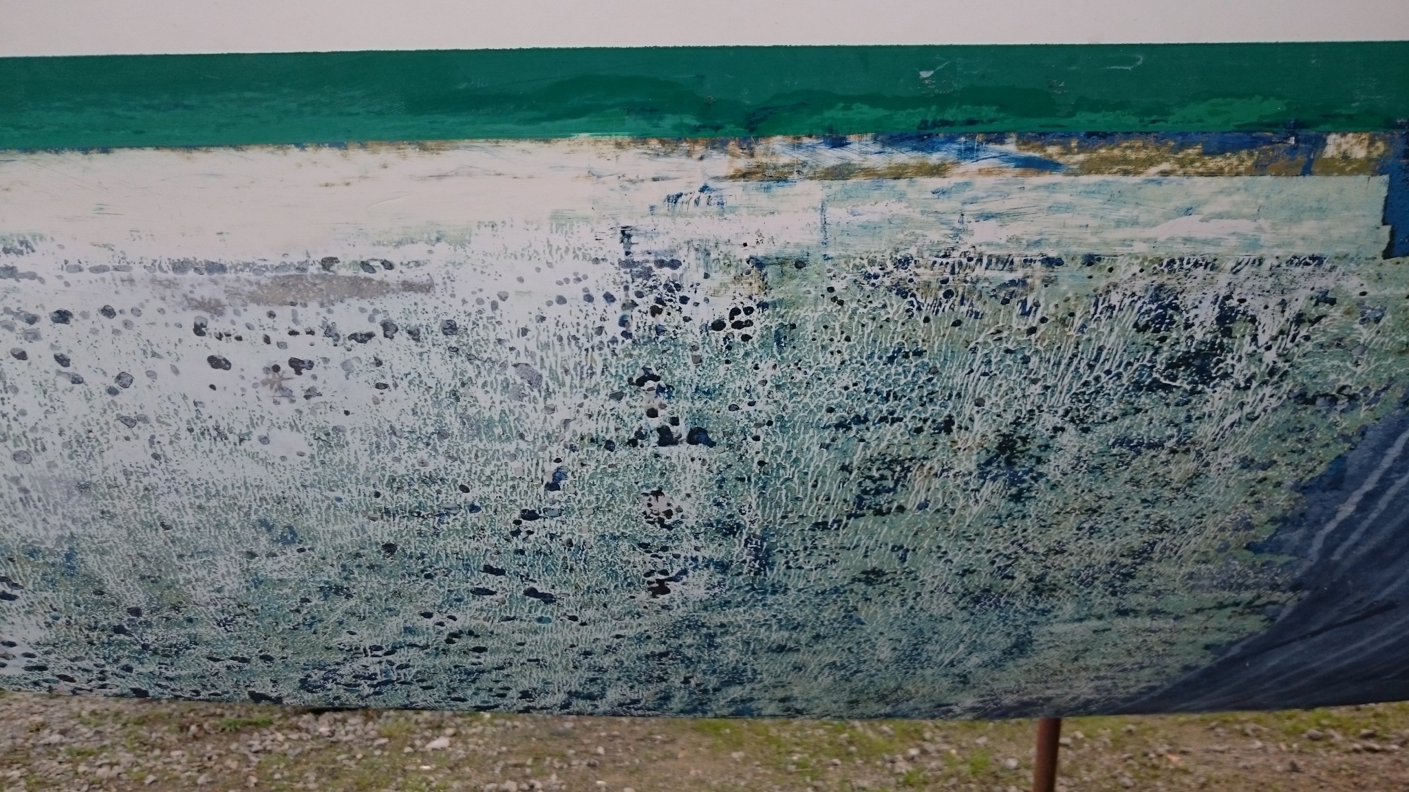 En aparté sur la photo précédente : Visiblement la ligne de flottaison a été remontée, on voit sur toute la longueur une bande très marquée, au dessus de laquelle une autre bande un peu marron, et encore au dessus l’actuelle ligne de flottaison verte. Se pourrait-il que la ligne marron ait été de la végétation vaguement grattée puis recouverte d’antifouling ou alors une bande adhésive qui aurait laissé de la colle ? edit : à bien regarder, je pencherais plutôt pour cette seconde option, on peut voir une sorte de trame, et ça fait sens de se dire qu’il y a eu un jour du masque pour peindre la ligne de flottaison verte.