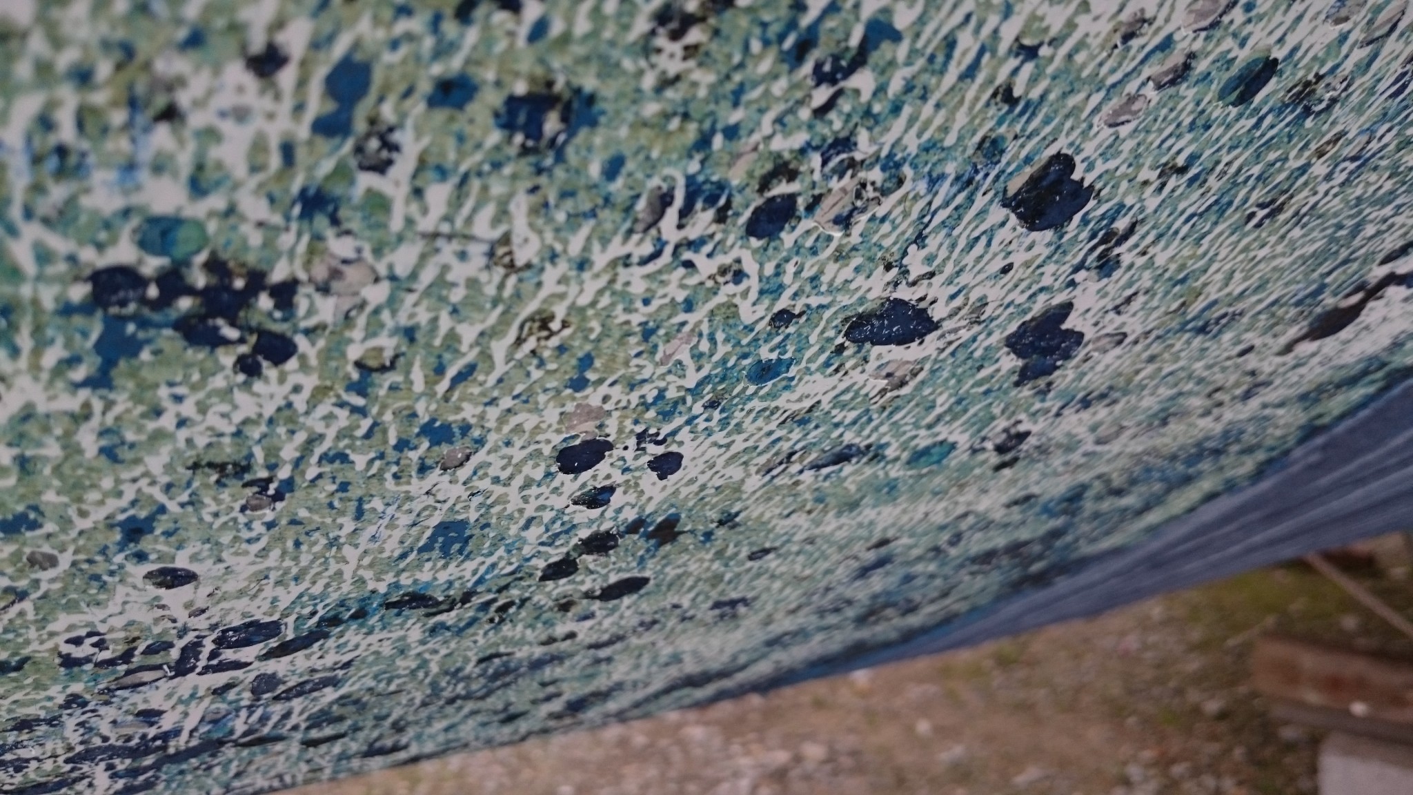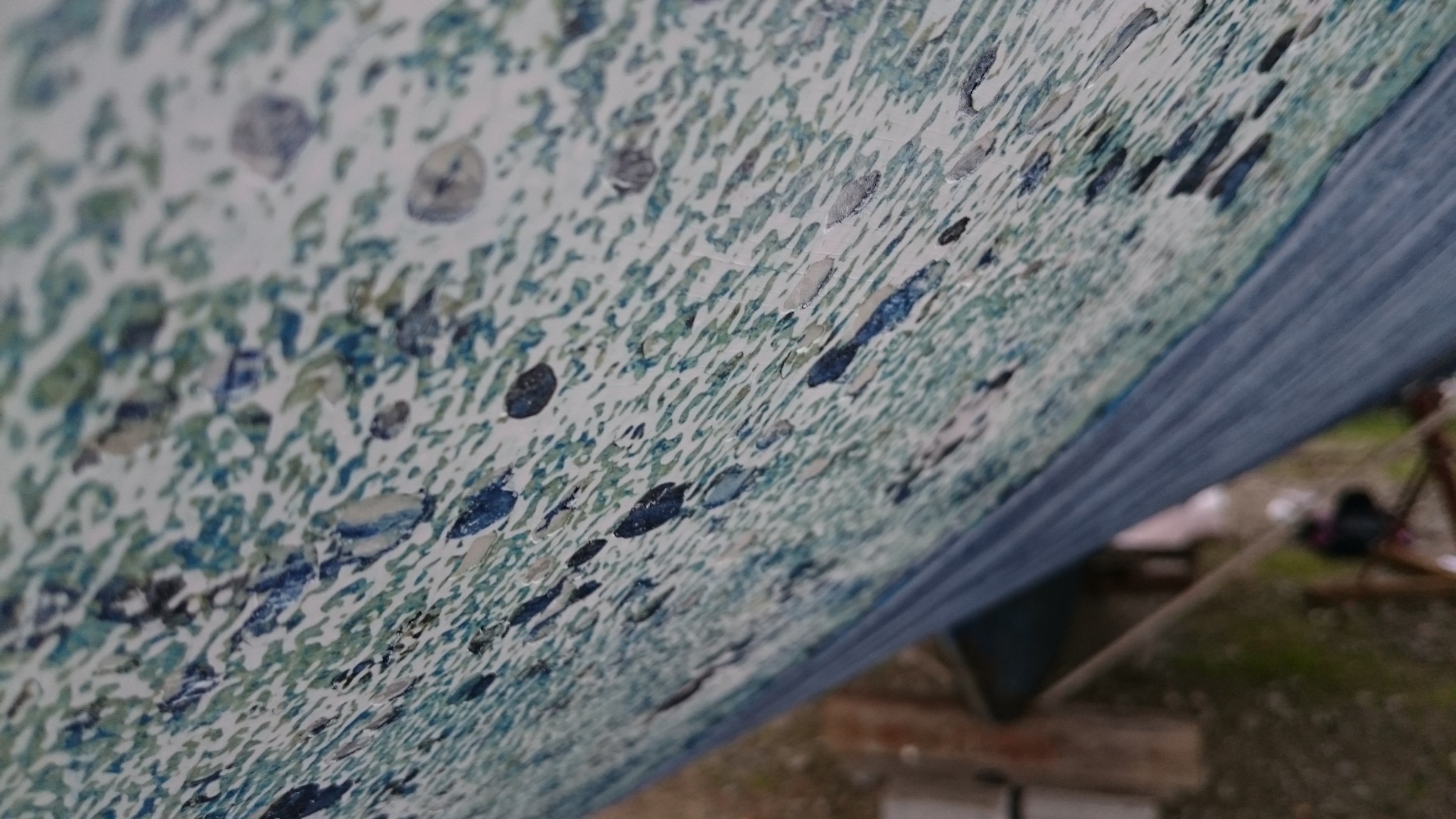 Voyant ça, je voulais m’assurer que le gelcoat était bien criblé de trous, et qu’il ne s’agissait pas de pastilles d’antifouling plus résistantes que les autres, visuellement, il semble bien que les pastilles bleues sont « en creux », mais j’ai poncé légèrement au 240, ça éclaircit l’ensemble et ne laisse apparemment aucun doute : les restes d’antifouling sont bien dans des cavités du gelcoat. Gelcoat qui semble très fin, absent même par endroits.