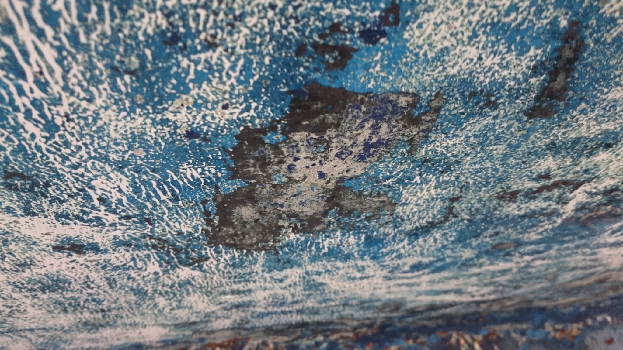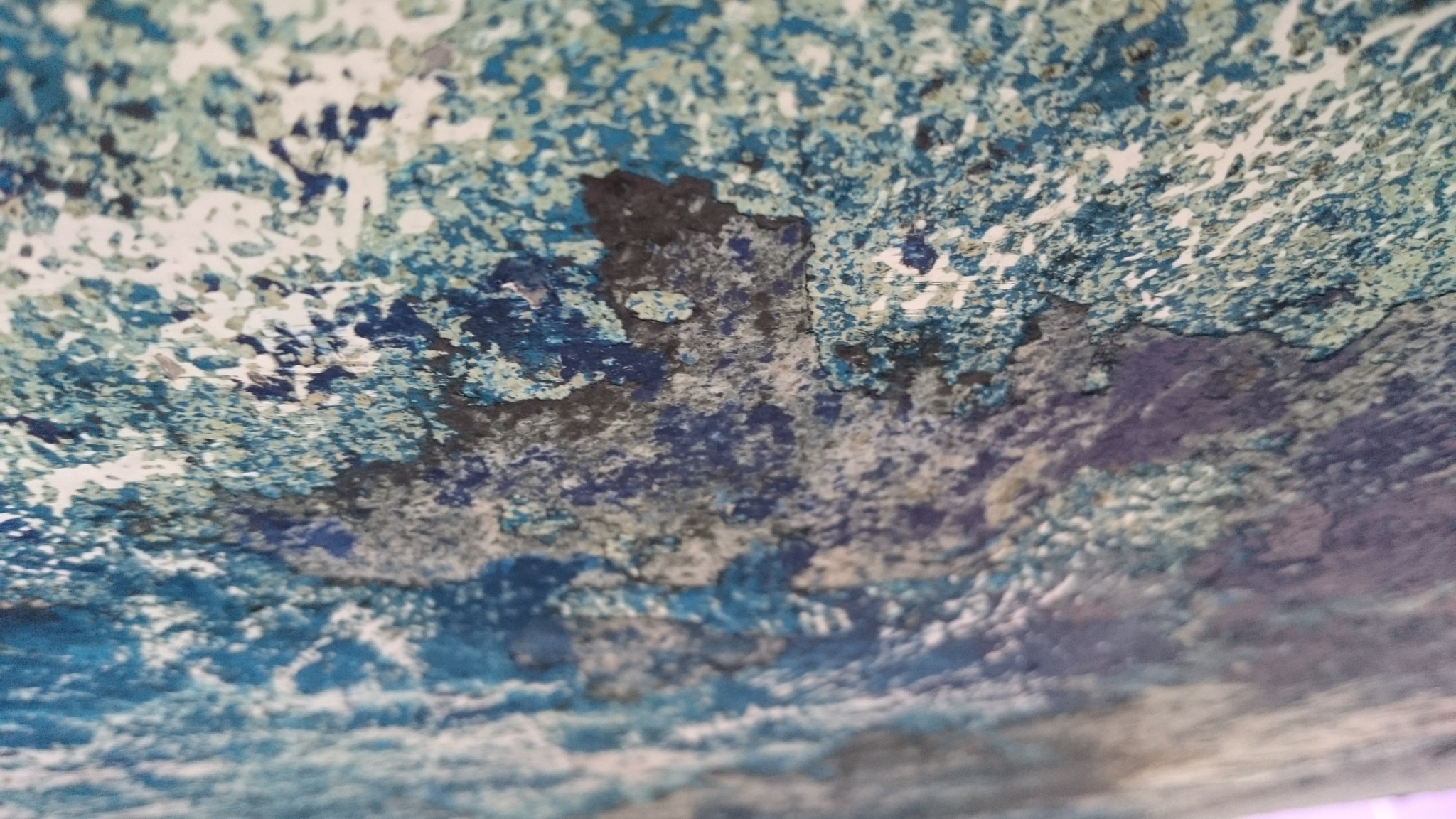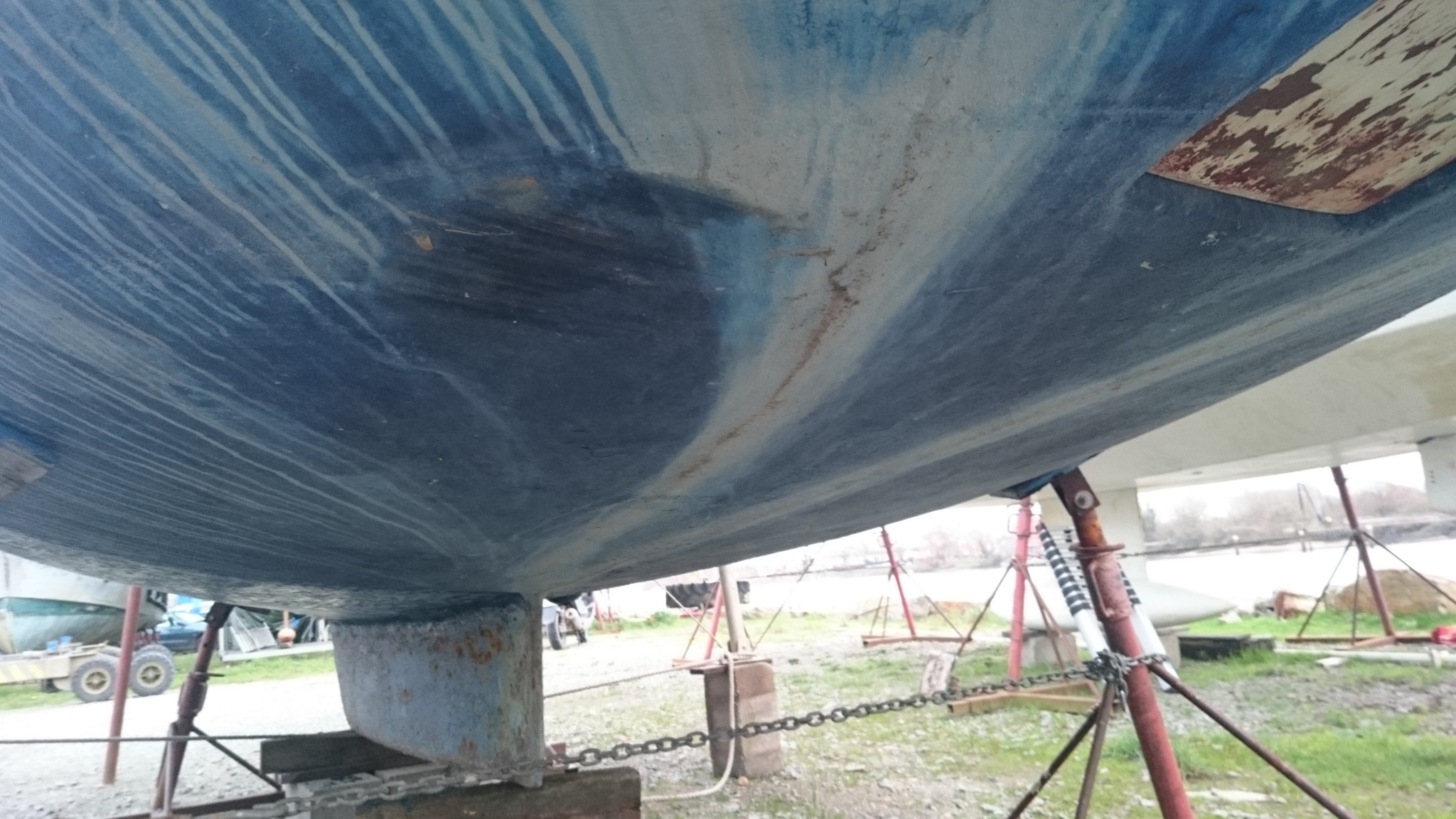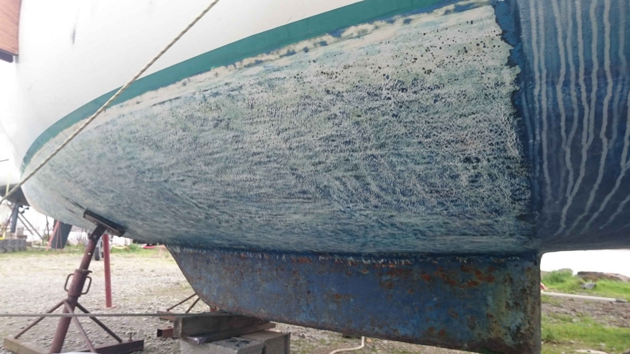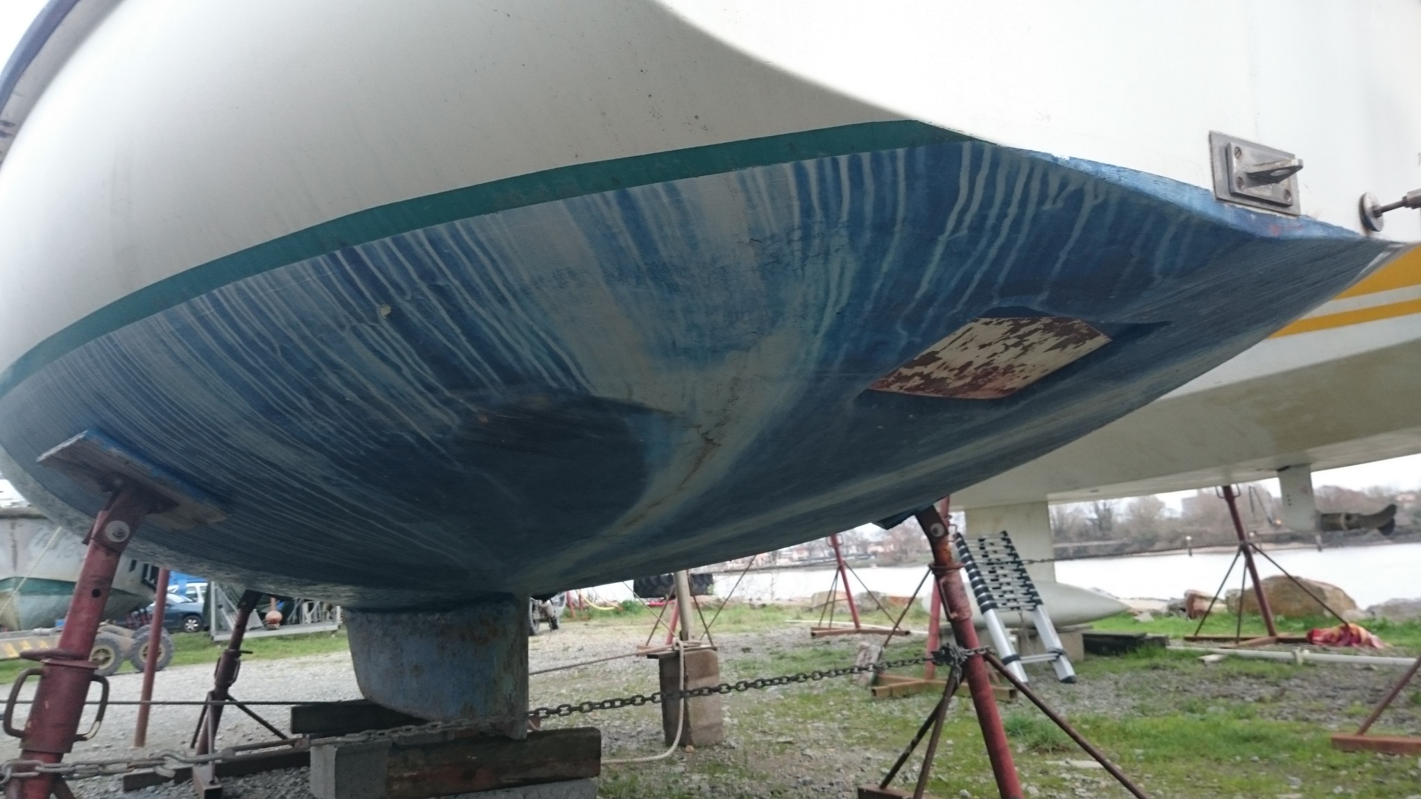 Depuis que je suis sous la coque aussi, je rencontre régulièrement des tâches grises qui s’effritent comme du sable, et assez difficiles à décoller. Çà me donne l’impression de plaques de vase qui auraient été recouvertes d’antifouling. À cet endroit ça fait sens, et j’ai parfois l’impression d’être dans la peau d’un archéologue qui découvre couche après couche l’histoire du bateau.