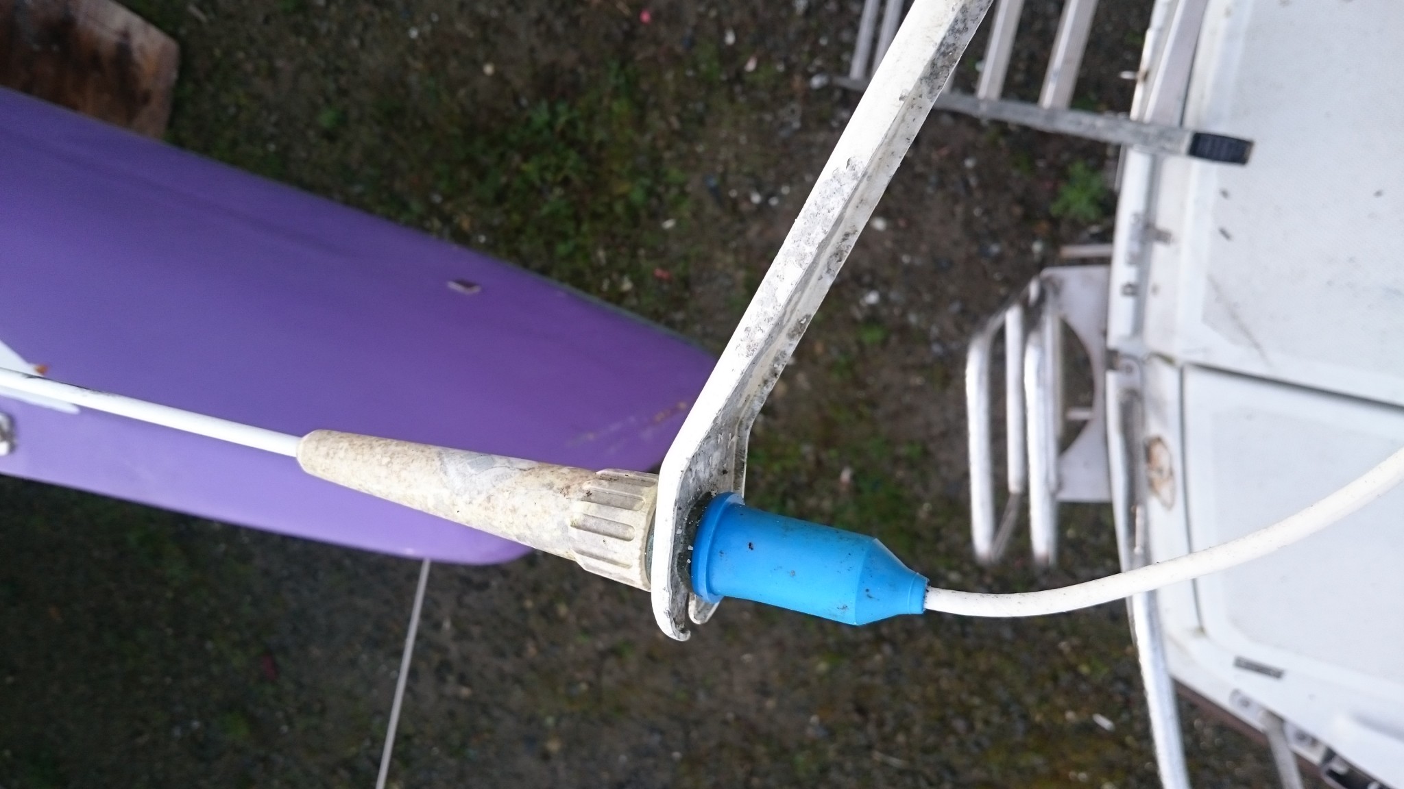 Première étape : nettoyer le mât de ses mousses : brosse, brosse à dent, gants mappa tous neufs et eau chaude. Rien de bien sorcier. Première étape bis : présenter la nouvelle girouette qui viendra en lieu et place de l’ancienne qui s’était prise pour une hélice d’avion et avait mal tourné (tout en blague aujourd’hui). Pour éviter le même sort à la nouvelle, j’ai décidé de ne la fixer qu’au dernier moment.