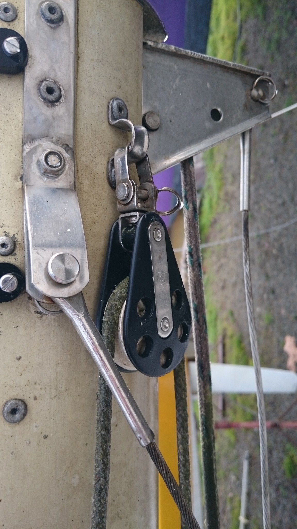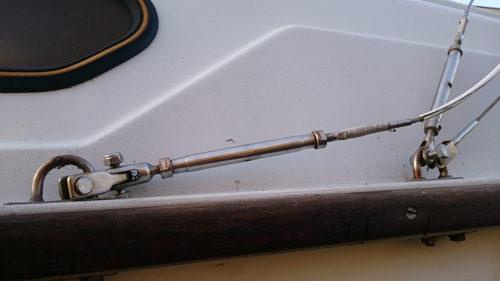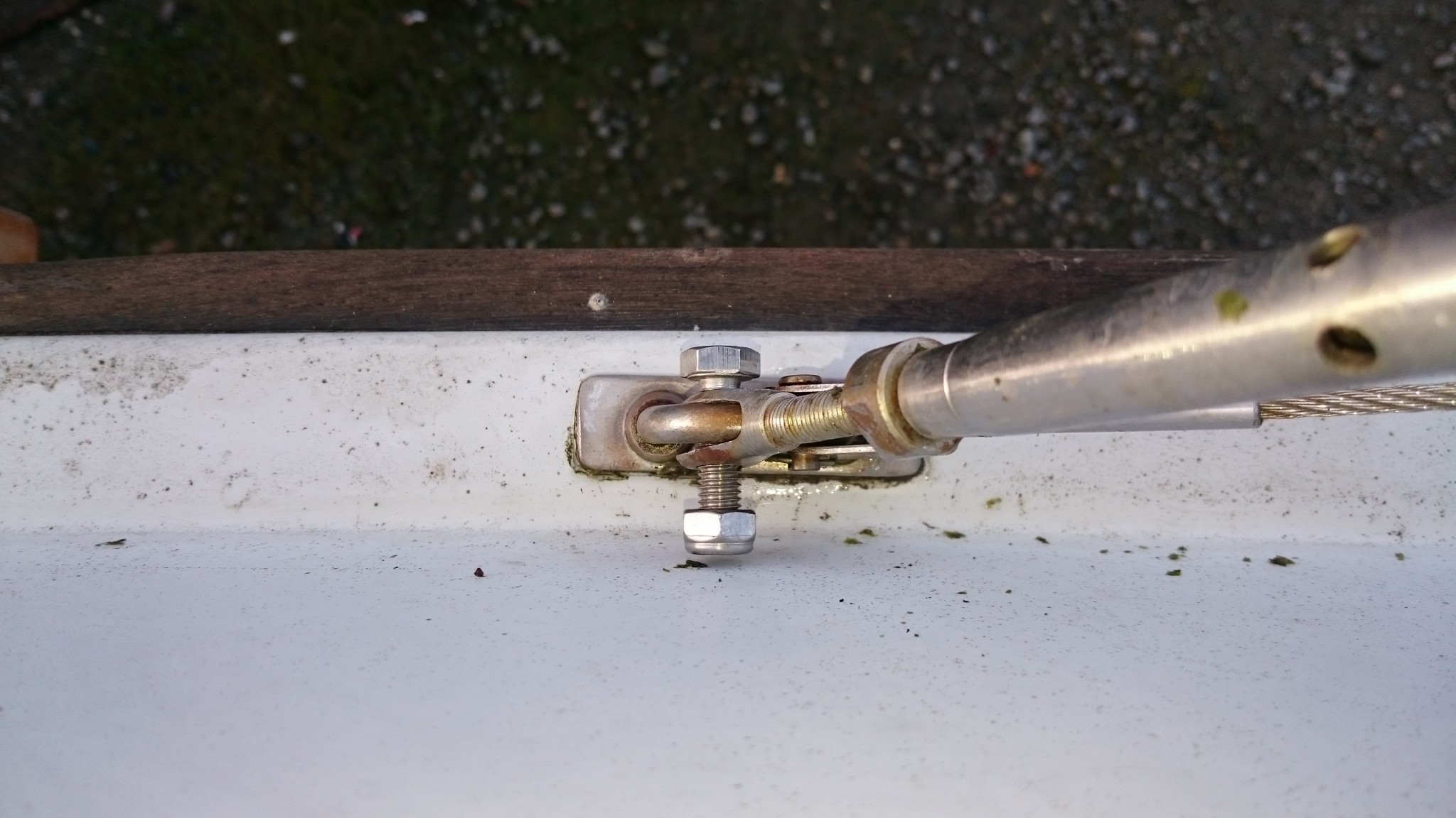 La seconde étape consistait à s’assurer que dimanche, on pourra remâter sans soucis. Bien, allons y avec méthode, je présente le hauban babord à la cadène qui doit l’accueillir. Et là : deux Mamans, mais pas de Papa (quelle époque !). Mince, zut, où ai-je mis le machin à goupille qui permet d’associer les deux…