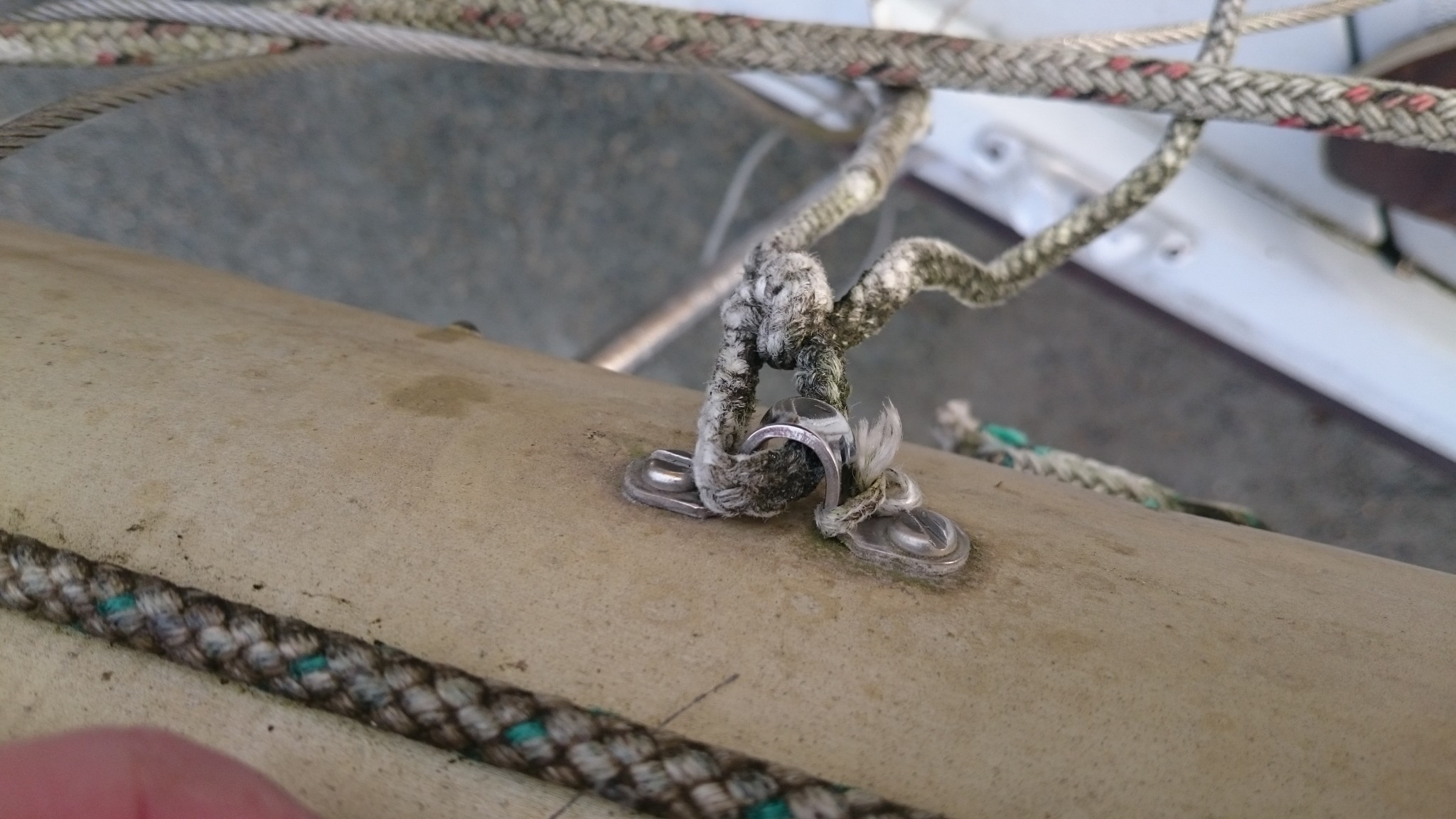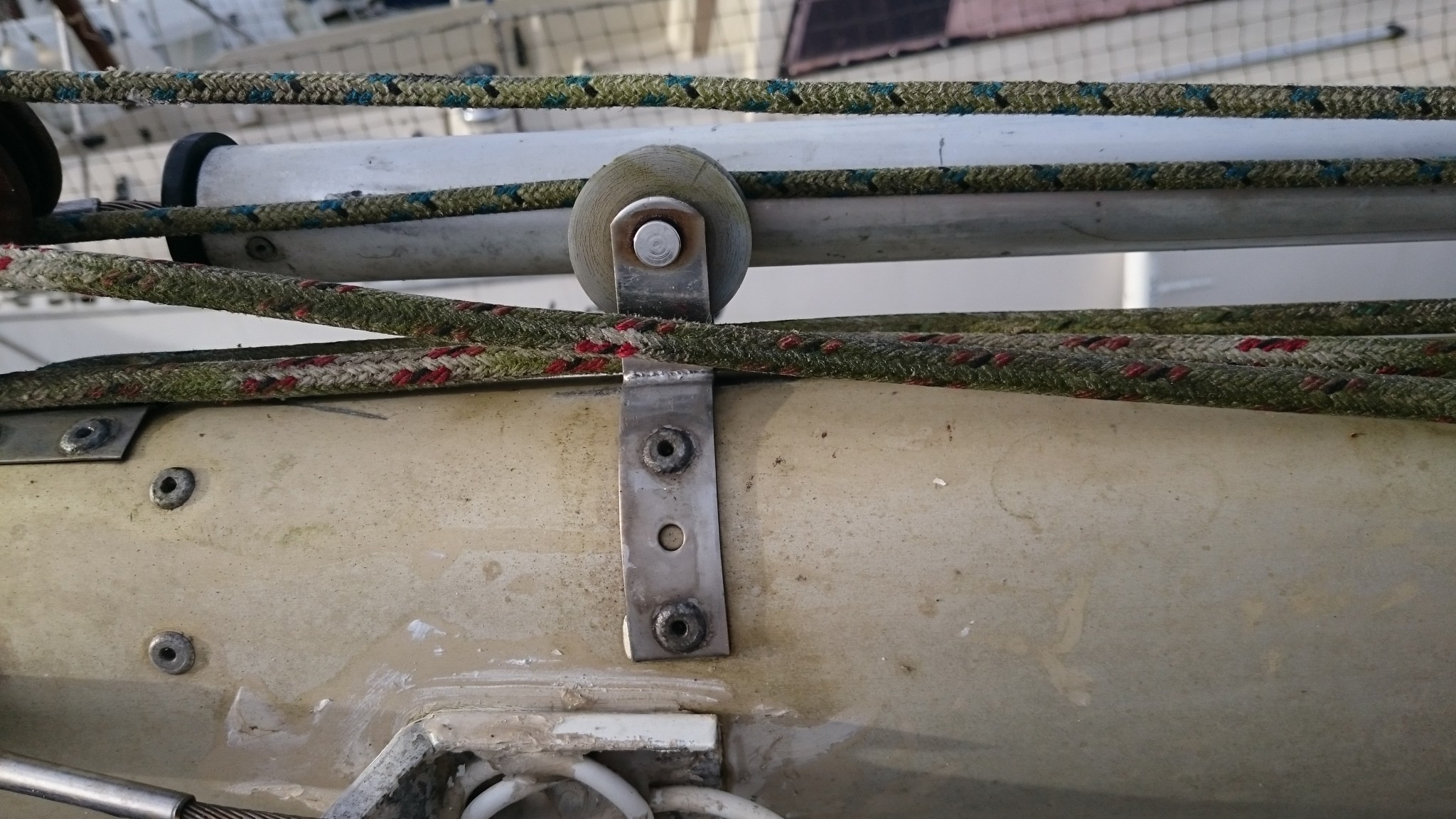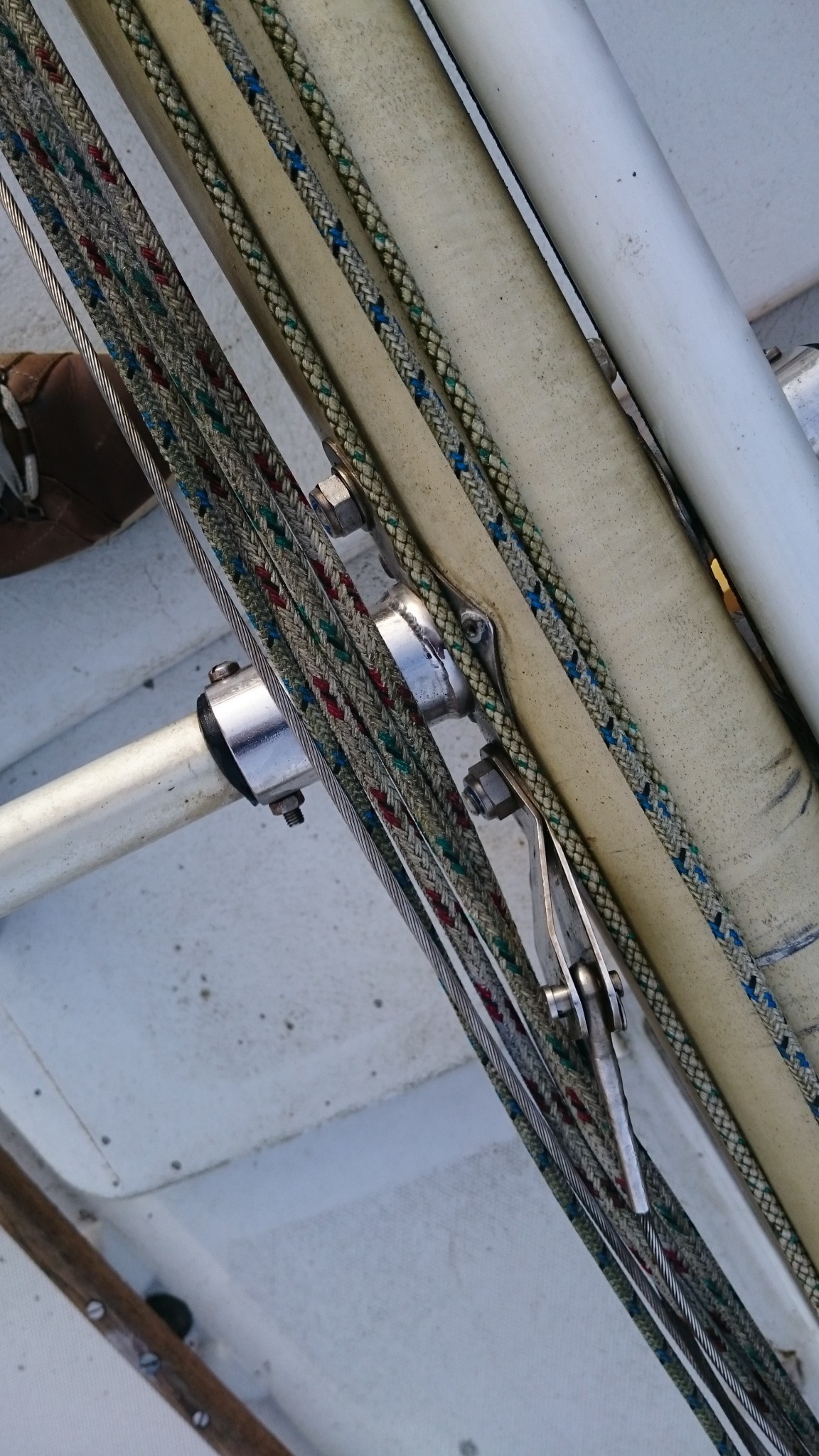 Ca peut se commander (en quantité industrielles), mais on serait de toutes façons hors délais. La solution de rechange qui me fut proposée fut de remplacer ces goupilles par des boulons. Nouvel aller-retour sur le bateau pour en estimer la taille, et cette solution temporaire marche super. Du temporaire qui durera peut-être (même si ce soir je trouve dans tous les coins du web des goupilles percées qui portent aussi parfois le nom d’axe inox)… Et sitôt la solution trouvée, le soleil a fait son apparition.
