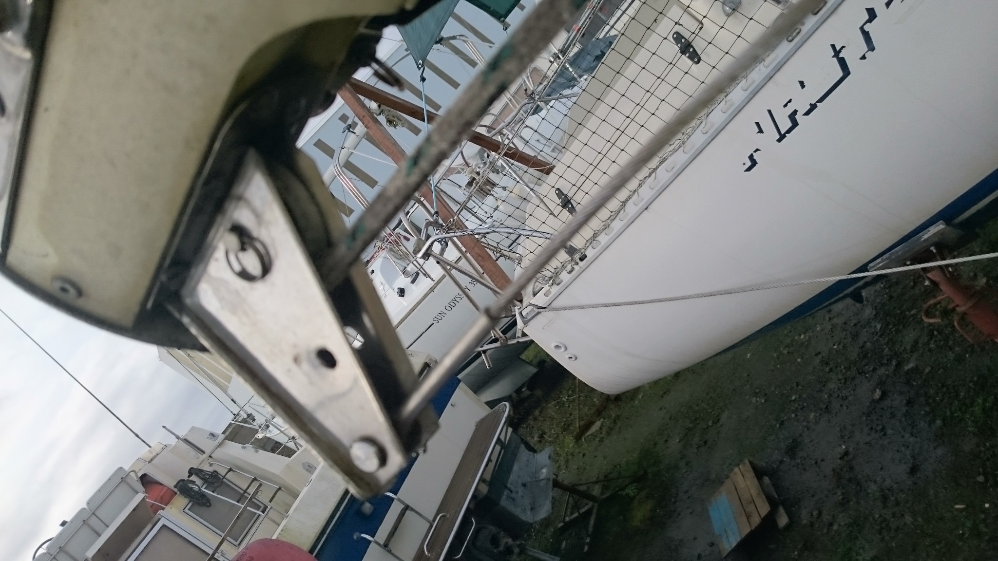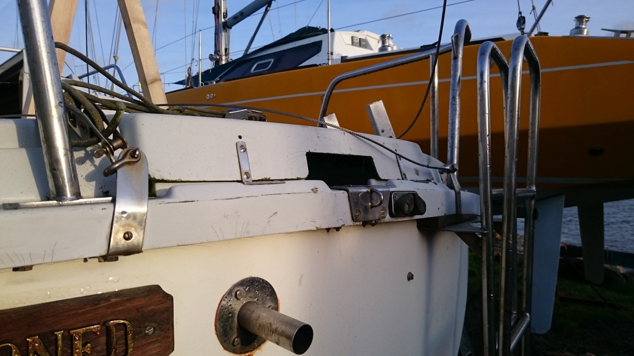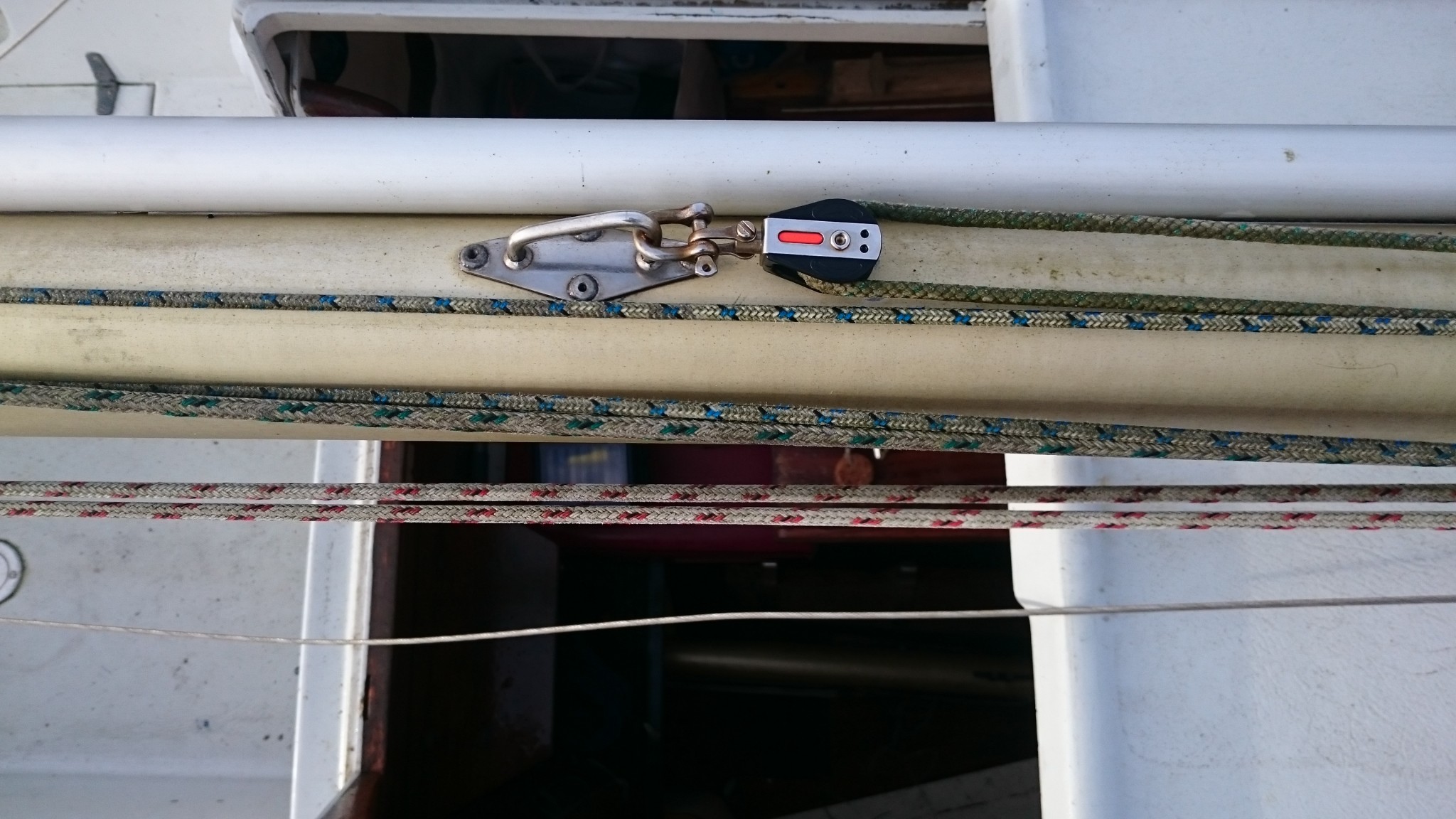 Ca peut se commander (en quantité industrielles), mais on serait de toutes façons hors délais. La solution de rechange qui me fut proposée fut de remplacer ces goupilles par des boulons. Nouvel aller-retour sur le bateau pour en estimer la taille, et cette solution temporaire marche super. Du temporaire qui durera peut-être (même si ce soir je trouve dans tous les coins du web des goupilles percées qui portent aussi parfois le nom d’axe inox)… Et sitôt la solution trouvée, le soleil a fait son apparition.