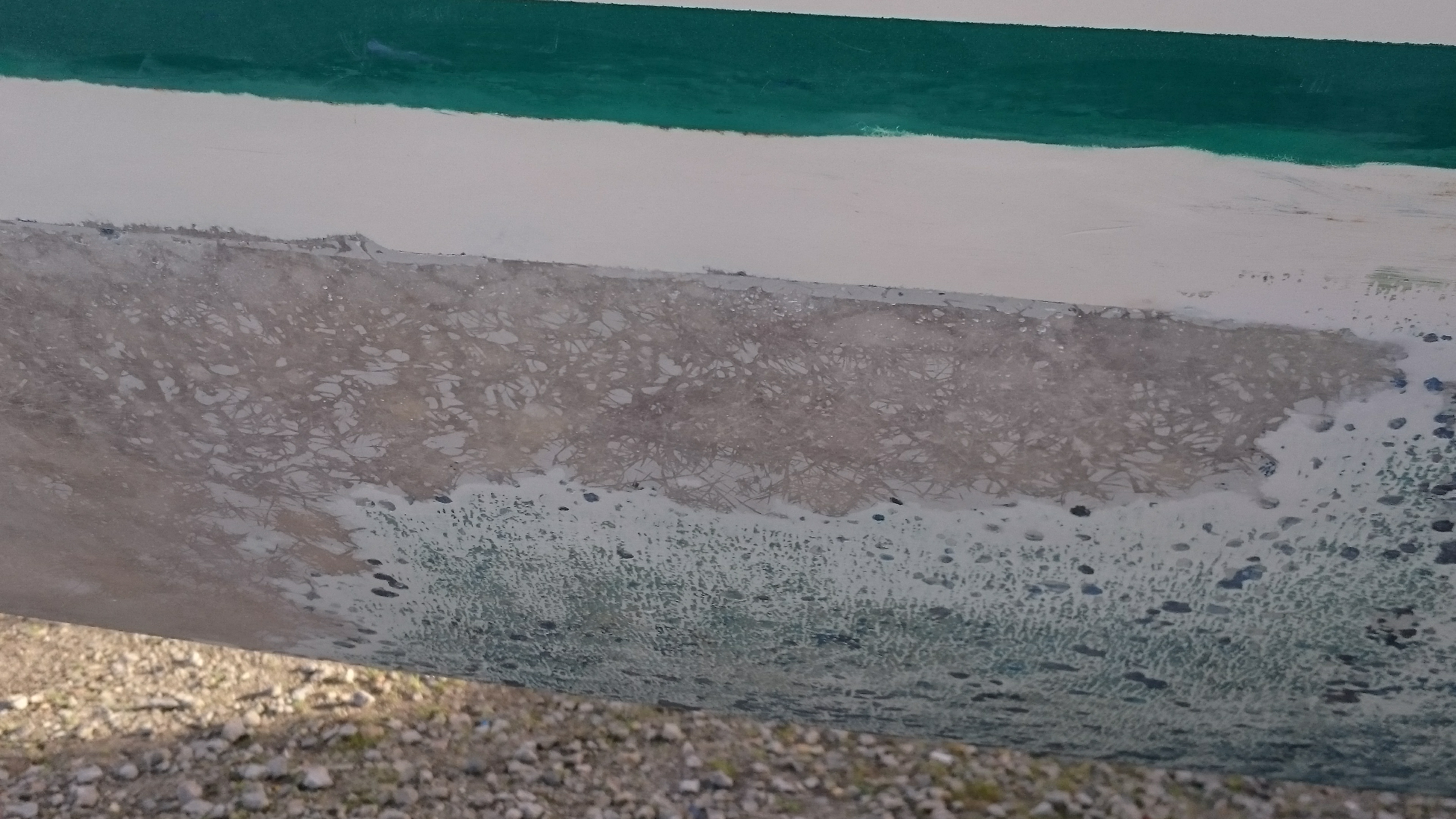 Alors qu’est-ce qui a pu se passer : j’avais remarqué que le côté babord était bien plus sale que le tribord, avec beaucoup plus de mousse. Visiblement le babord du bateau devait être plus à l’ombre que l’autre côté. Possible que l’antifouling de ce côté ait gardé plus d’humidité, d’élasticité et d’accroche au gelcoat. Le tribord était lui visiblement craquelé, rendant possible son grattage sans décapant ? Ou bien c’est tout simplement une question de coup de main.