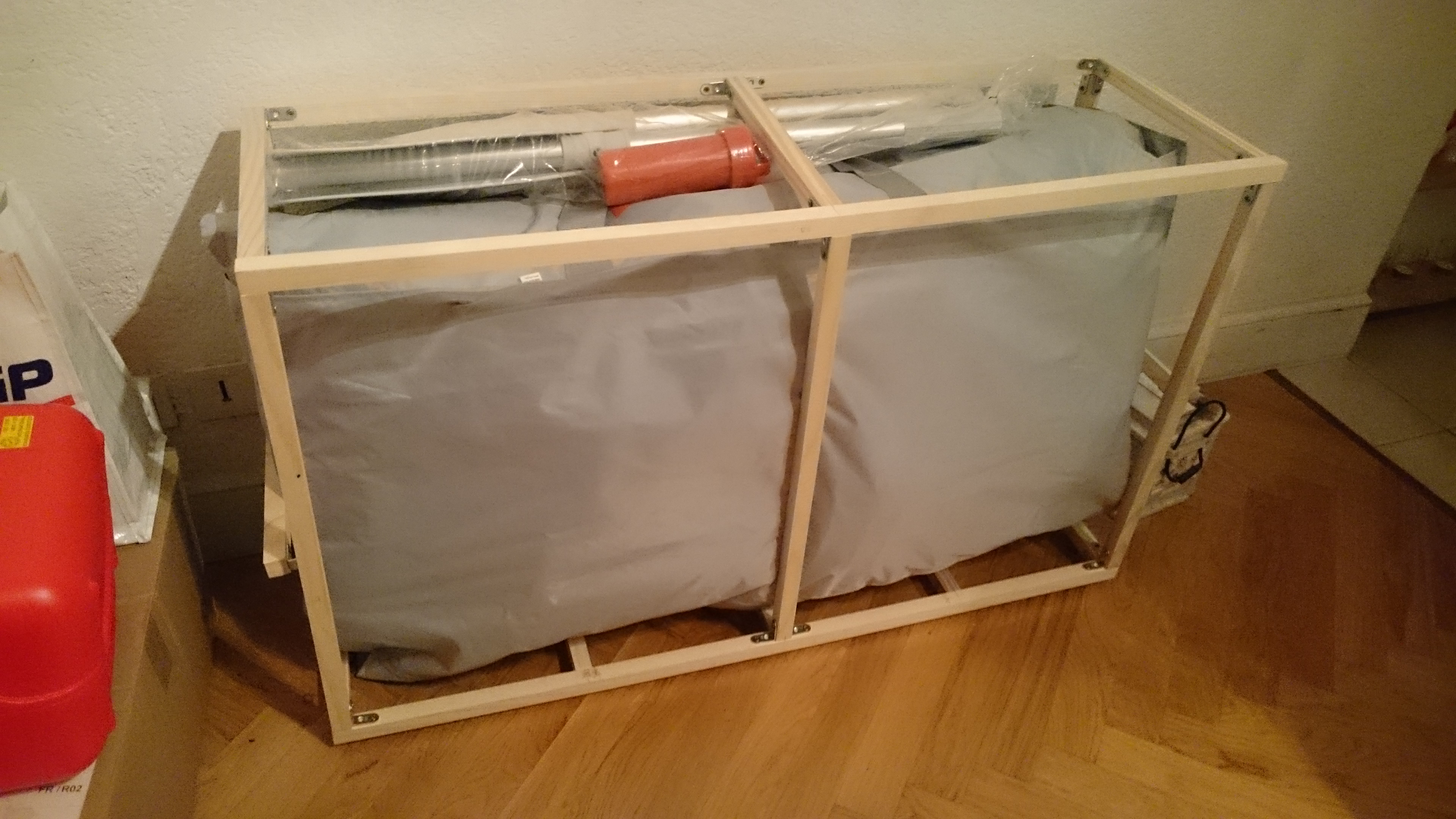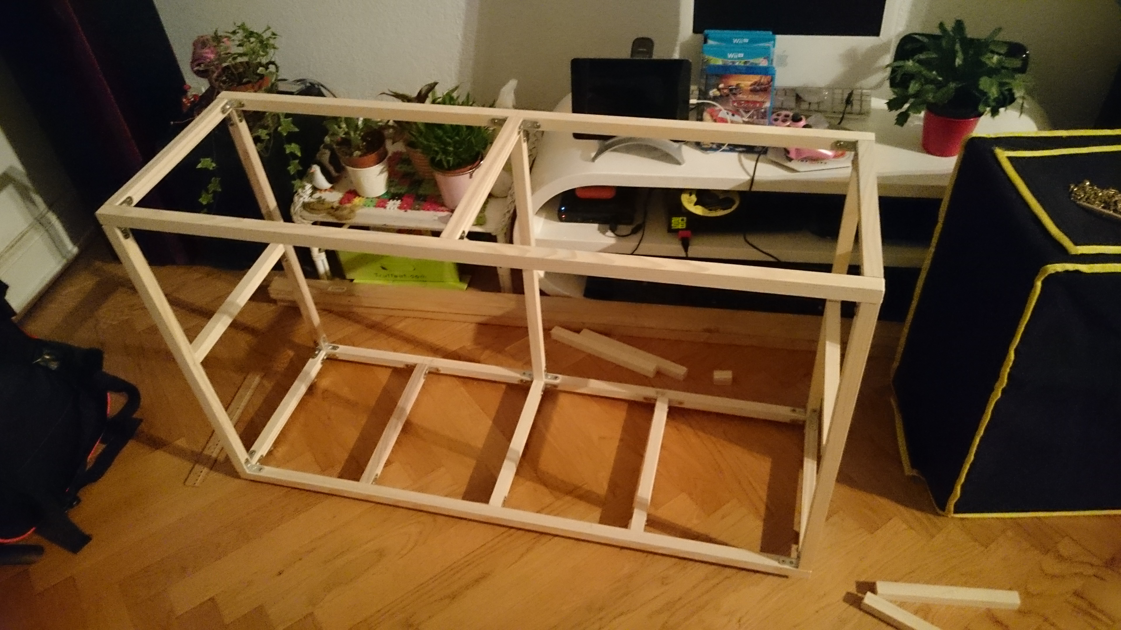 Et la veille au soir, atelier bricolage, j’ai pu commencer le meuble pour mon annexe, manque encore bien des pièces à cette construction, mais déjà, ça tient debout et les dimensions sont bonnes.