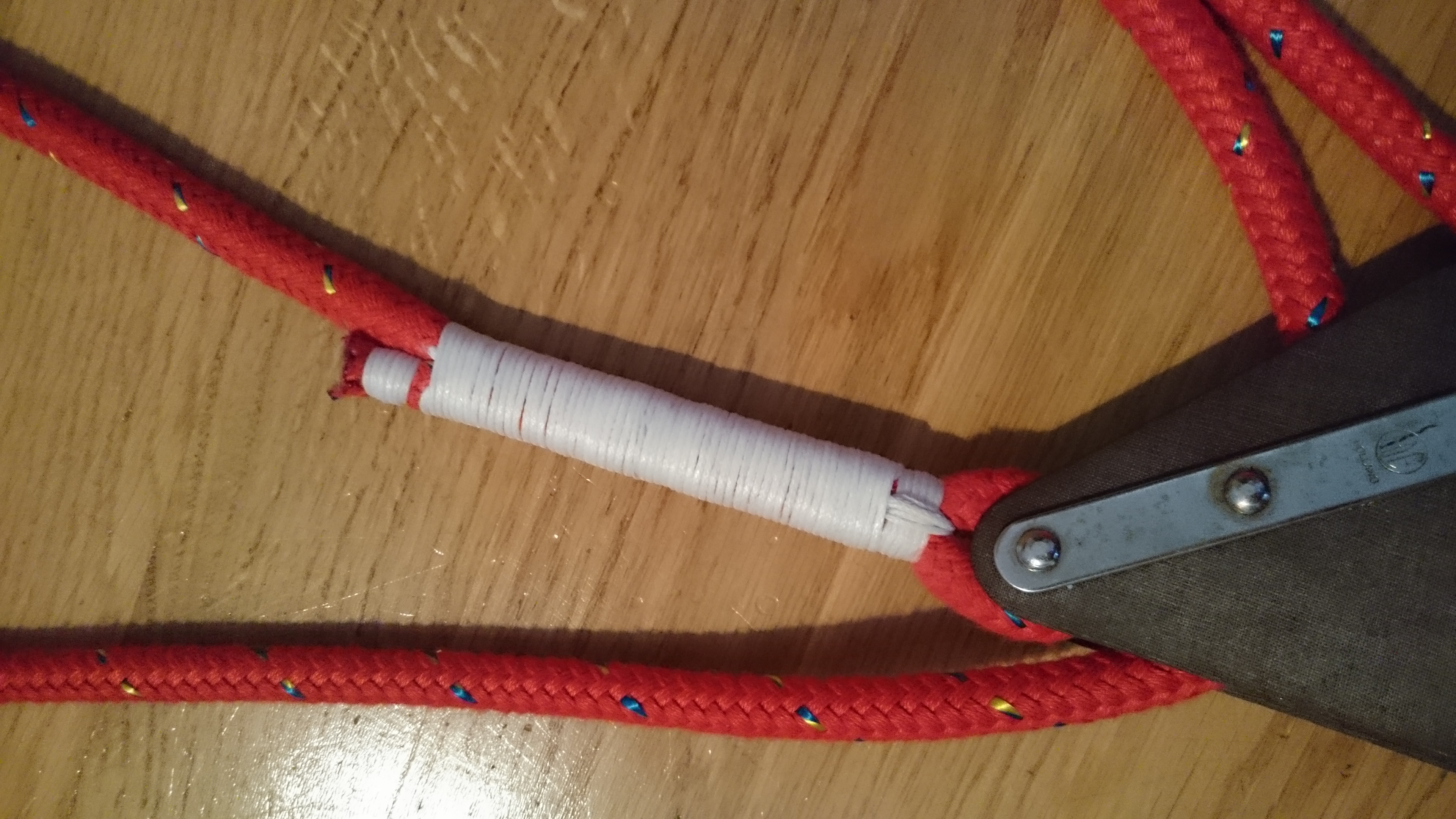 Atelier matelotage, avec des aiguilles achetées hier, l’objectif du jour : refaire l’écoute de GV. L’ancienne est rugueuse, et je pense à mes mains fragiles. Mise en application du noeud de capucin déjà évoqué un peu avant, et une belle surliure bien trop longue.