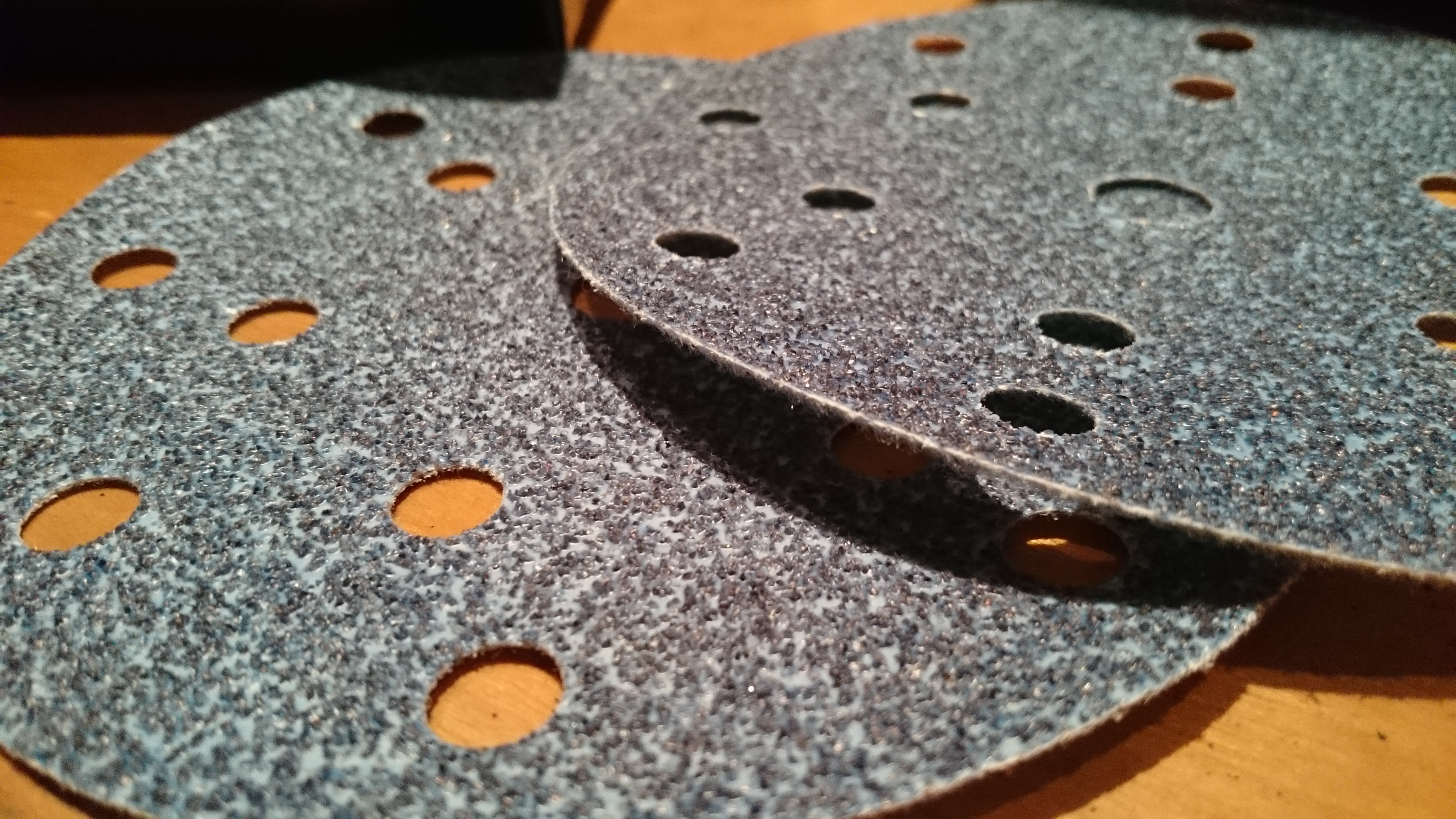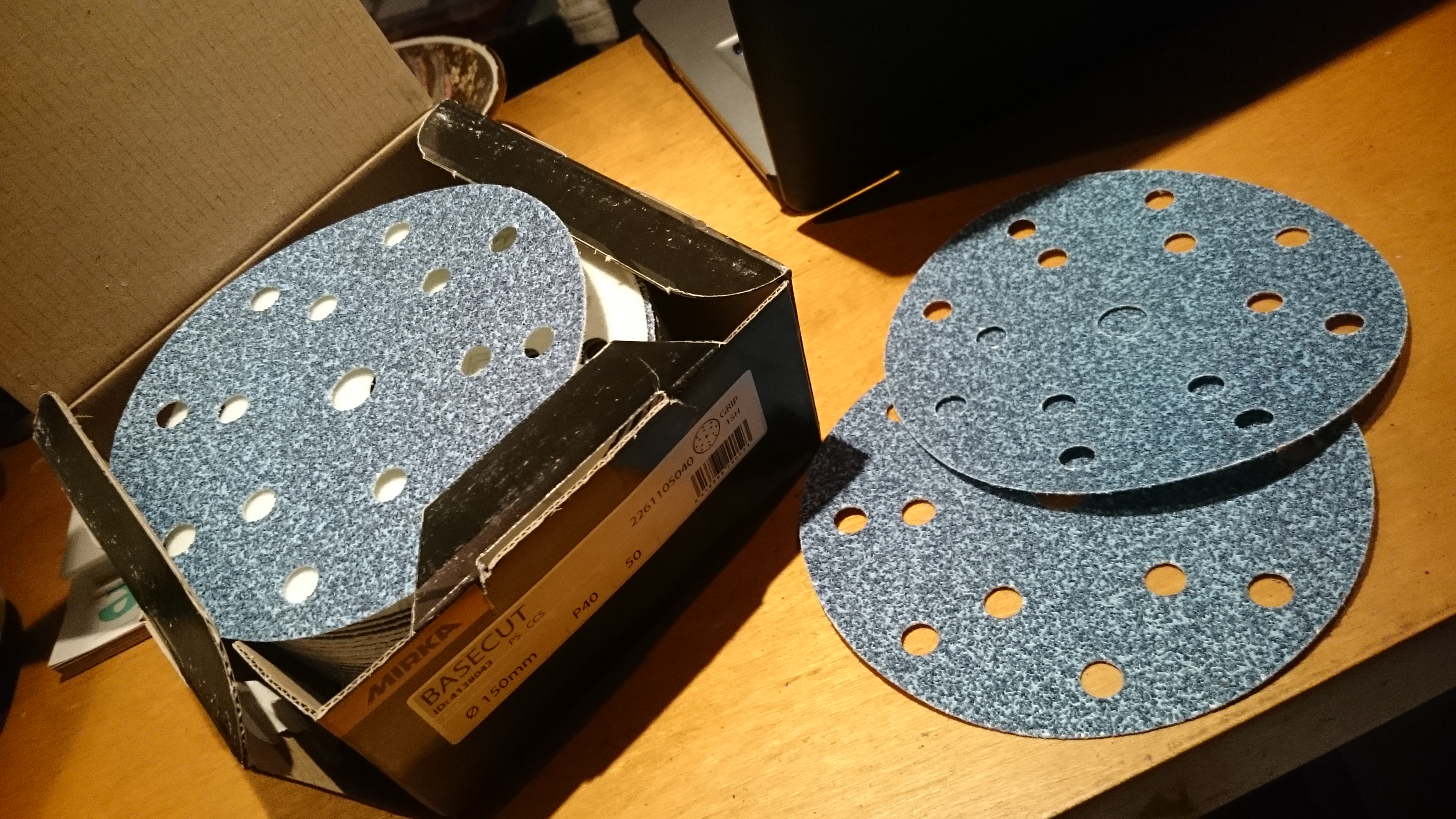Avec mes 50 disques d’abrasif reçus la veille et ma grosse ponceuse, on attaque pour de vrai les oeuvres vives. Le papier Mirka (Mirka Basecut grain 40, 20€ les 50 feuilles + le port) est miraculeux, 1 minute, puis se transforme en papier normal. N’empêche que quand la feuille est neuve, ça dépote, grave. Le papier a 15 trous pour s’adapter aux plateaux des ponceuses Mirka (dont je rêve la nuit), dont 6 qui tombent pile poil sur ceux de l’AEG.