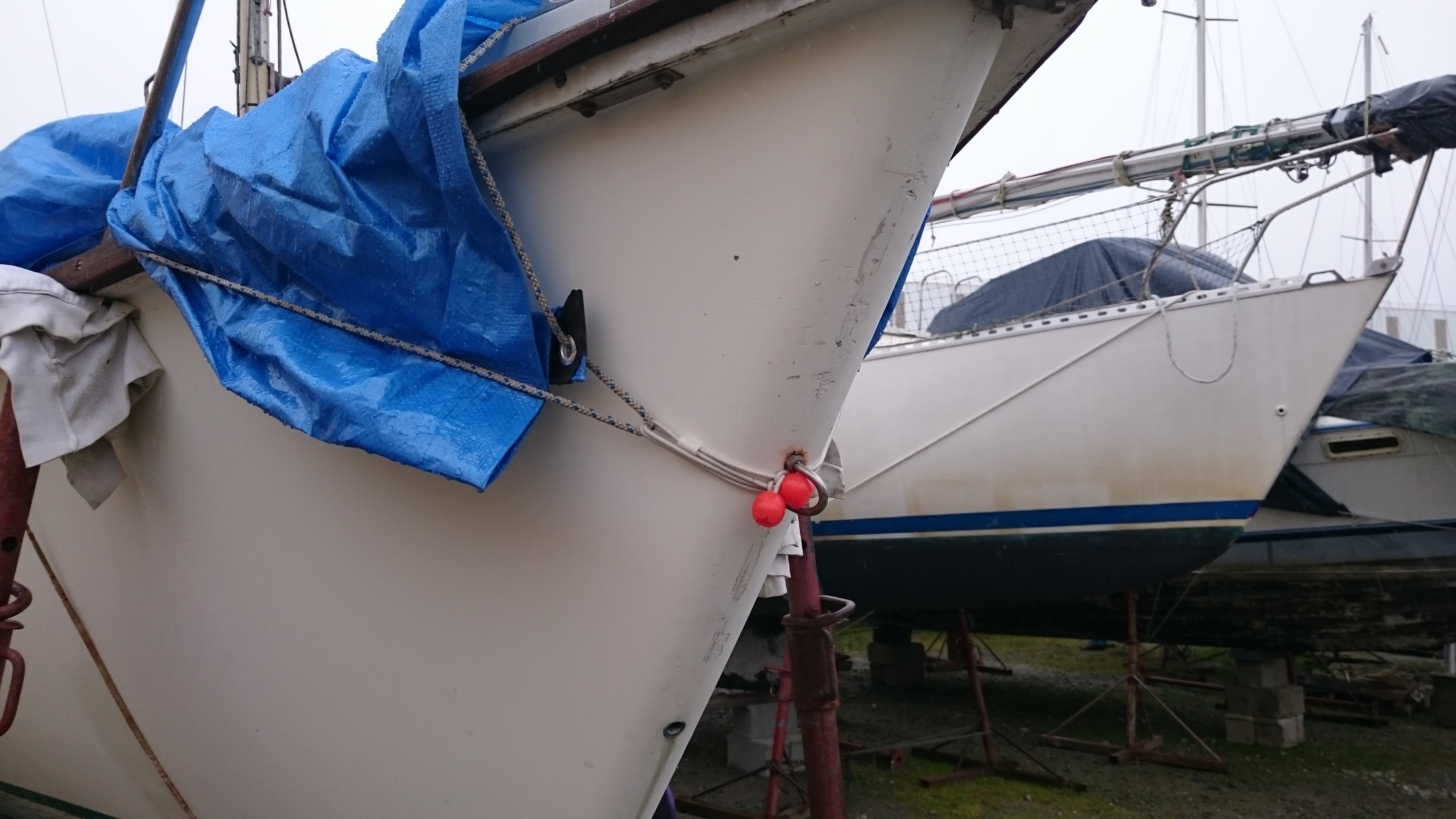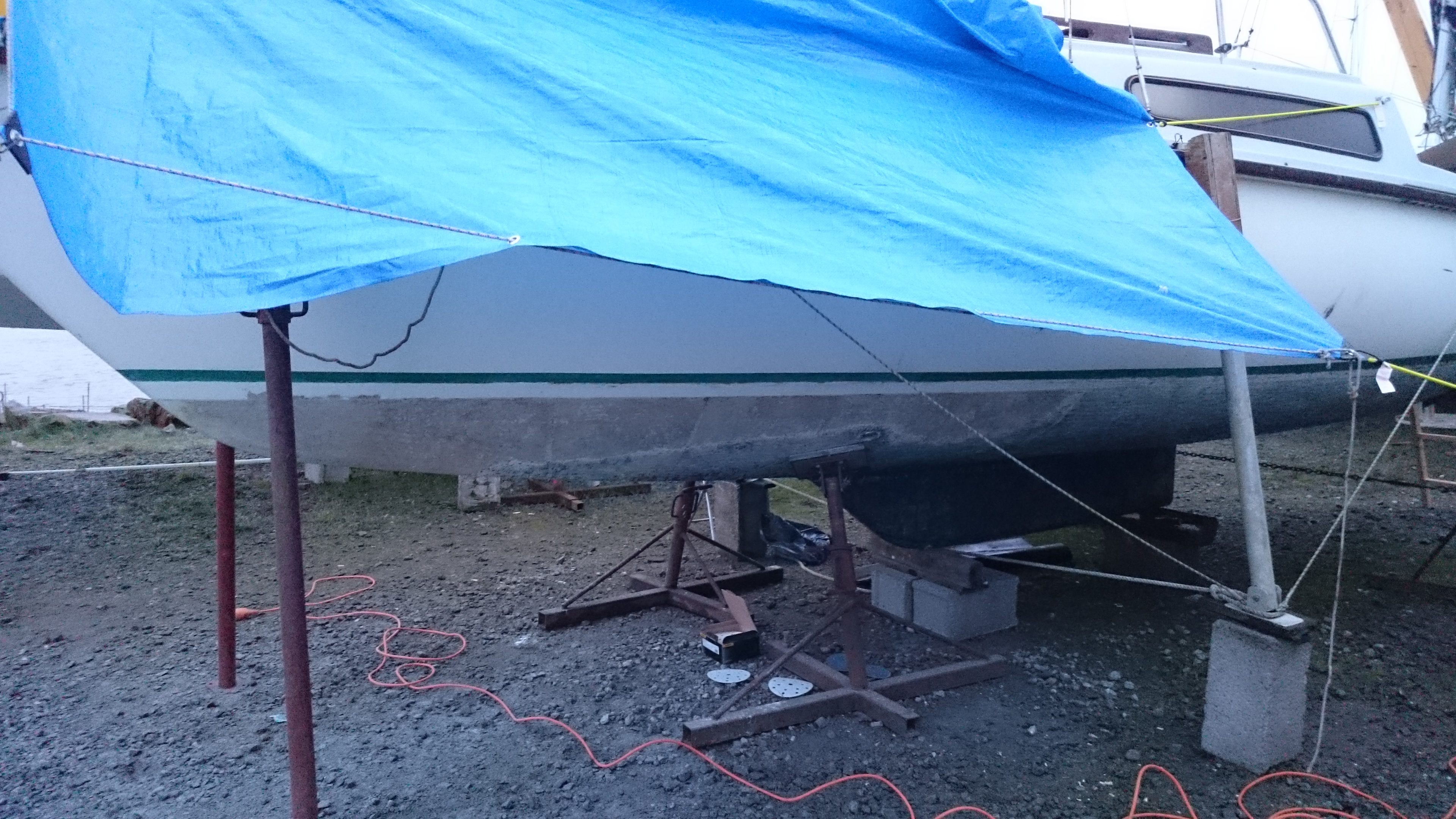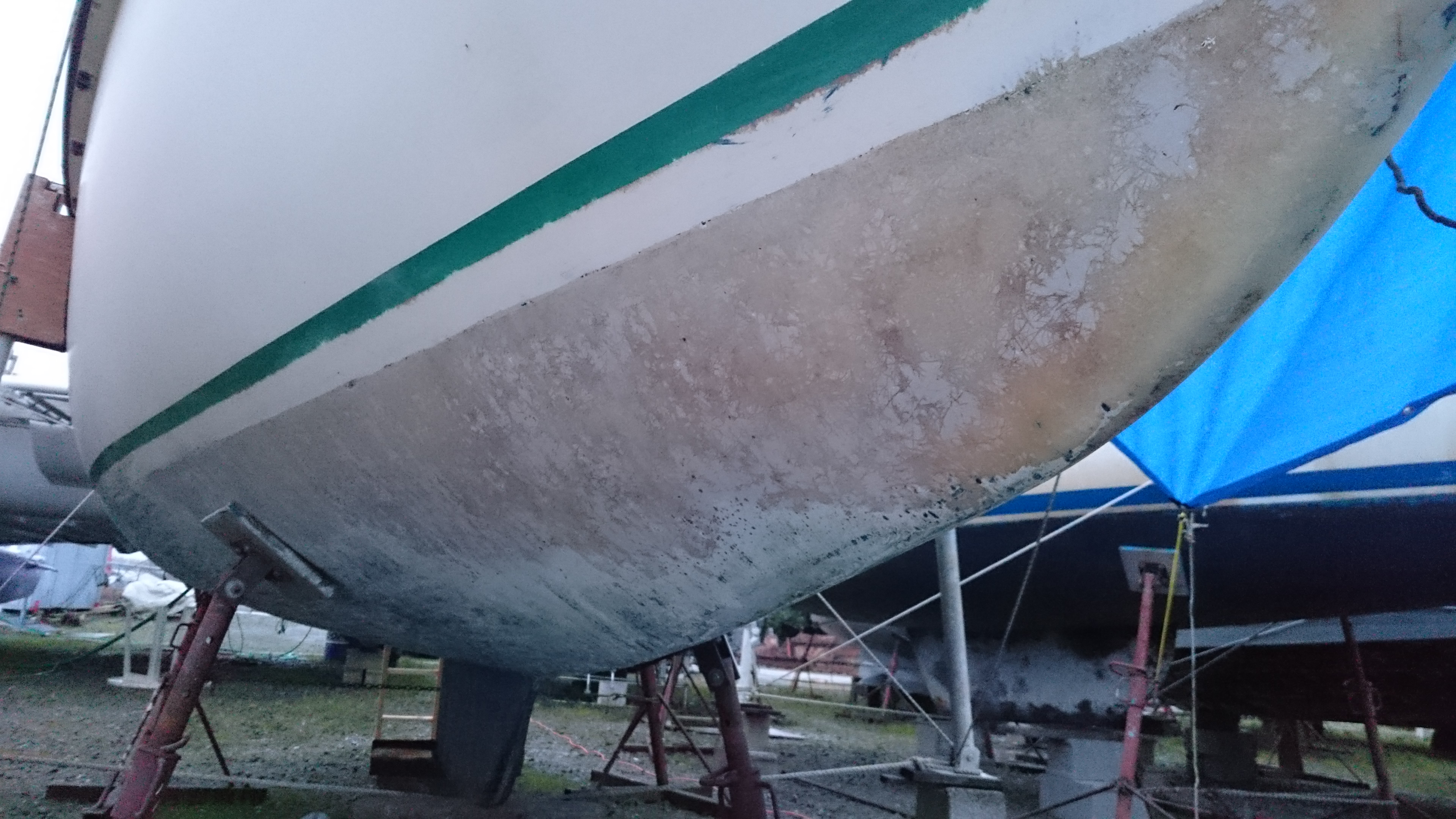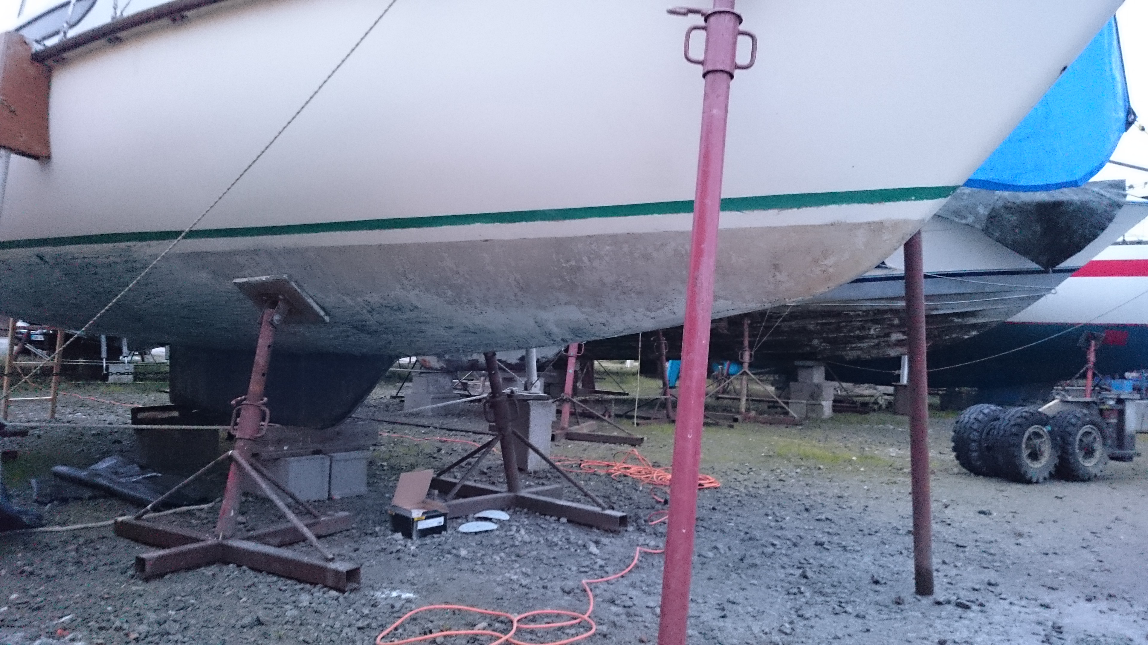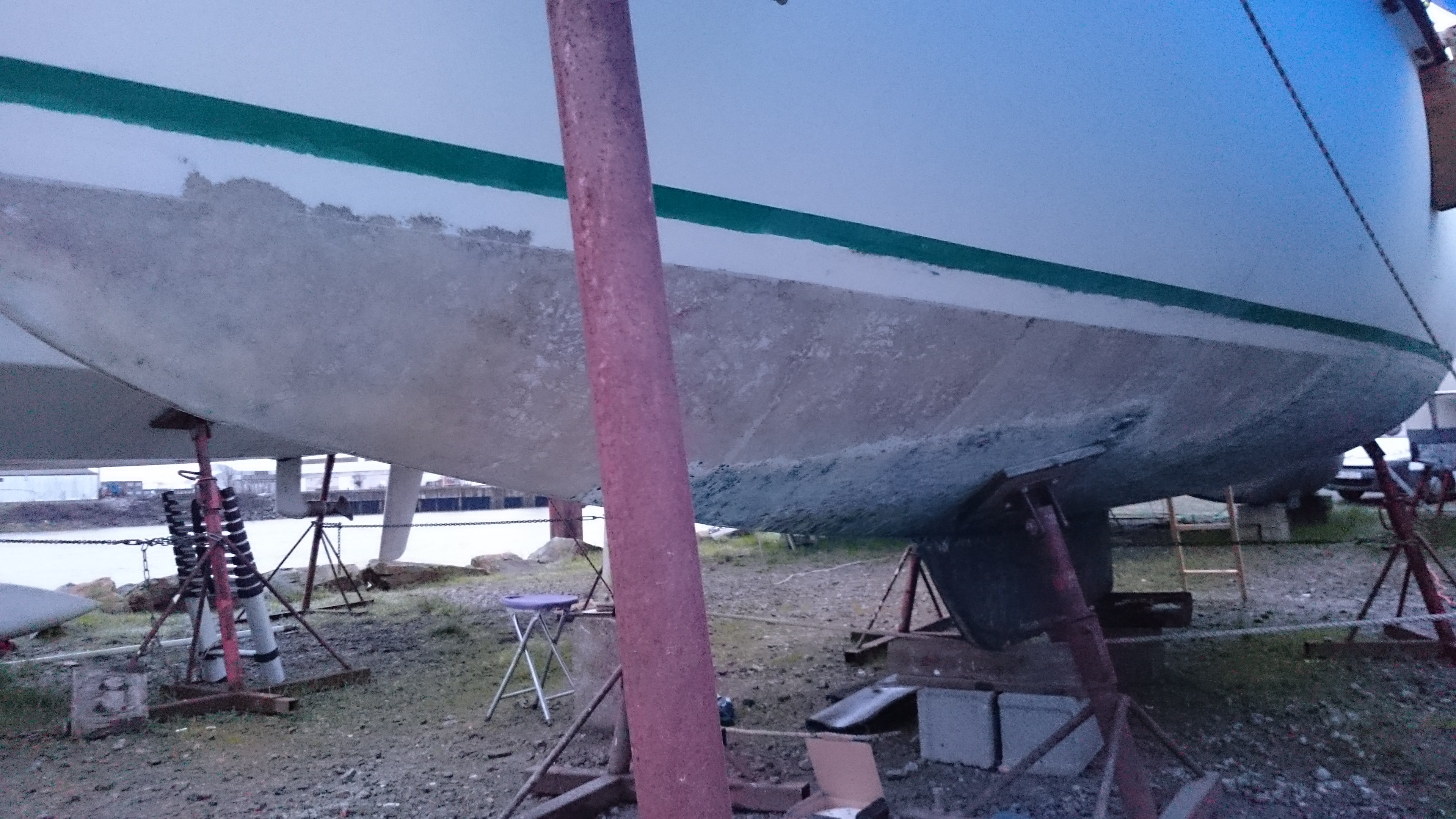 Et puis cette fois ci, j’ai mes bouchons d’oreille, et avec la nuisance sonore en moins, c’est infiniment plus agréable. Un petit tabouret aussi pour poncer assis tout ce qui est au niveau de la ligne de flottaison, autant s’économiser. Reste le poids de la bête et les positions à trouver pour être un minimum à main, il me faudrait un plateau pour me soulever du sol et poncer couché sous la coque. Autre galère : le masque qui protège mes yeux et qui s’embue instantanément. J’ai finalement préféré mes lunettes de protection qui, tant qu’on n’est pas sous ce qu’on ponce, offrent une protection suffisante, s’embuent moins rapidement et sont plus rapides à nettoyer.