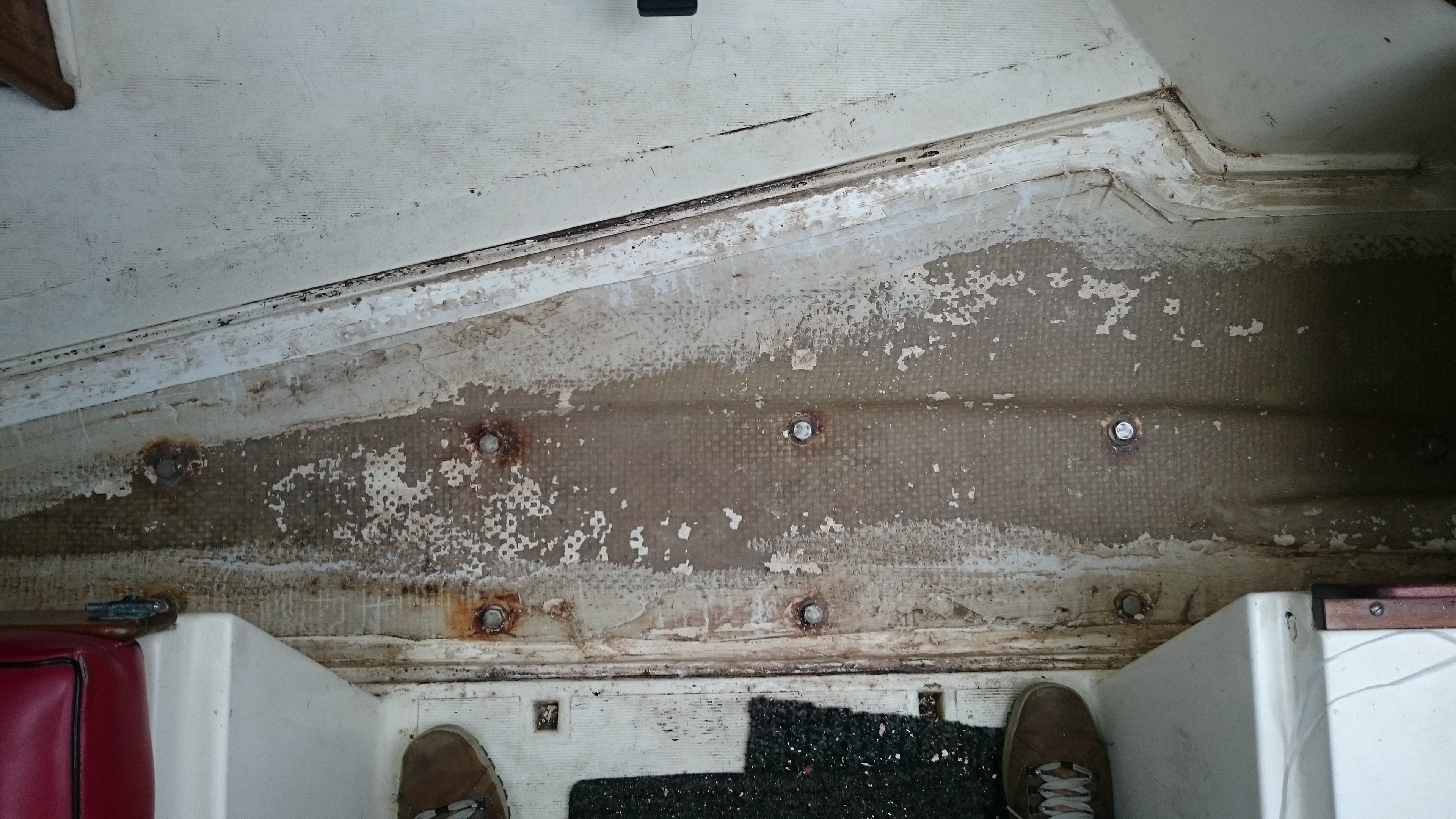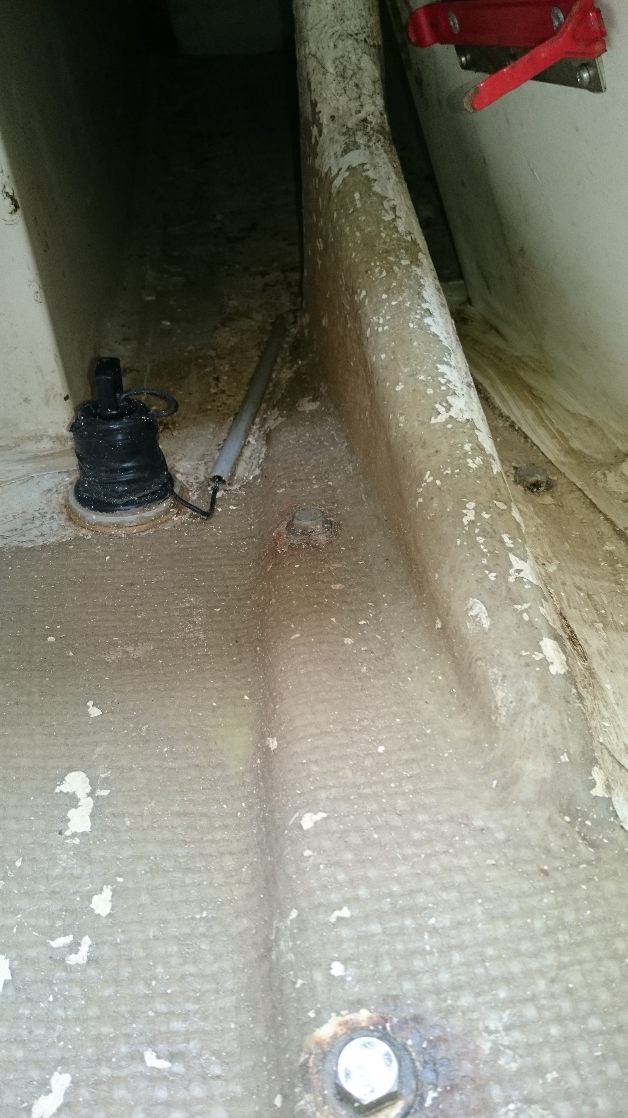 Quand on avait vu le bateau pour la première fois, on avait découvert en fond de cale une belle flaque d’eau qui nous avait bien questionné. Mon copain qui était venu avec moi l’avait goutée avec pour verdict : elle est très salée. S’en est suivie une vérification méthodique des passe-coques qui ne semblaient pas forcément fautifs. Et puis, après aussi longtemps à terre, on se demandait bien comment de l’eau de mer aurait pu rester ici sur la durée.
