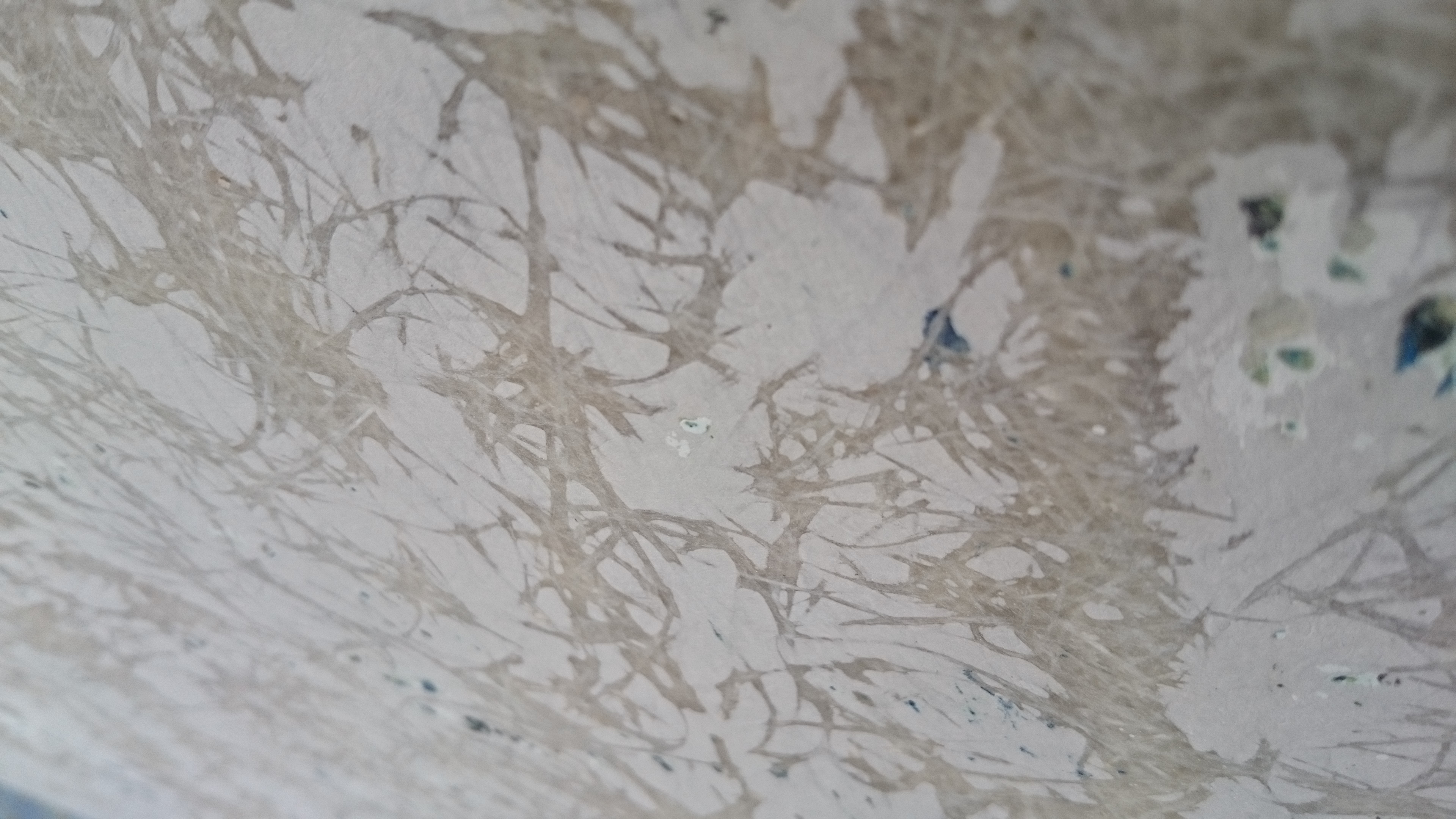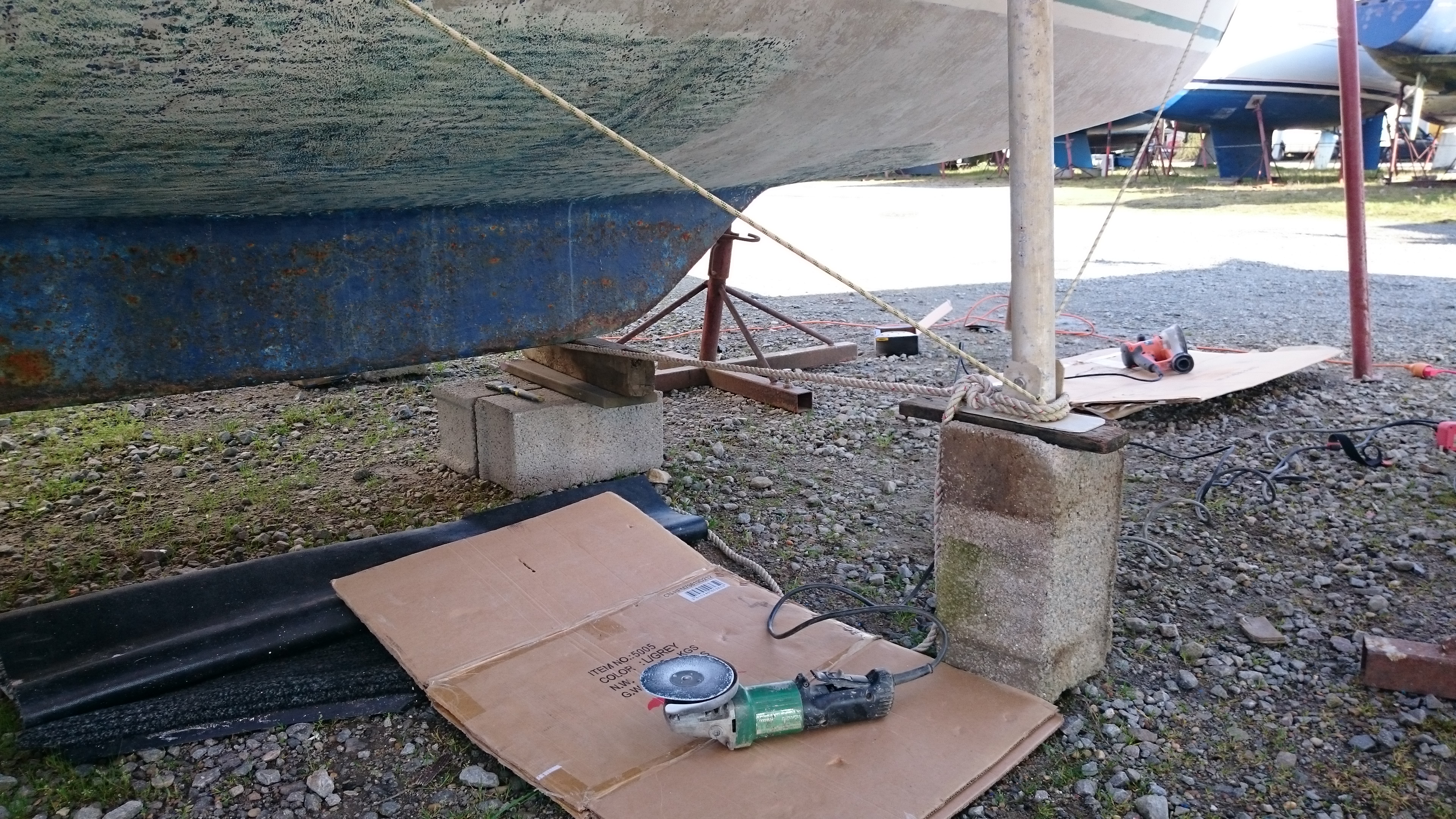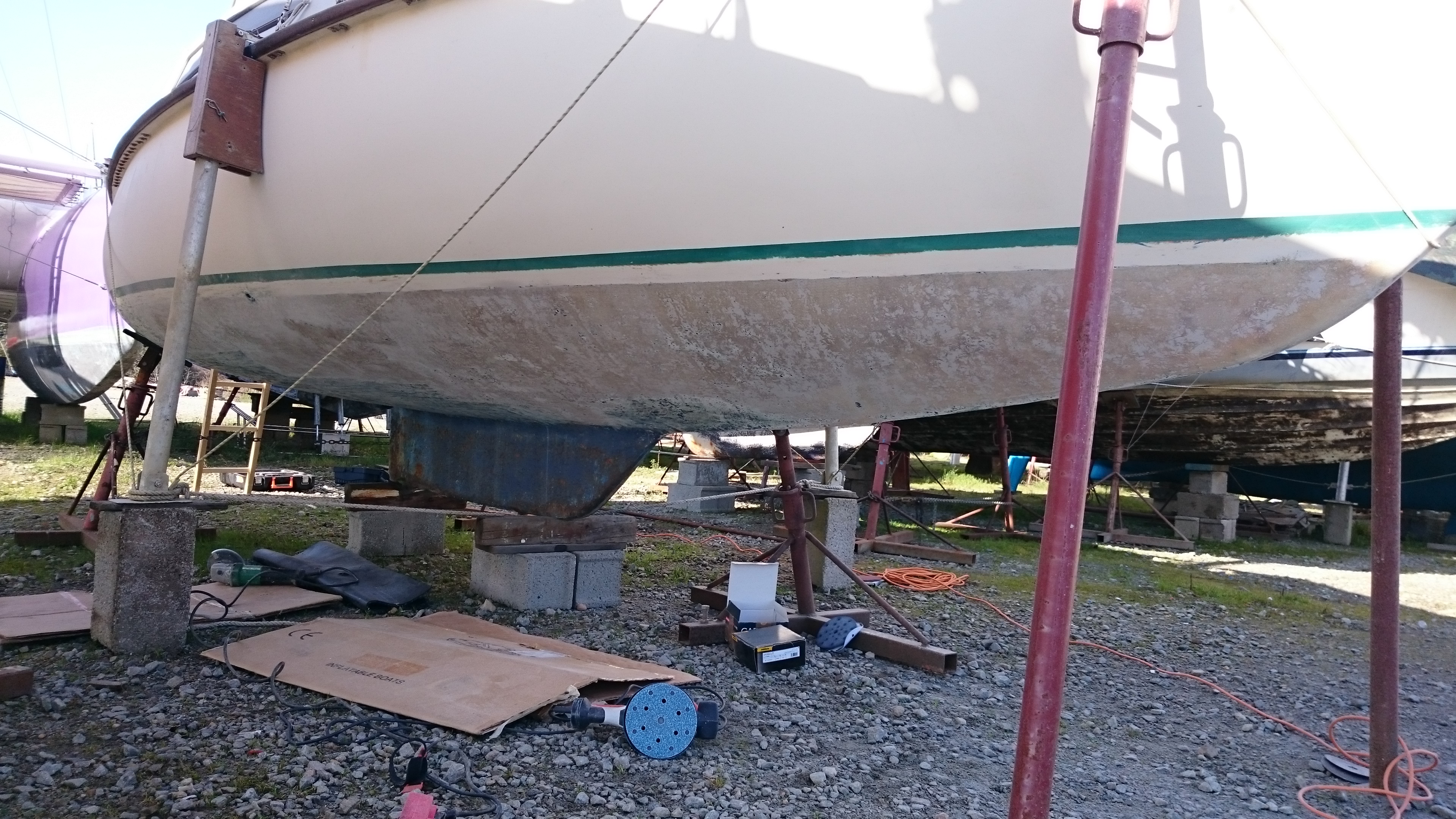 Je me posais la question au début du ponçage de l’origine de quelques trous dans la fibre, il semble que ce soit lié à la construction du bateau. On voit très clairement tous les 50-70 cm des bandes, sans doute la largeur du mat de verre, et entre deux bandes, la surface est facilement abimée. Et au fond des creux, de l’antifouling bleu, ça va pas être facile à nettoyer…