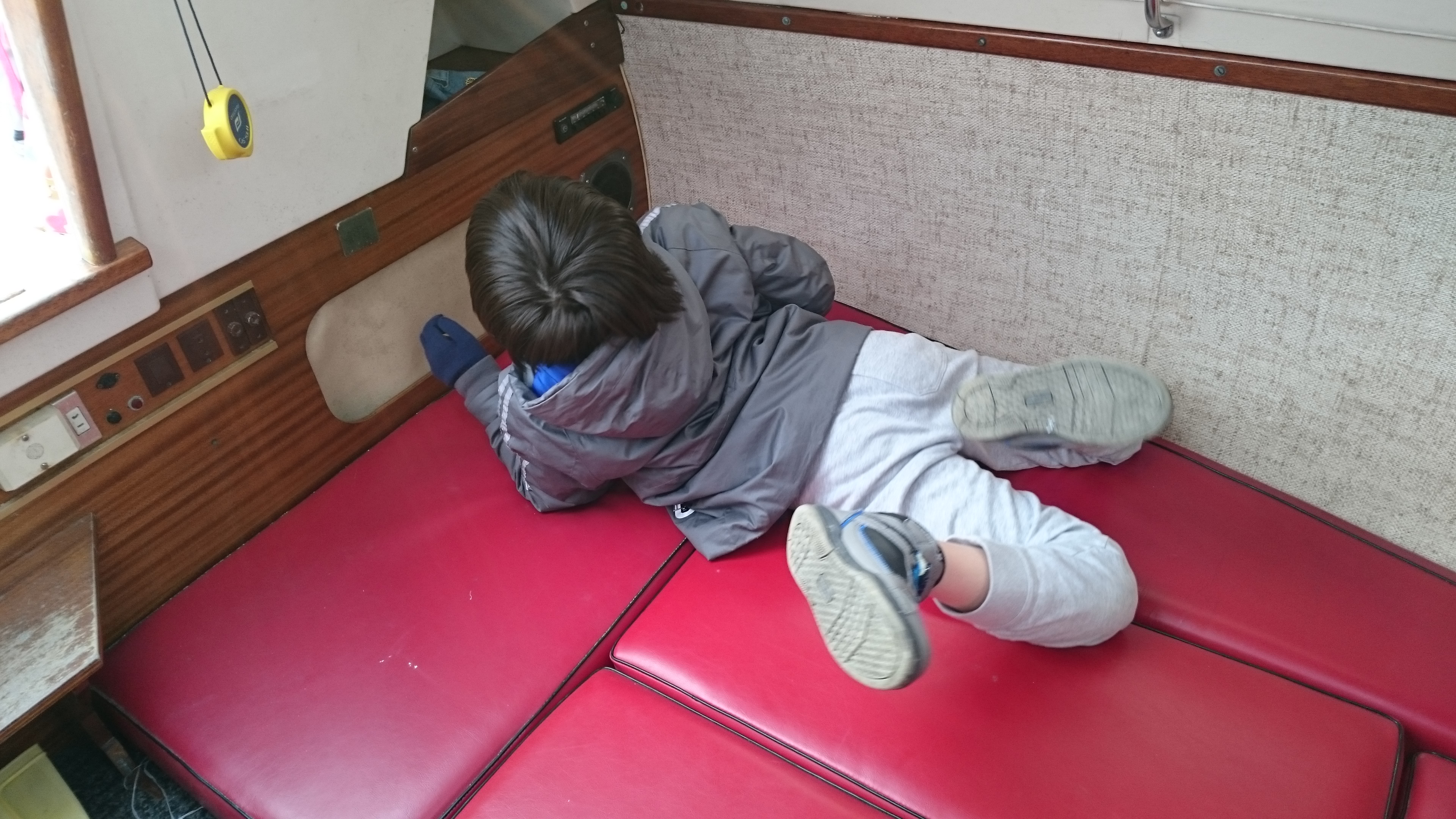 Aujourd’hui aussi, j’ai aspiré tout ce que je pouvais sur le bateau, j’en avais assez de déplacer la poussière avec mon petit ramasse-bourriers. Une fois le tout bien nickel, il fallait remettre le bateau en ordre, et j’ai remonté le carré en mode couchette sans rien dire à personne (c’était un test). Le test a marché à plein, dès que le petit a vu la couchette, il a lâché un petit « oh super » et s’est empressé de se rouler sur les coussins, pieds en l’air pour ne rien salir.