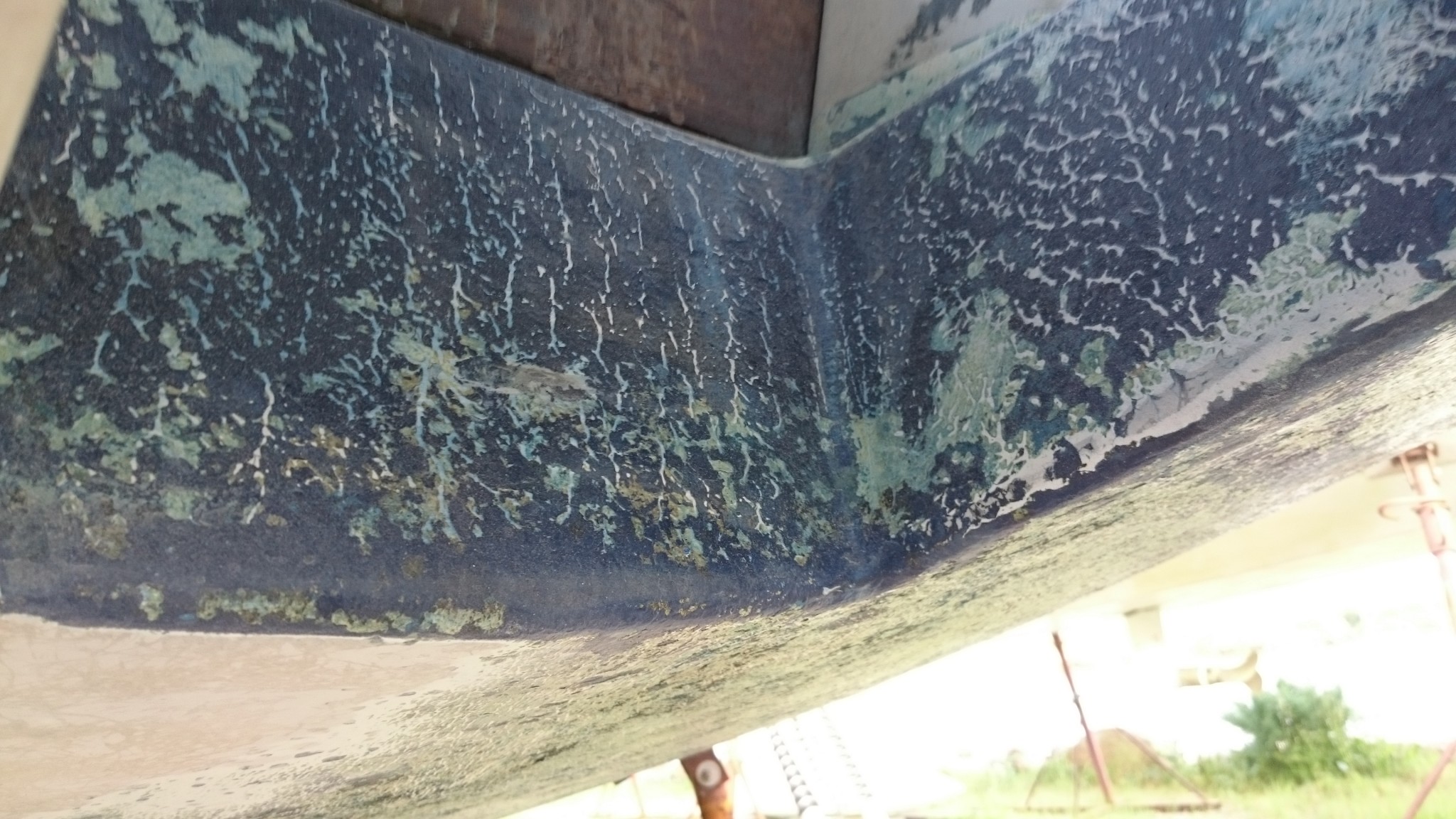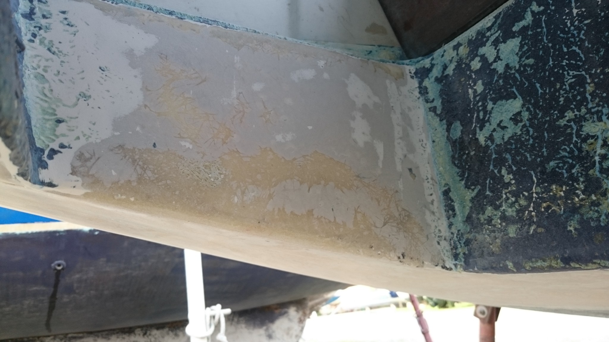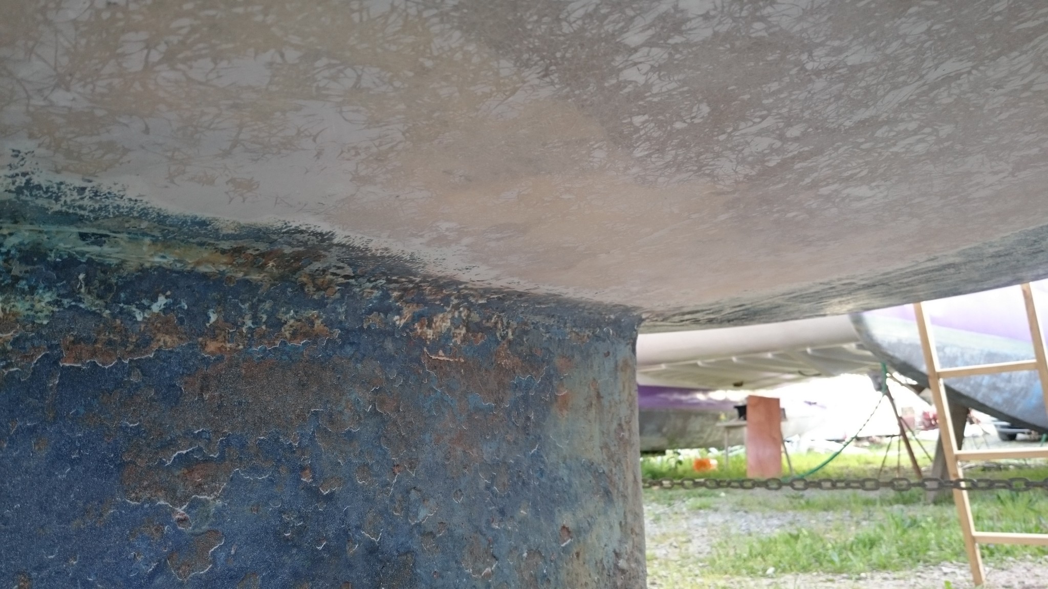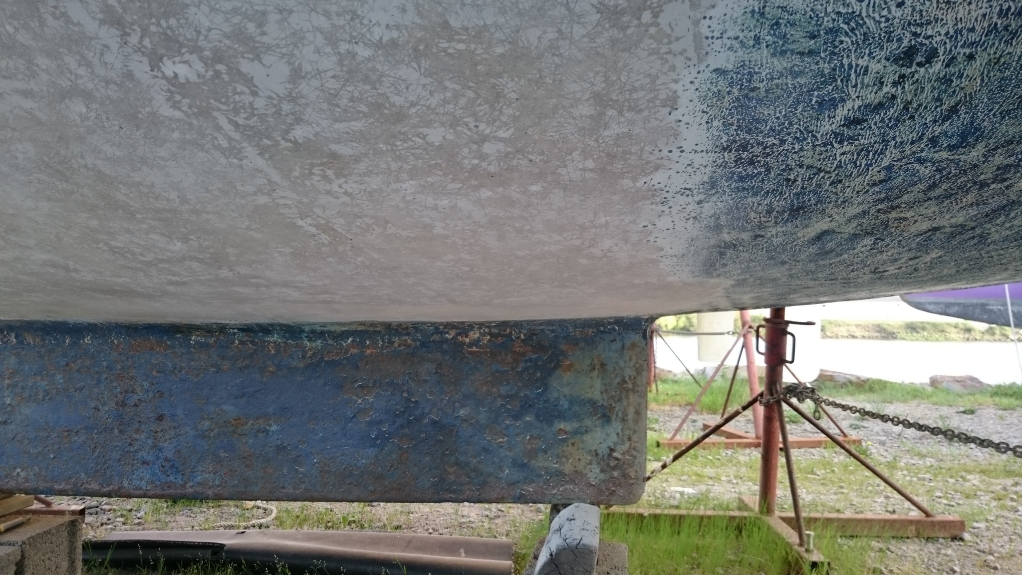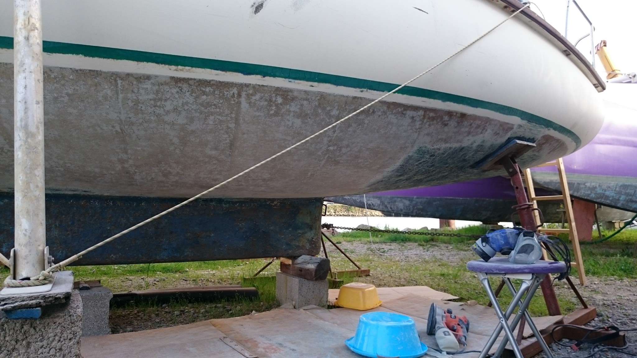 Ce moment où on se dit qu’on pourrait en voir le bout un jour. À 17h aujourd’hui je n’y étais pas encore, mais deux heure et demie après, on pourrait bien y être. En tout cas, je pense que j’aurai fini le ponçage ce week-end. Je pourrai alors passer à la suite : colmatage au mastic epoxy des quelques trous trouvés ici et là, et traitement du saumon : acide chlorhydrique puis lavage à grande eau, puis alcool à bruler puis une couche d’epoxy très vite avant que la rouille ne commence à s’y remettre traitement au Celtimeto (c’est tellement plus simple et moins dangereux que l’acide). Après, mastic epoxy pour combler les creux, et seconde couche d’epoxy.