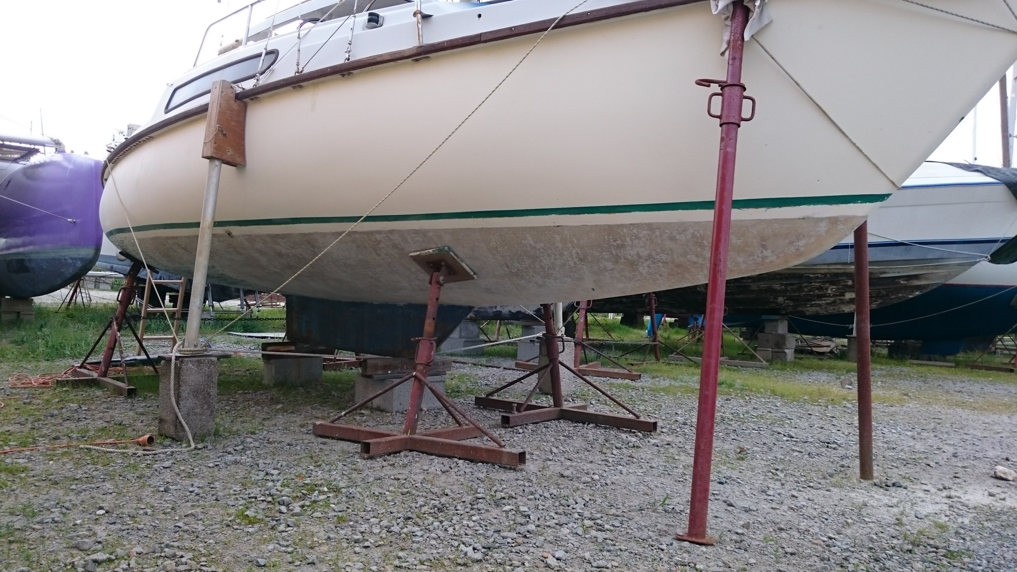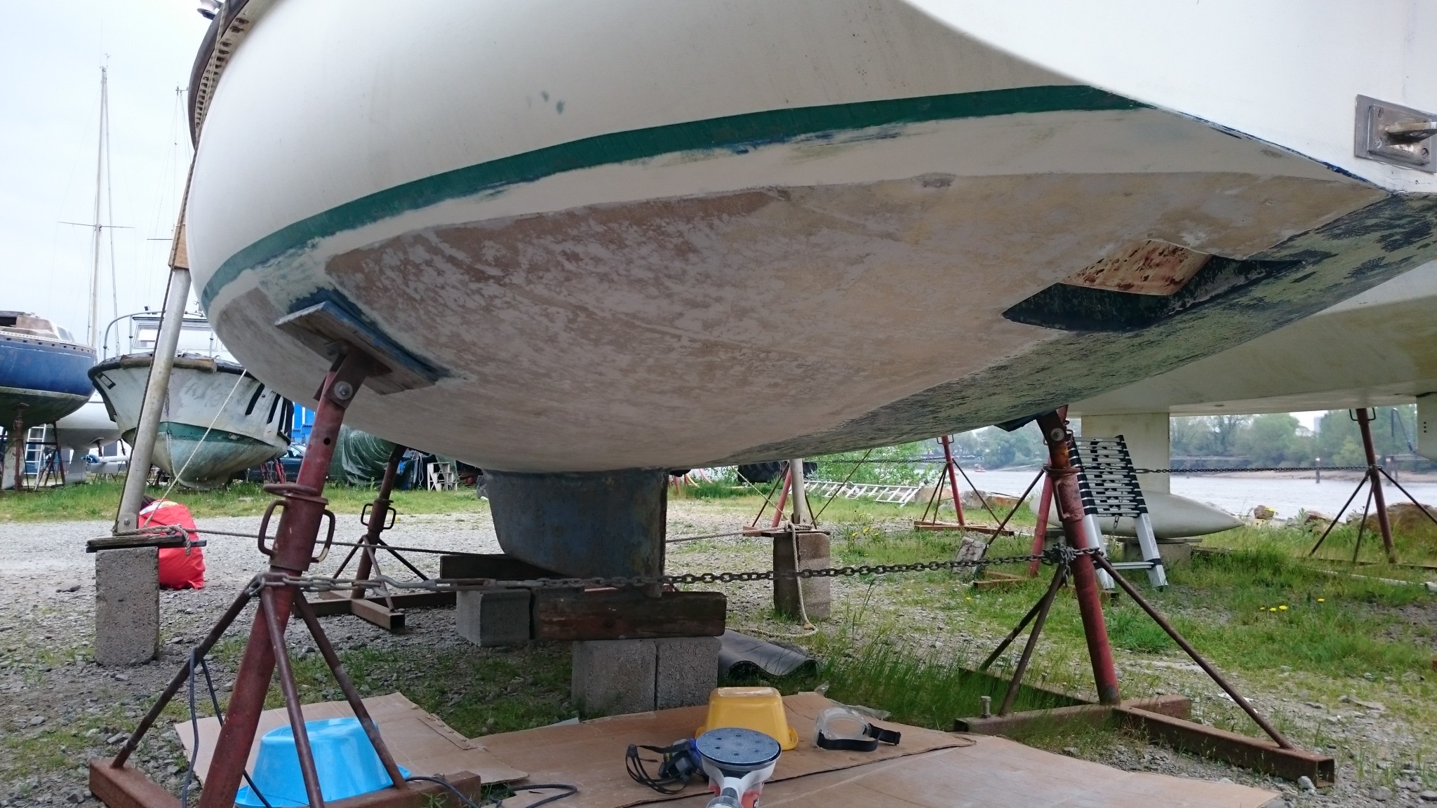 Le chantier change le calage du bateau cette semaine, je pourrai le week-end prochain poncer sous les patins des bers. Et hop, fini le ponçage ! Au final, j’aurai consommé mes 50 disques Mirka.
