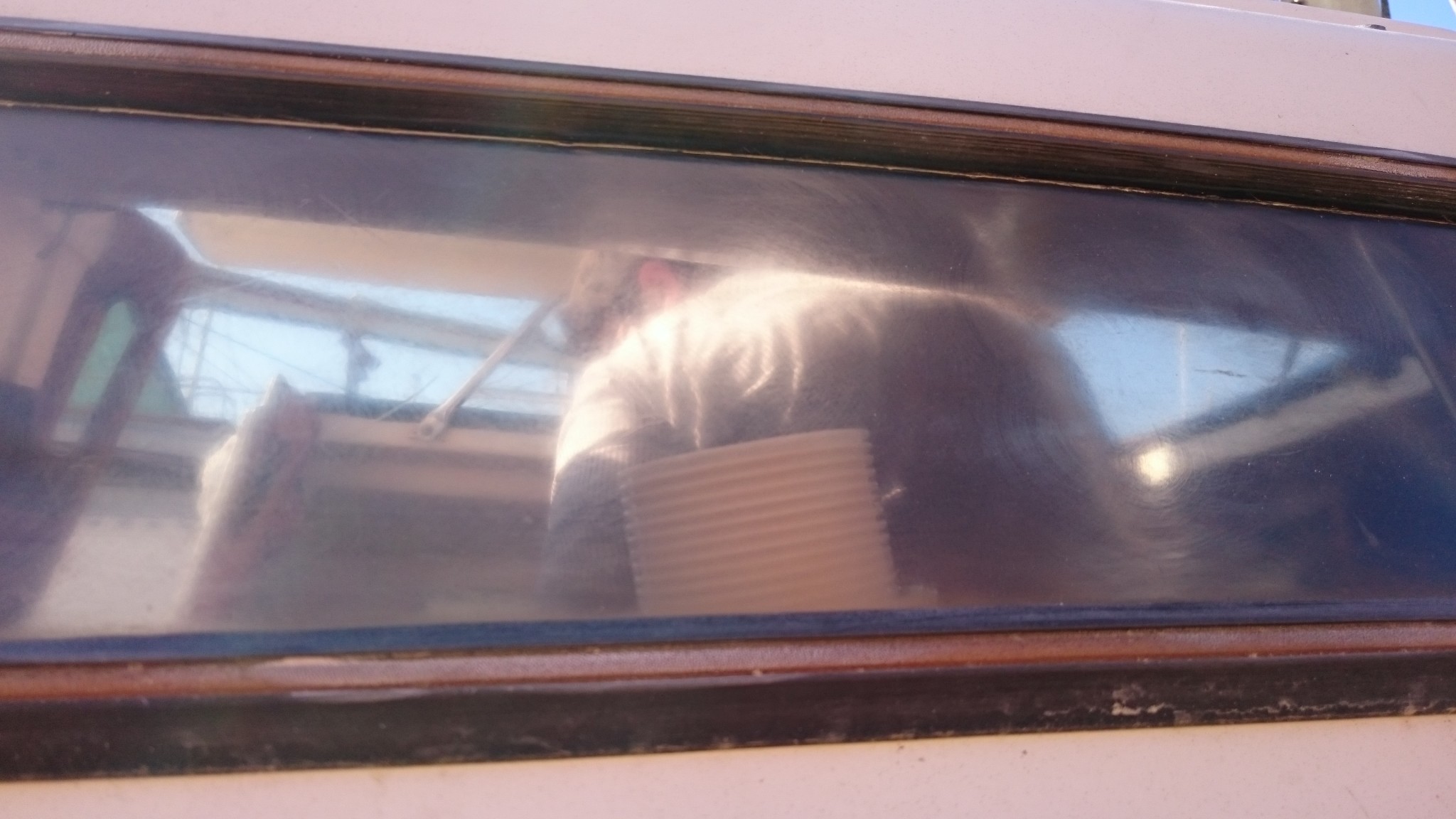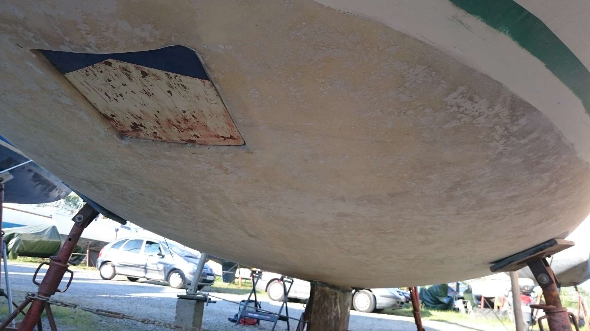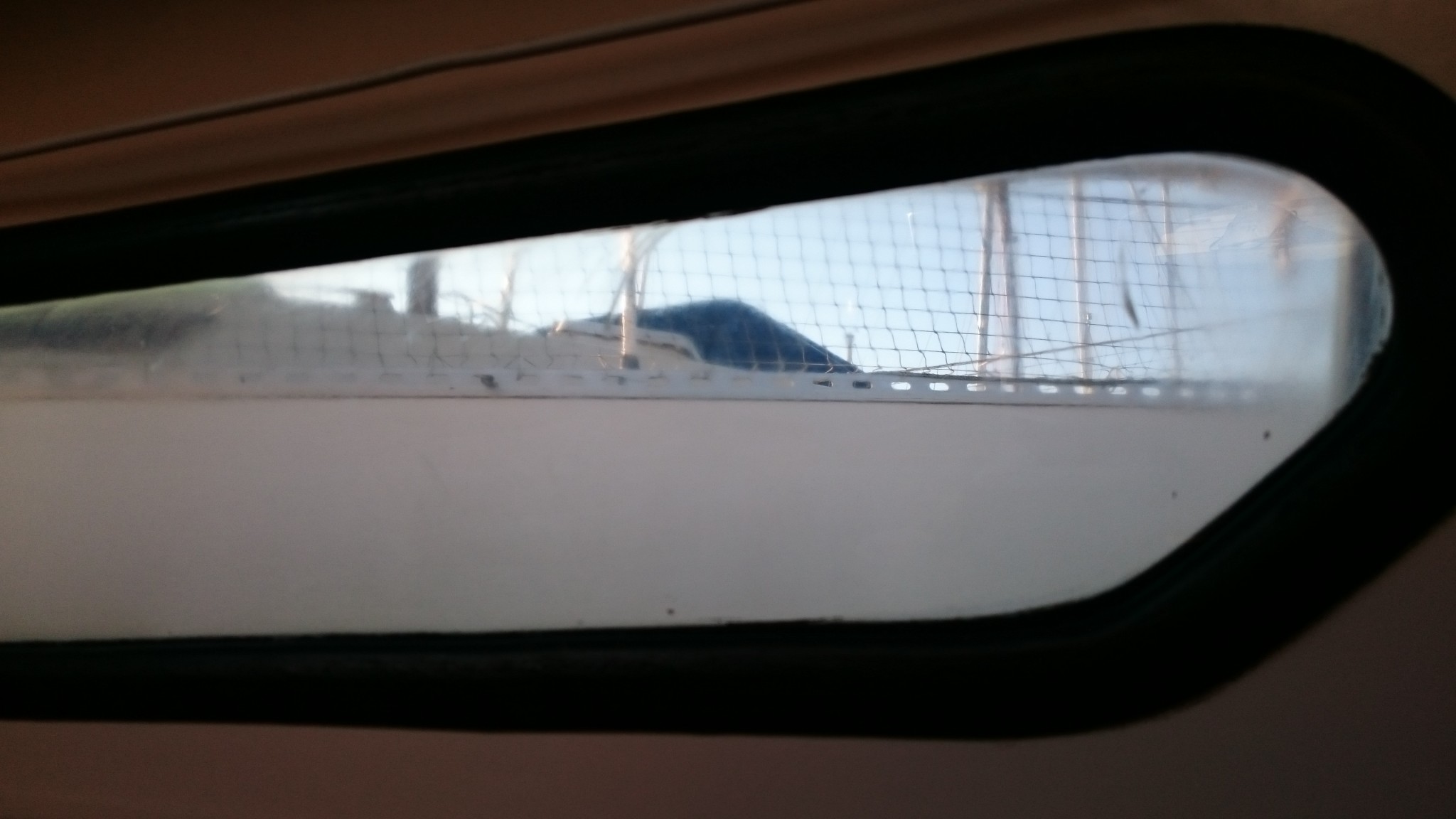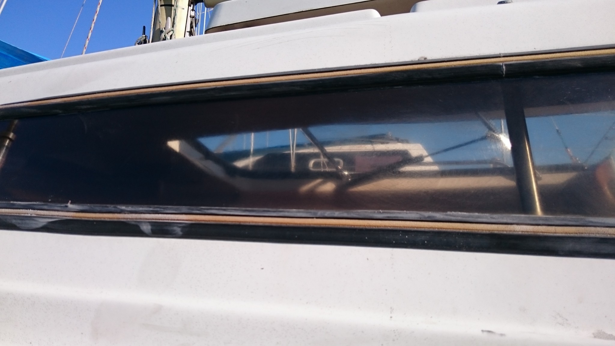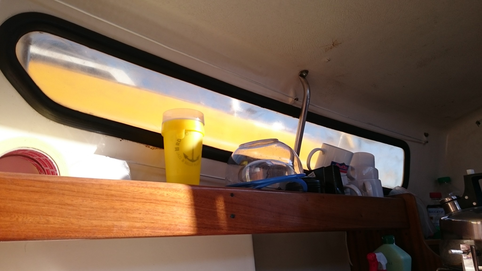 Car ma soeur aussi est venue avec son homme et deux de ses fils. Programme sympa : ponçage de la barre et de son stick, pose du feu de poupe, rebouchage au mastic polyester d’un trou sur le pont, et surtout polissage des hublots qui nous permettent désormais de voir ce qui se passe à l’extérieur !
