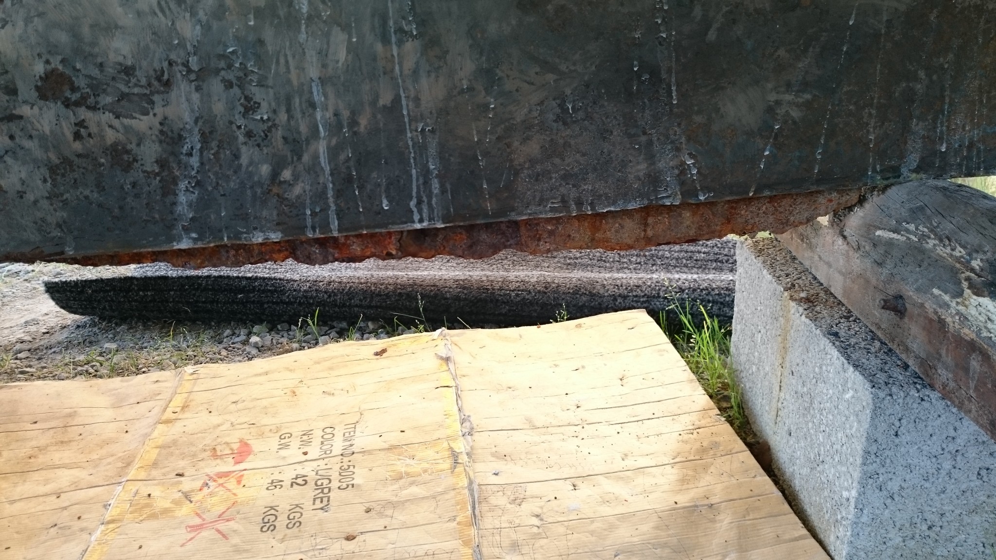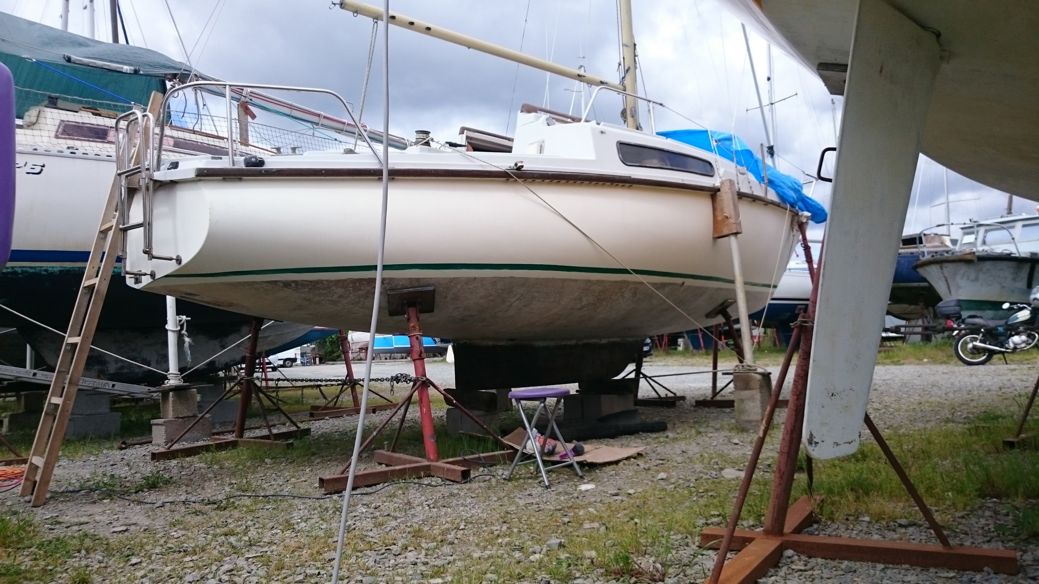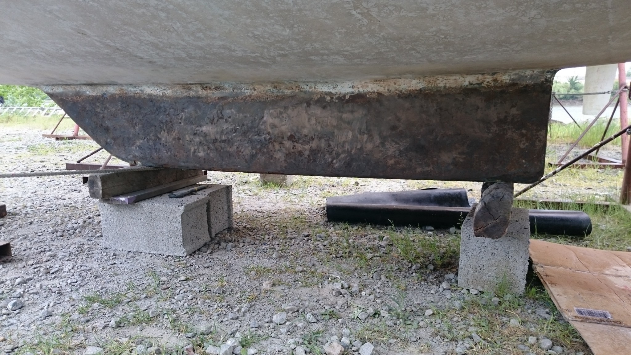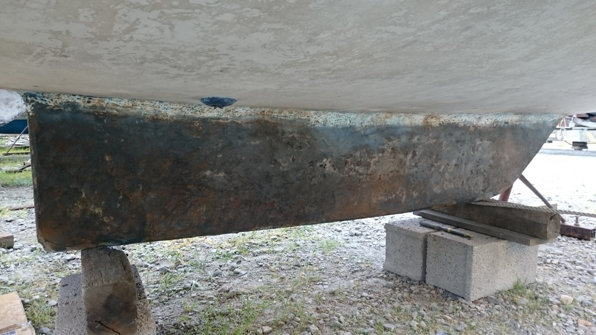 Et aujourd’hui, en arrivant sur le chantier pour retirer mon primaire epoxy au comptoir, on m’accueille en me disant que le calage du bateau avait été changé. Chouette, on va pouvoir tourner la page du ponçage aujourd’hui.