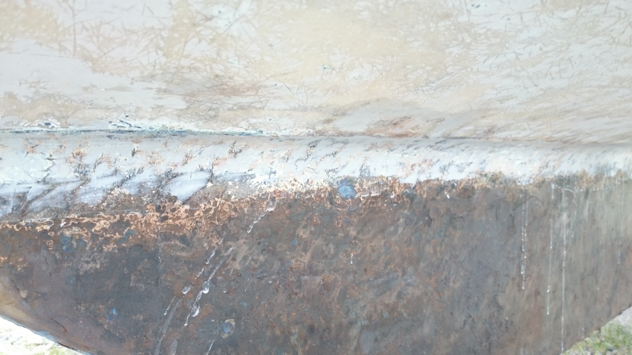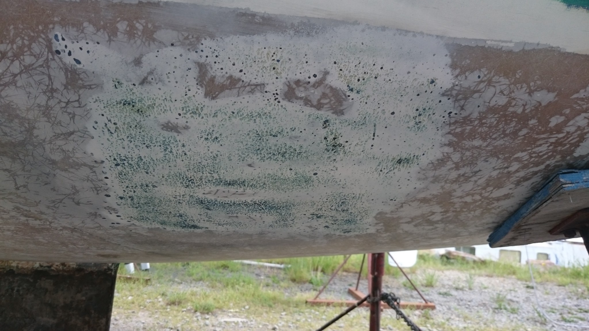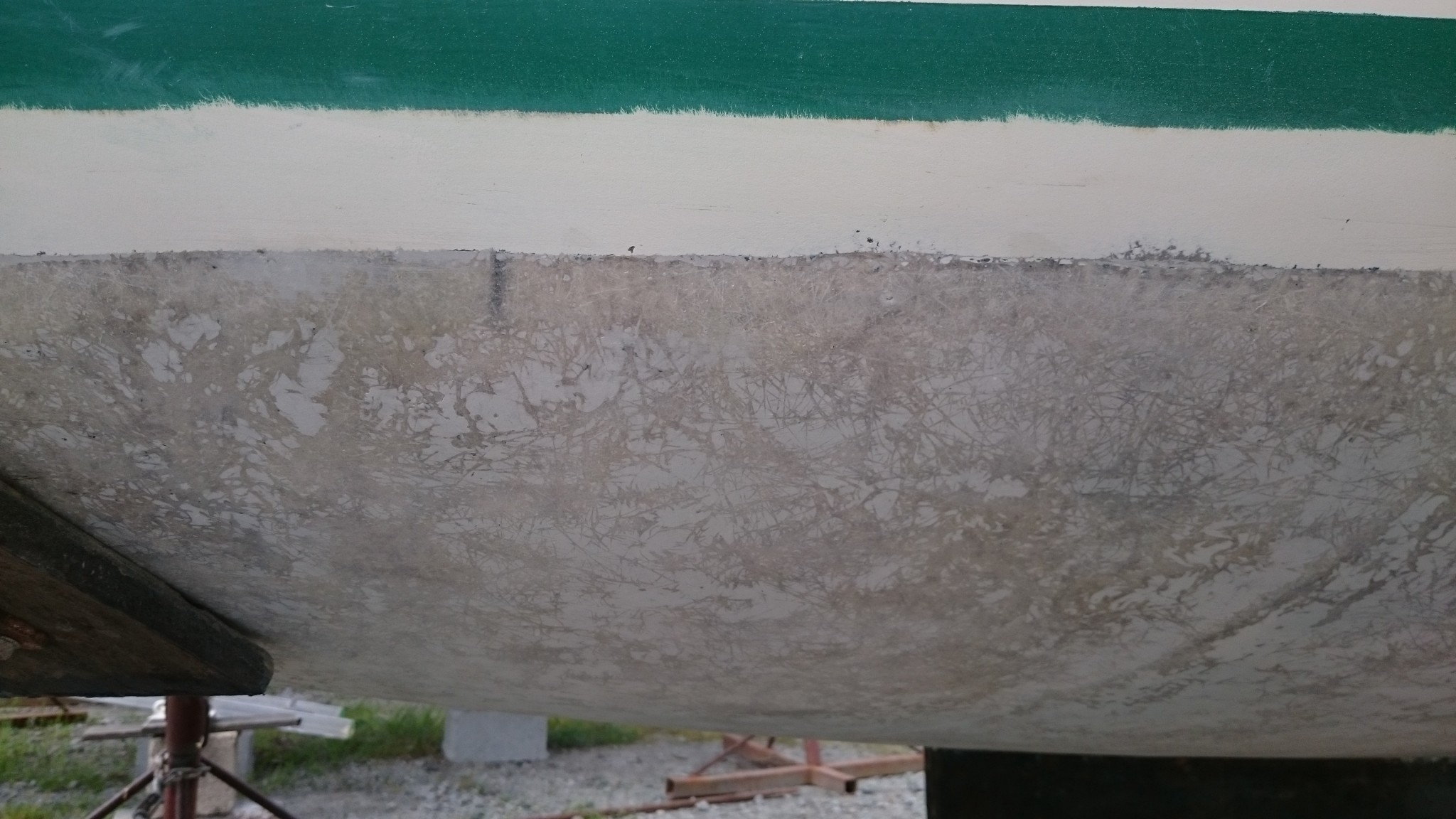 Il y avait eu samedi dernier un petit épisode de ponçage. Cette fois ci à la ponceuse à bande, pour aller chercher ce que l’orbitale n’atteignait pas dans l’arrondi entre la coque et le saumon. Et avec la ponceuse à bande, c’est juste parfait, à croire qu’elle a été conçue pour cet arrondi. Ce qui me fait mieux comprendre pourquoi tout le monde préconise l’usage d’une ponceuse orbitale pour les travaux sur une coque : c’est sans doute le meilleur rapport entre la puissance (ça attaque plus qu’une vibrante), et la finesse du travail (une ponceuse à bande ça ne finit pas aussi bien que l’orbitale). Bon, mais plus d’antifouling ici, mais je n’ai pas osé aller plus loin que ça, c’est pas lisse-lisse.