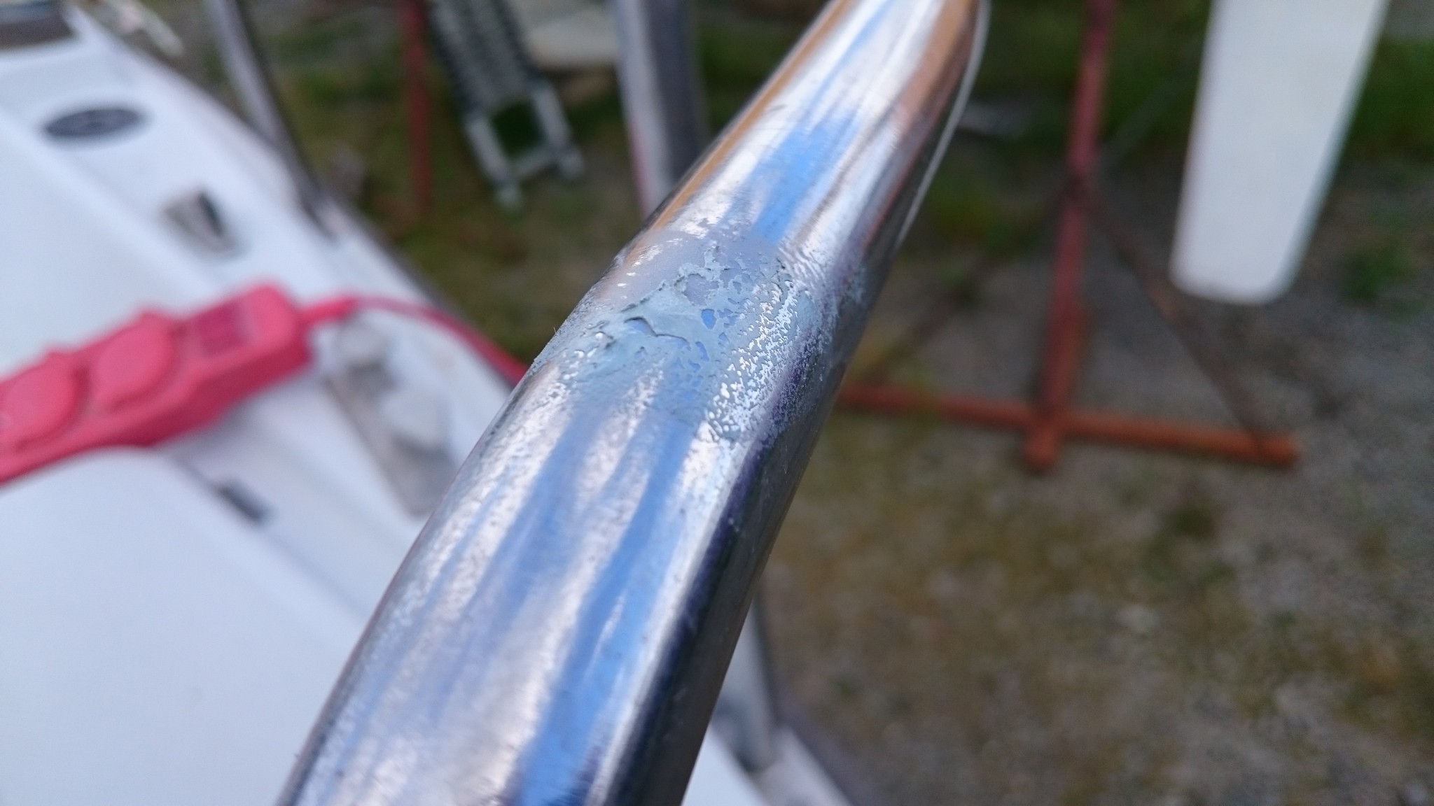 Un peu d’activité autour du mât aussi, mais j’en reparlerai un peu plus tard. Et j’ai aussi débloqué le saumon, en y allant avec une lame de scie à métaux. Le saumon est libre, mais bien attaqué par la corrosion.