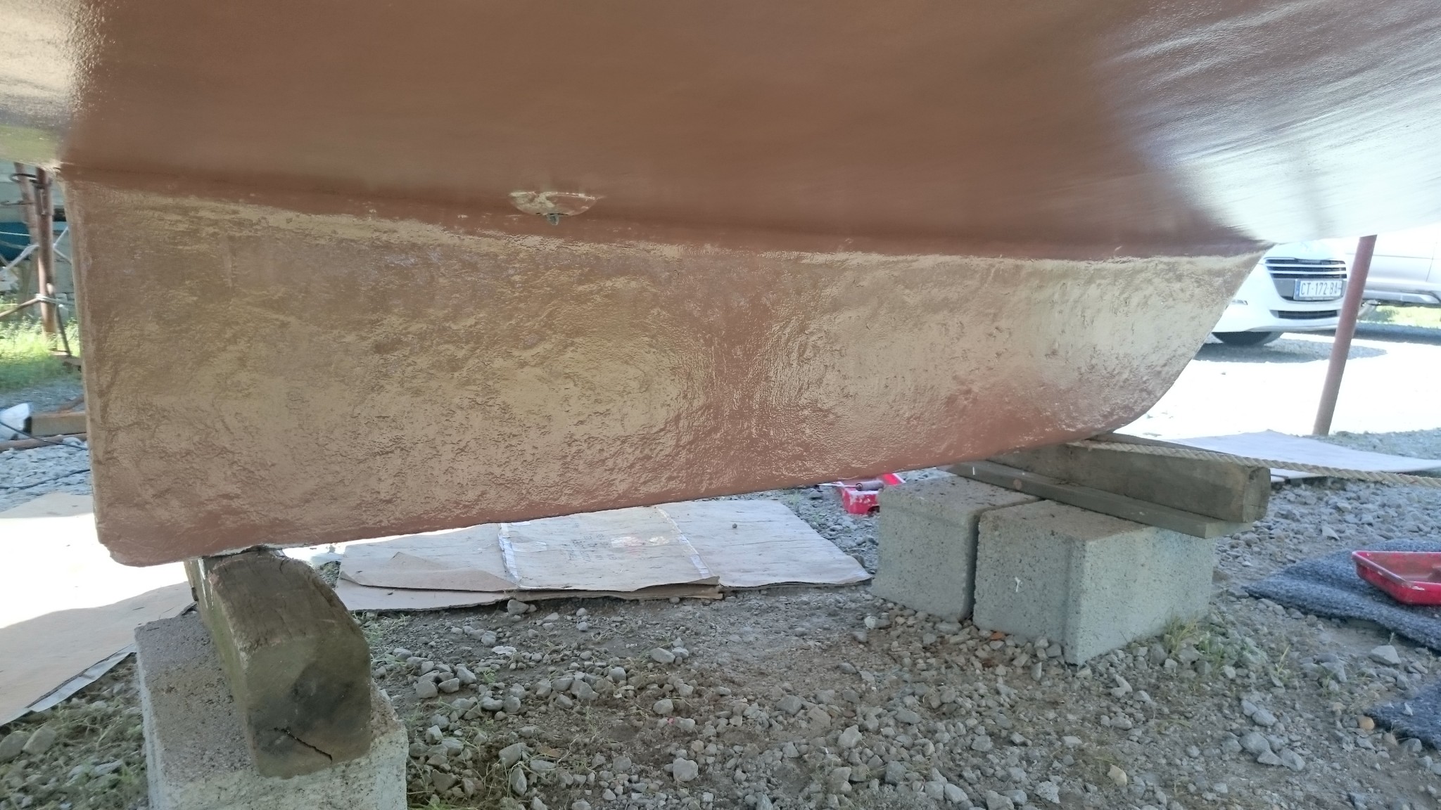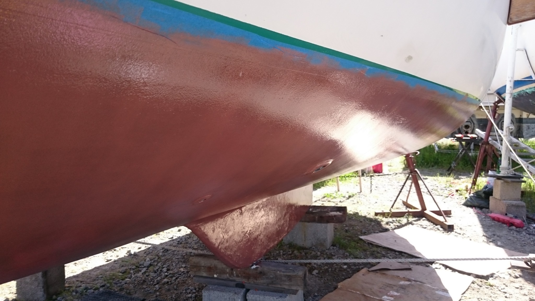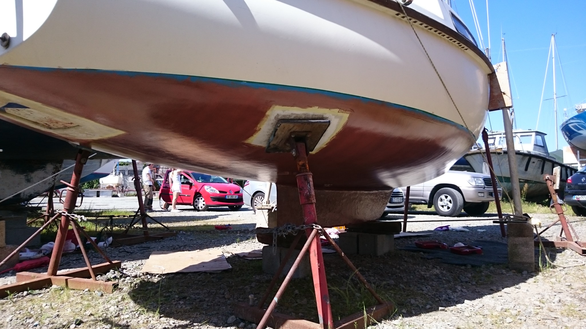 Prochaine étape : changement du calage du bateau (décalé à vendredi, la mise à l’eau prend une semaine de retard) et on remet ça : primaire et coppercoat sous les patins des bers (l’acte 2).