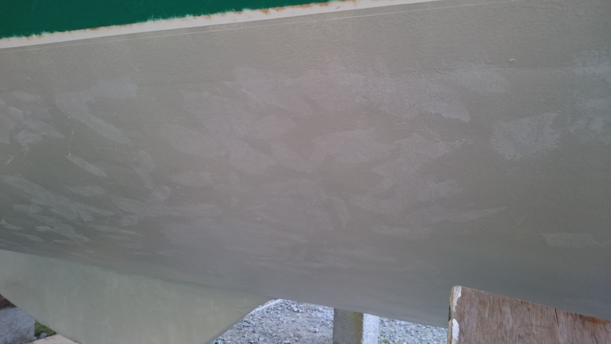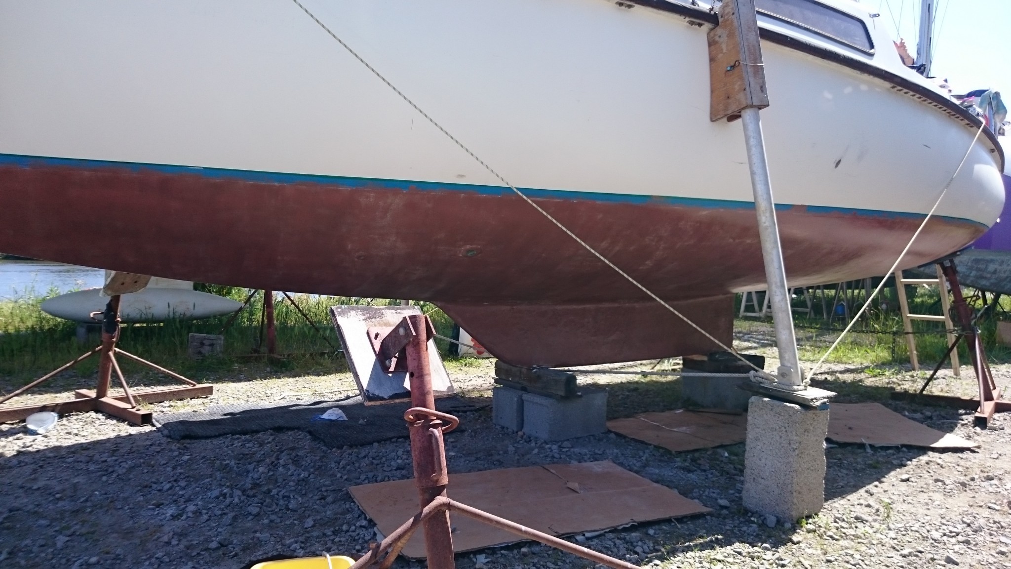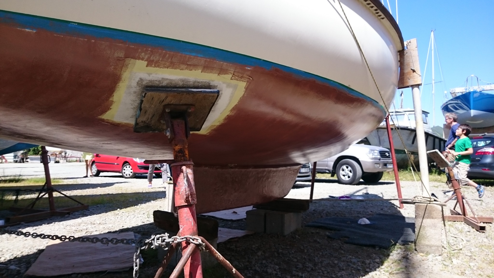 Prochaine étape : changement du calage du bateau (décalé à vendredi, la mise à l’eau prend une semaine de retard) et on remet ça : primaire et coppercoat sous les patins des bers (l’acte 2).