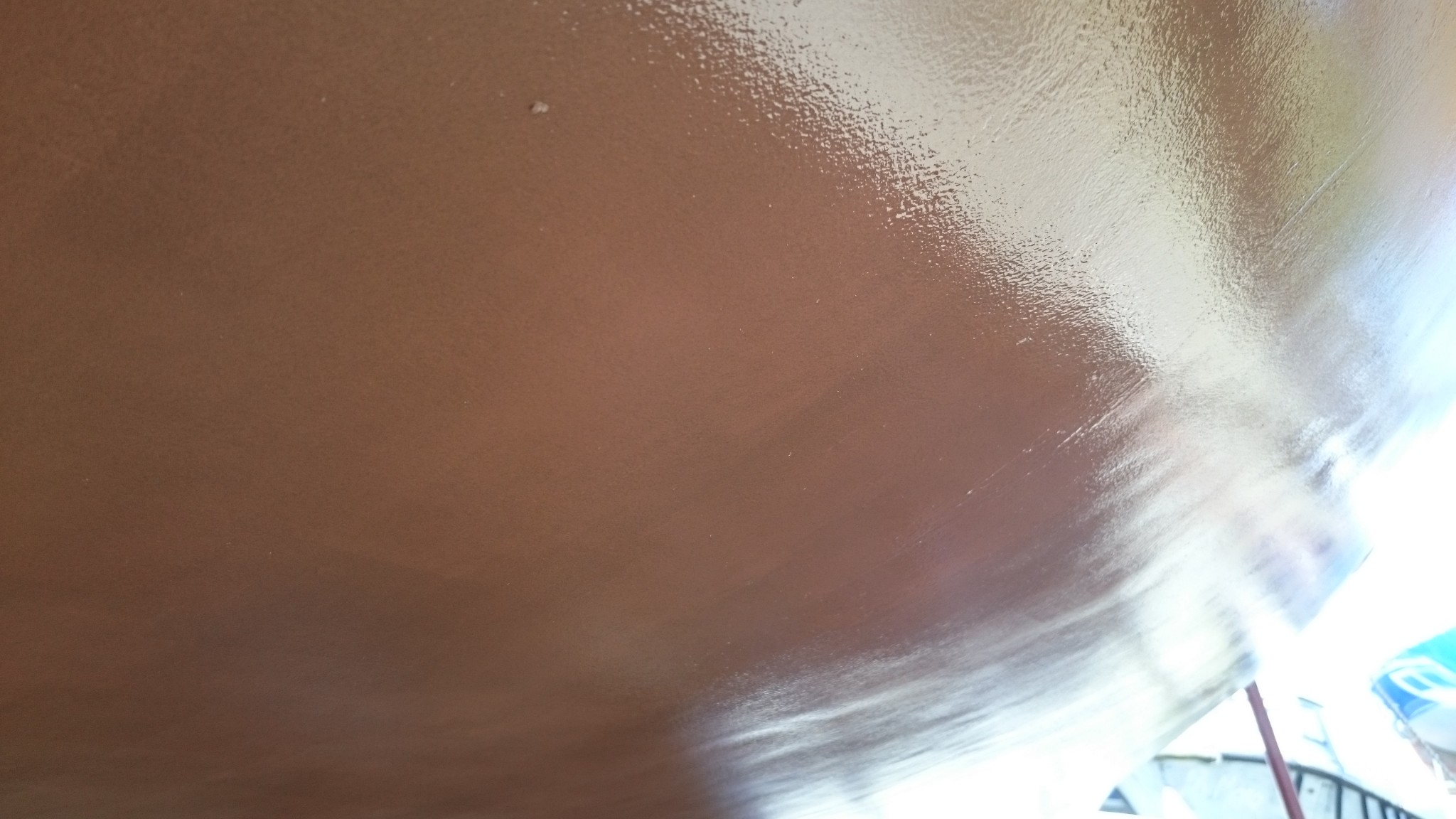 Début de la pose donc vers 12h30, on est censé passer la seconde couche 1h30-1h50 plus tard. Le sentiment après cette première couche, c’est que ce n’est pas facile à poser. Ca accroche mal, et ça ne couvre que très peu. Autre constat : avec un kit de produit (1l de résine, et 2kg de poudre de cuivre), on a presque deux fois trop de produit. Et après cette première couche, on prend un peu peur, ce n’est pas beau du tout. Le mode d’emploi vient avec des photos des rendus des diverses couches, et ça ne ressemble pas totalement à ce que j’ai vu, moins homogène chez nous. Ce qui ne nous empêche pas de faire les malins devant la caméra. Merci les gars, Jess je te dois un pack de bières.