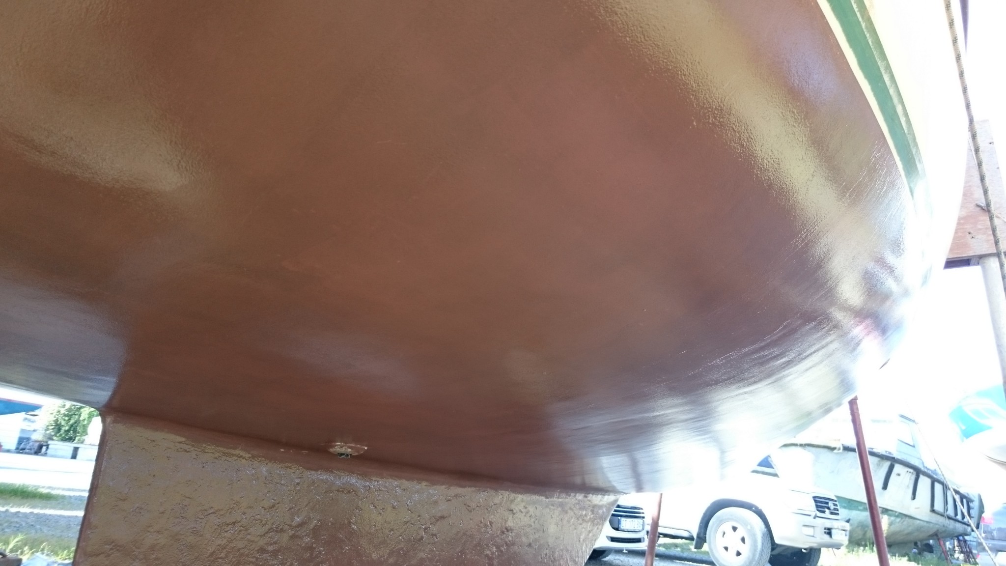 Et le dimanche, on peut enfin poser le coppercoat ! Il est censé faire beau pour quelques jours (en fait les prévisions ont un peu évoluées dans la journée), mon coppercoat est arrivé, j’ai réussi à réunir mon staff, tout est prêt pour passer à l’ultime étape avant la mise à l’eau.
