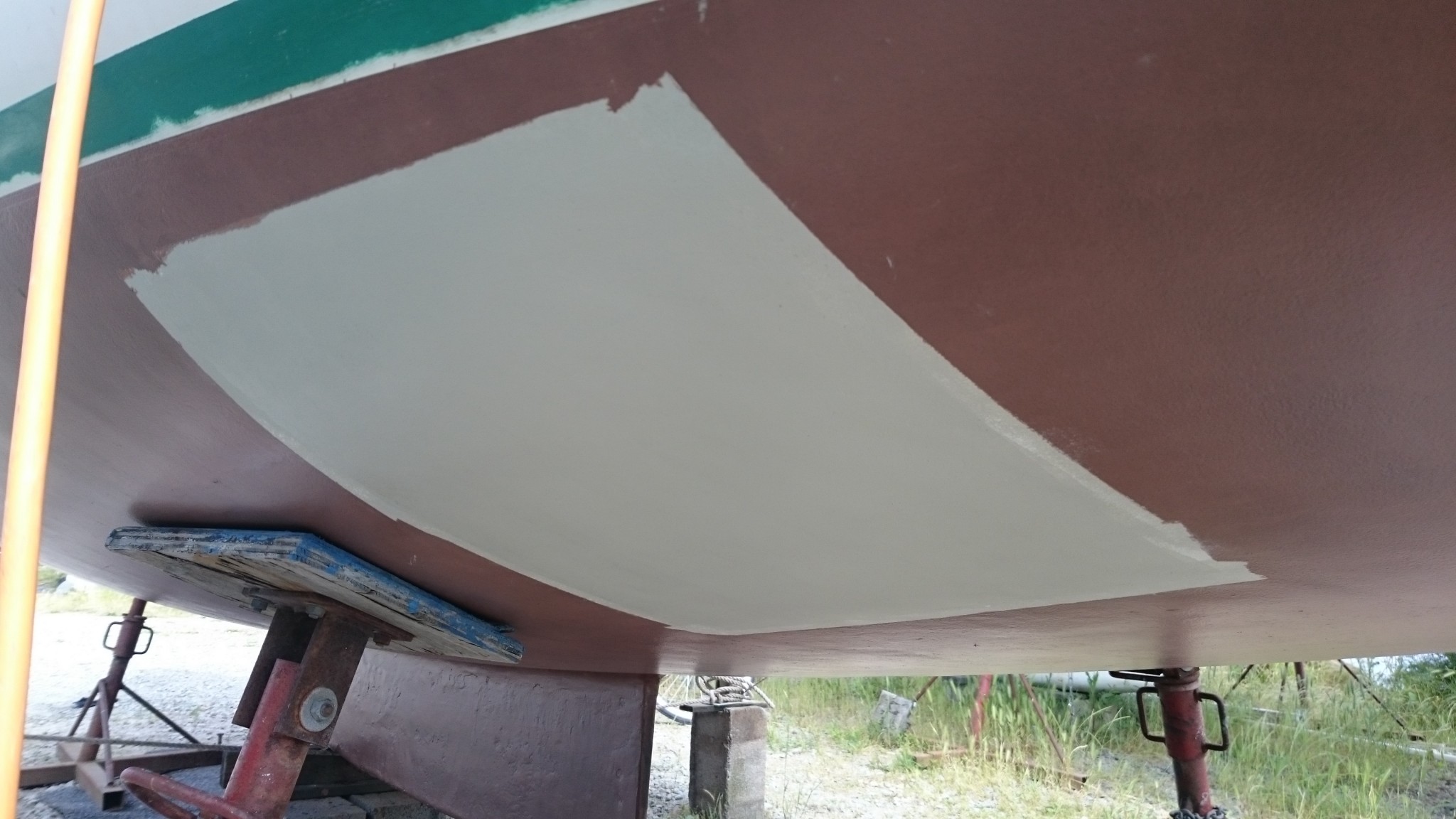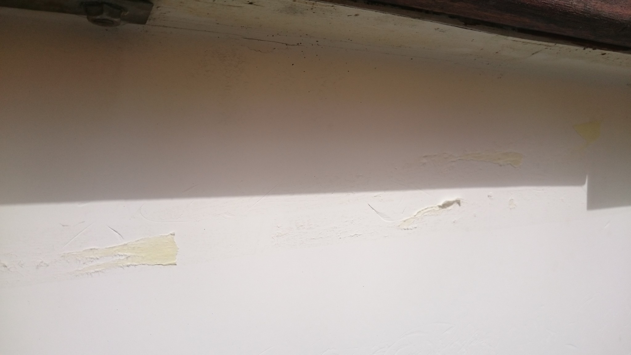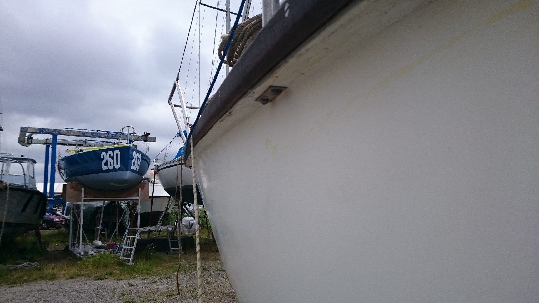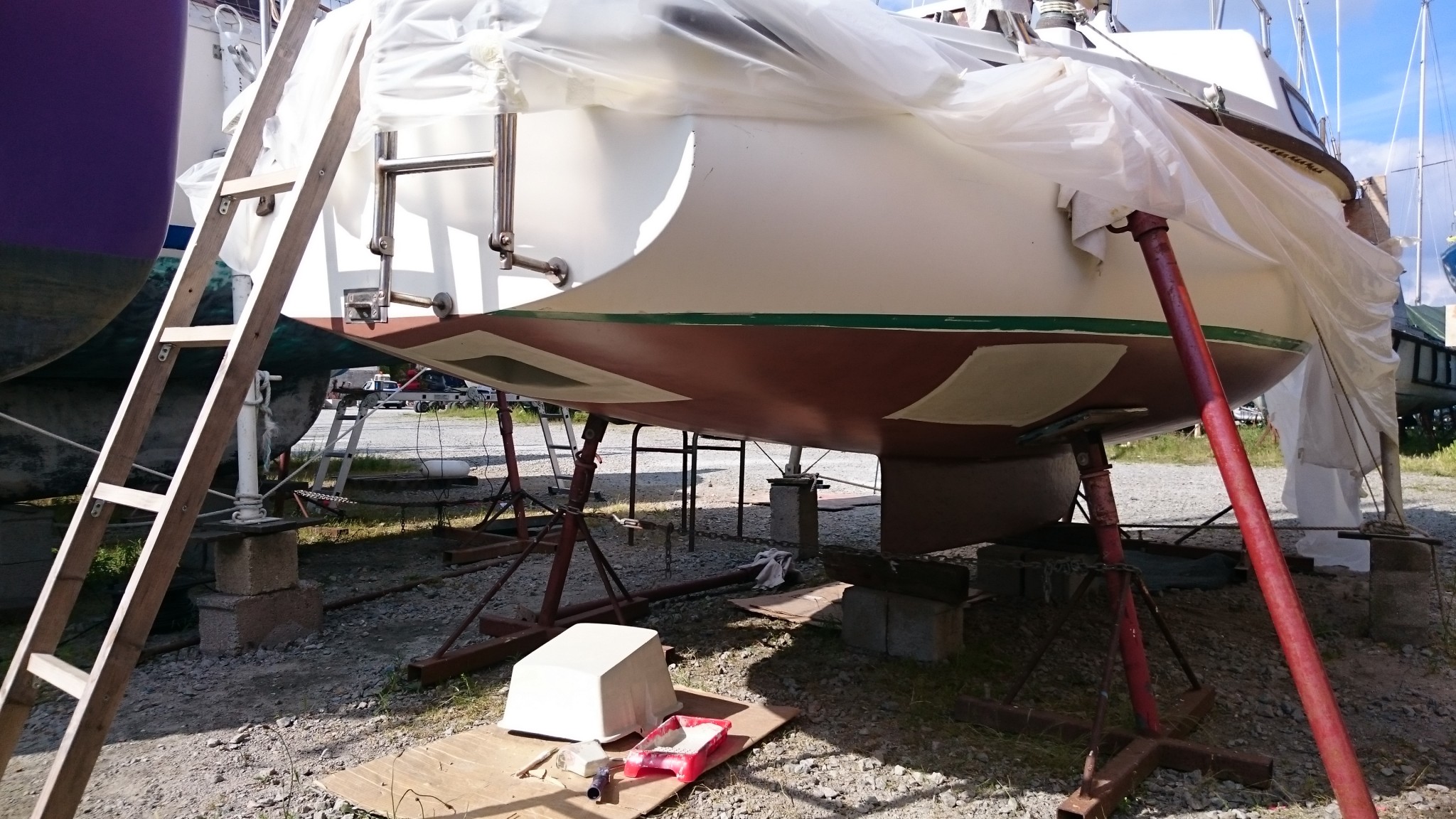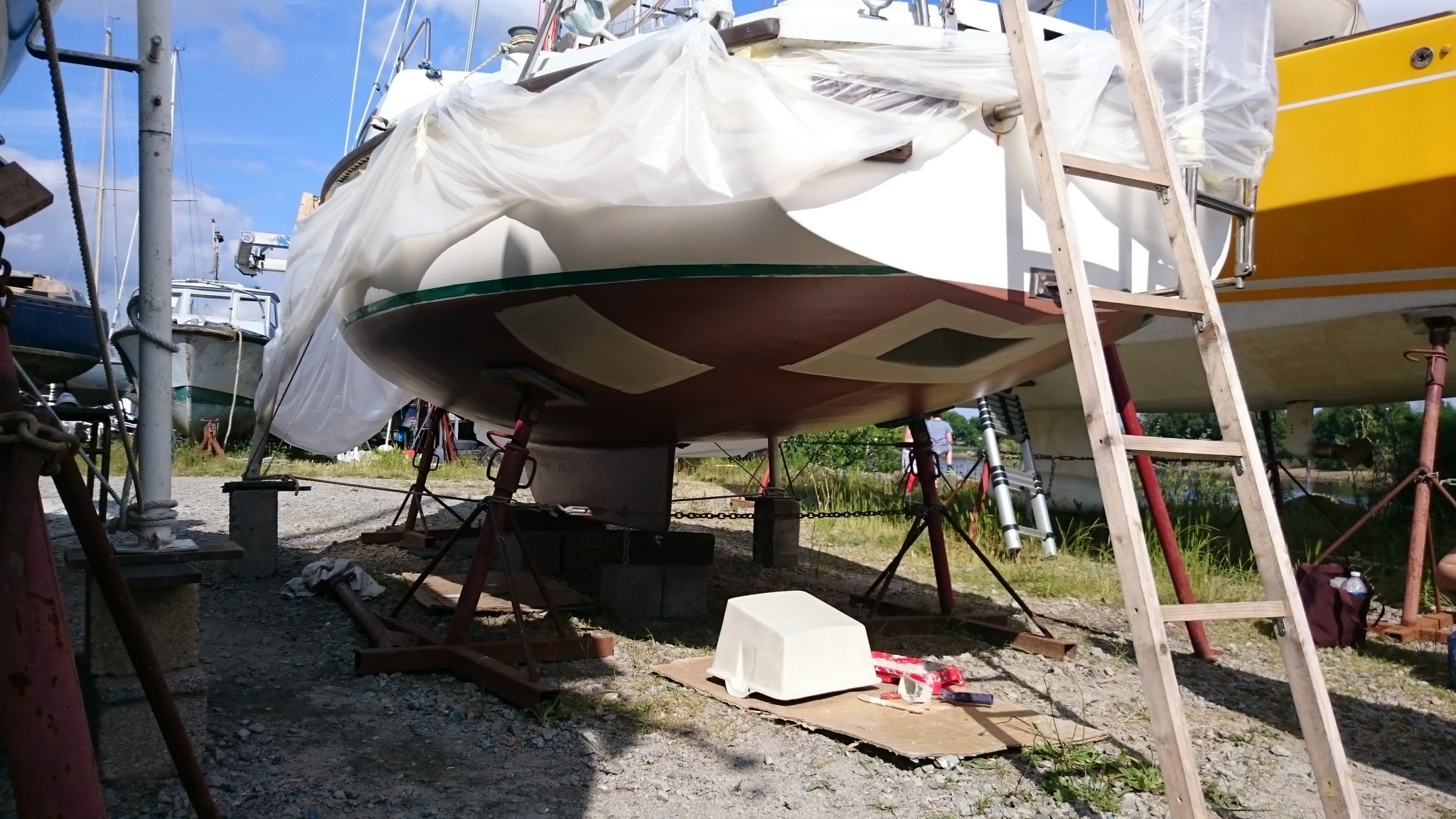 Parmi les projets annexes : le démontage de la jupe, un peu de mastic sur les griffures des oeuvres mortes (merci Fx du coup de main !).