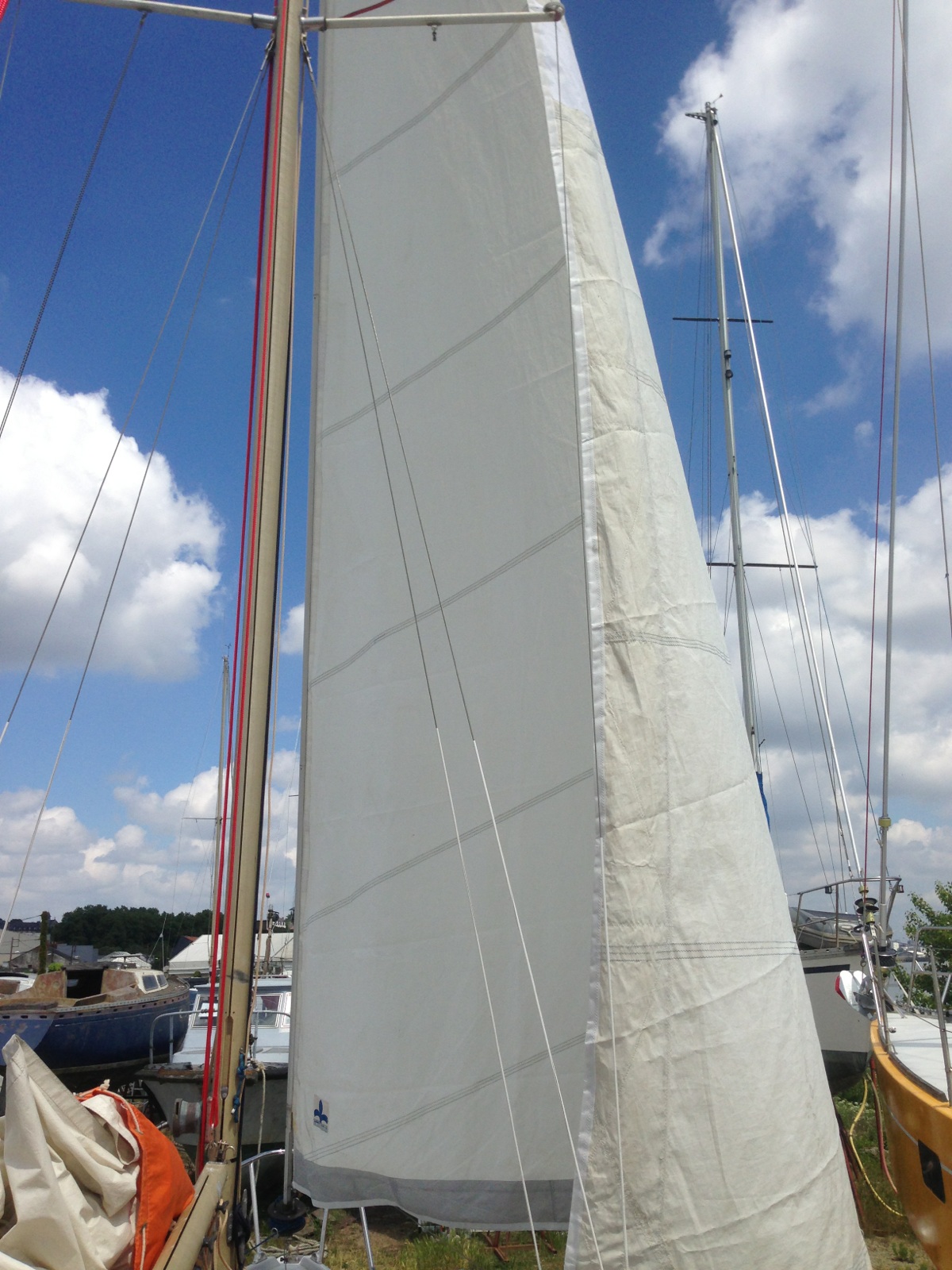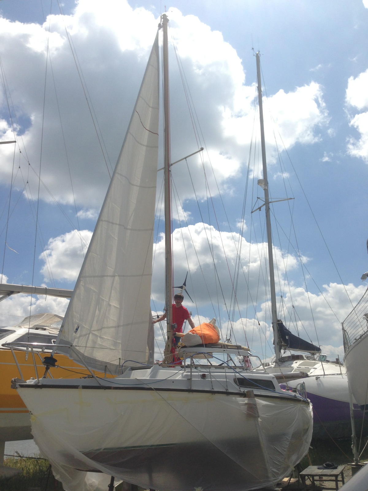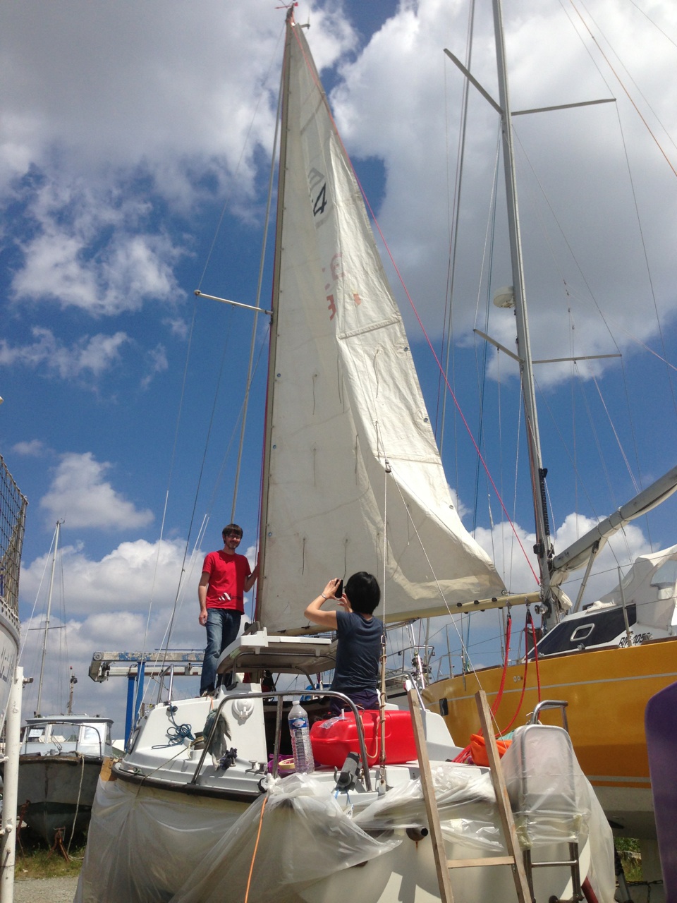 Le dimanche, on pose la première couche de primaire (toujours sous les bers et un peu plus : le puits de moteur et le bac qui permet de reboucher le puits de moteur). Mais avant ça, on hisse les voiles, pour le plaisir mais aussi pour vérifier qu’il ne nous manque rien. Le temps est idéal : un tout petit vent qu’on a de face. Tout est en place, et avec ces voiles volant au vent ça donne une furieuse envie de lever l’ancre (ancre dont j’ai enlevé un mètre de chaîne pas bien vaillant) ! Vraiment, ça commence à sentir très bon !