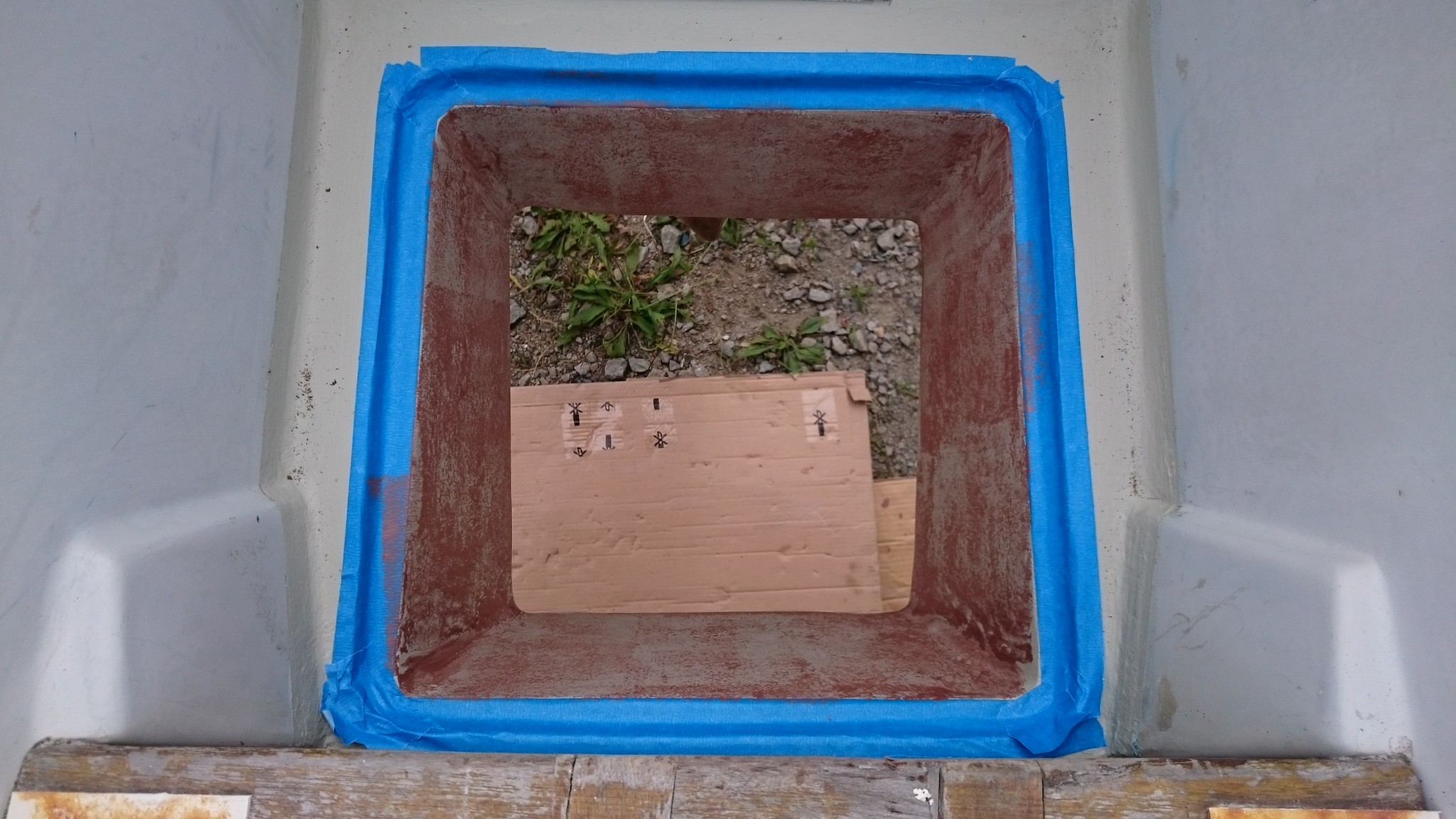 Dimanche, je trouve vite qu’il pleut pas mal plus que je ne l’envisageais, et décide de me rendre sur le bateau pour voir comment ça se passe. Et ça se passe pas si bien. Ce n’est pas non plus une catastrophe, mais quelques coulures sur la peinture encore fraîche et quelques éclaboussures aussi sur le safran et le bac du puits de moteur. Je décide donc de rentrer dans le carré le safran et le bac, la peinture n’est pas parfaitement sèche, mais en surface ça ne marque plus. Et en remontant le safran, je le cogne un peu partout, griffant largement certaines parties. Moi qui était si fier de ma pose la veille, ça ne me met pas trop en joie. Bon, et pour les coulures, je bâche un peu plus largement et organise au scotch de masquage quelques canalisations le long de la coque (une goutte qui dégouline le long de la coque est facilement déviée par un simple scotch sur son passage).