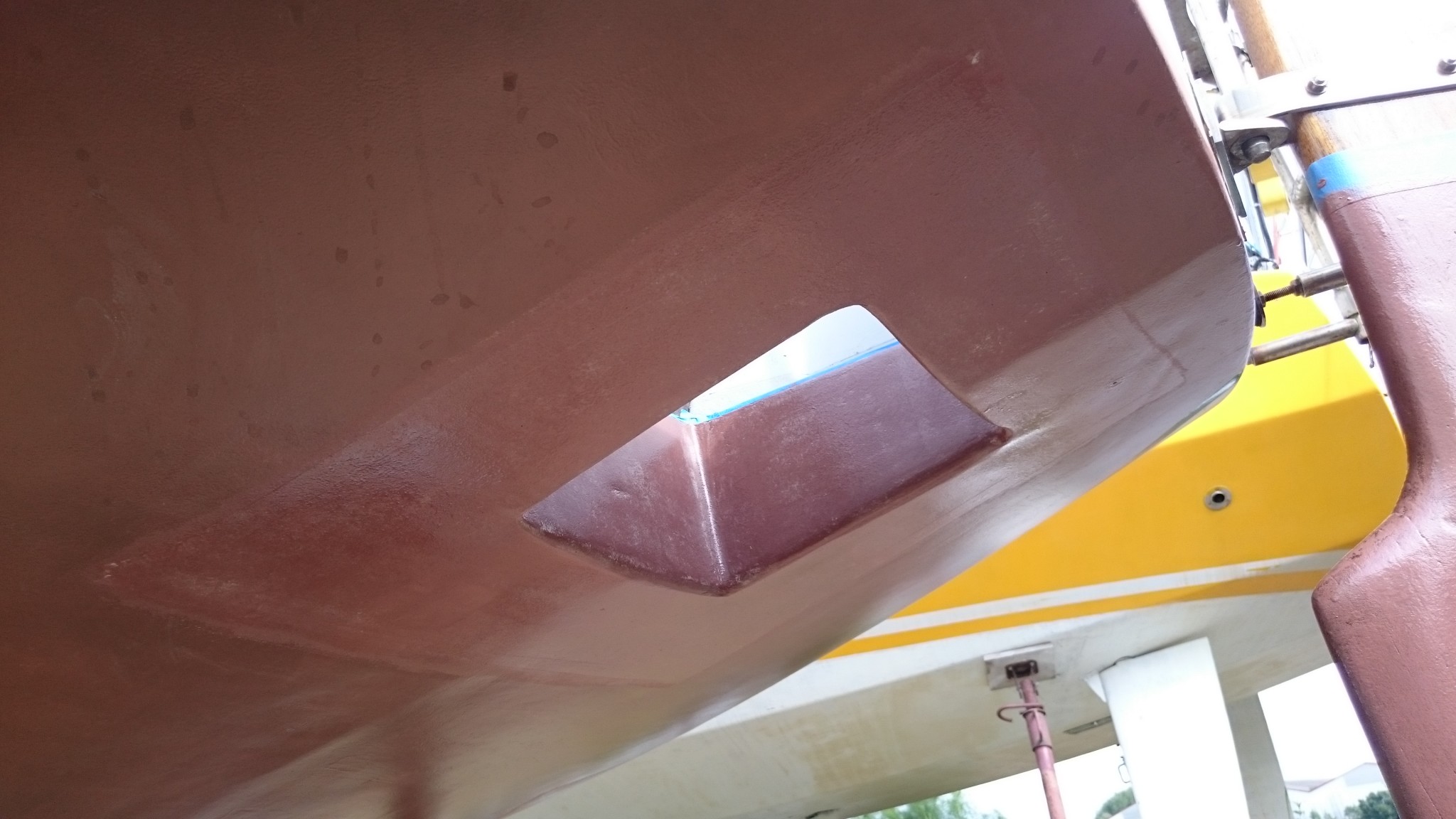 La bonne nouvelle : le carénage est achevé, et les quelques décolorations liées à la pluie ne me semblent pas vraiment problématiques (on vérifiera ça mercredi), pour la moins bonne, le safran qui partait pour être magnifique le sera beaucoup moins. Ca ne m’empêchera pas de prendre la mer dans 2 semaines. Enfin !