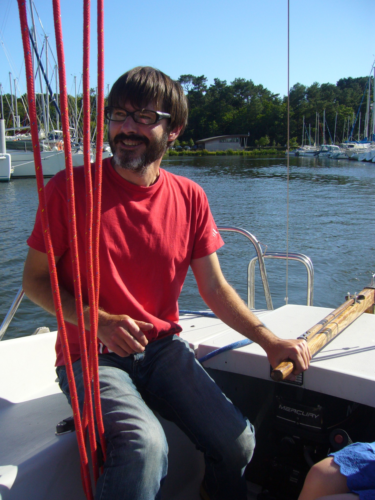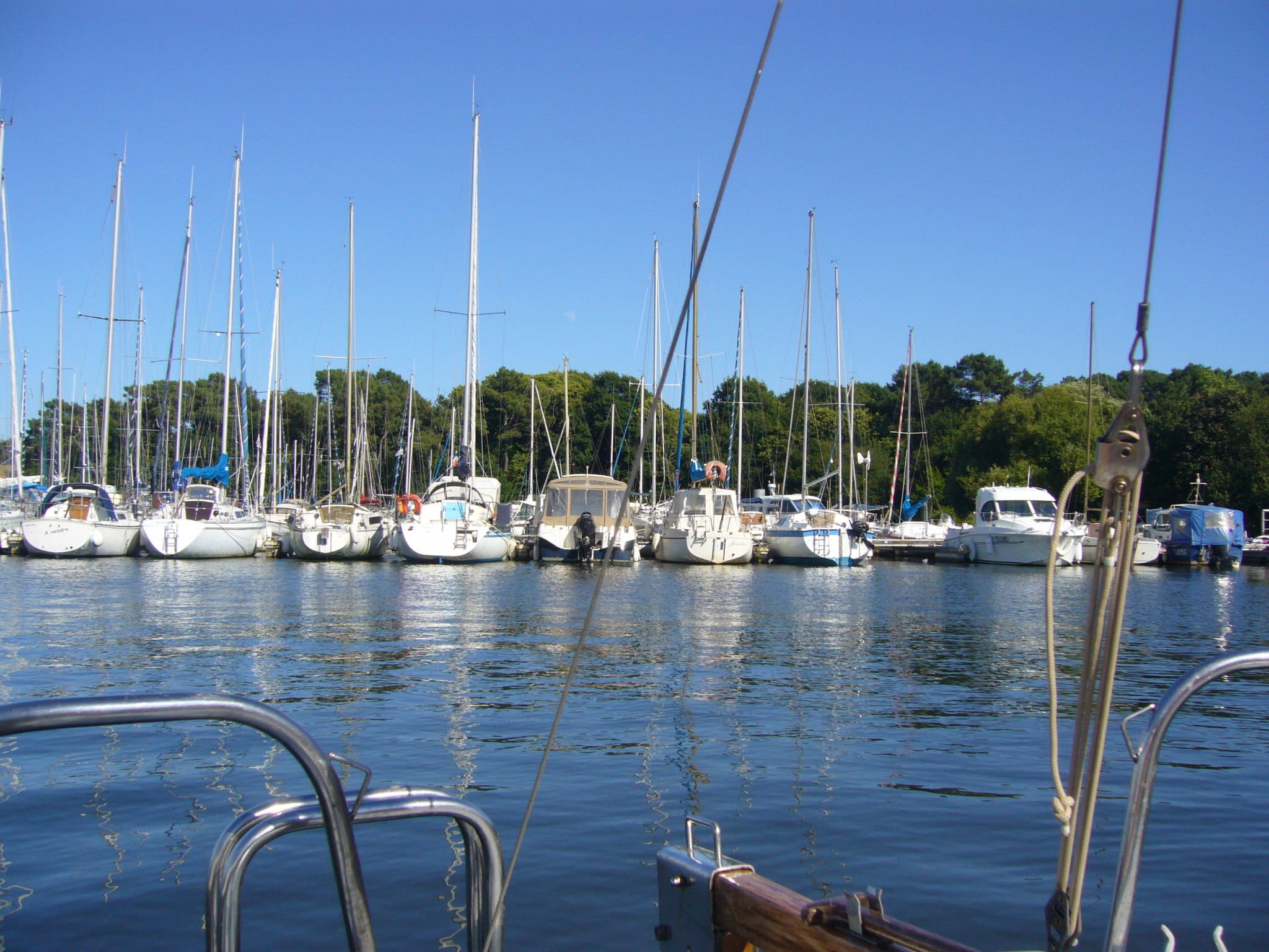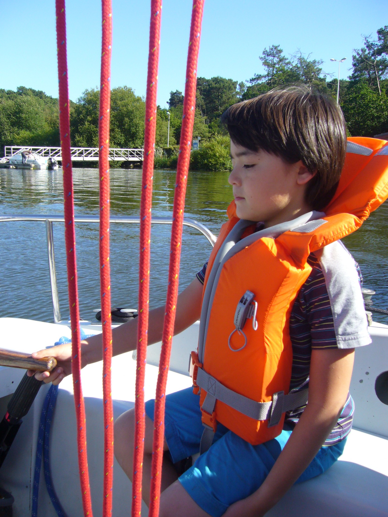 On ne se démonte pas, on établit les voiles, et quelques bords de vent arrière nous emmènent jusqu’à voir La Roche Bernard. Demi tour et quelques bords de près pour revenir au port d’attache. Quelques virements pas très réussi aussi, mais pas de catastrophe. Voyant nos femmes s’impatienter, on finira la balade au moteur, en pompant quand il montre des signes d’essoufflement. Et une manoeuvre fièrement accomplie pour se parquer au ponton (finalement je m’en sort pas si mal que ça avec ces manoeuvres qui me flippaient tant).