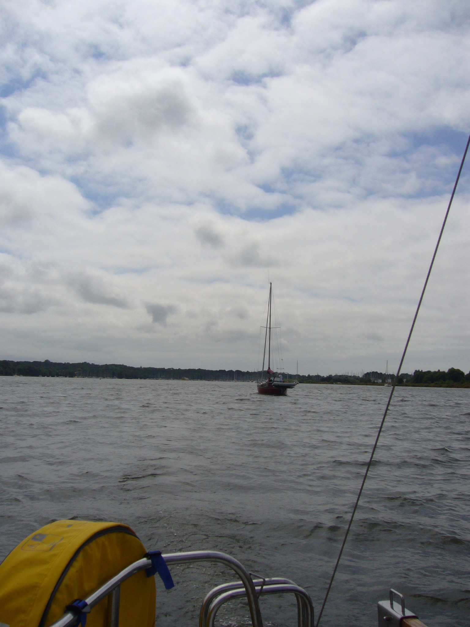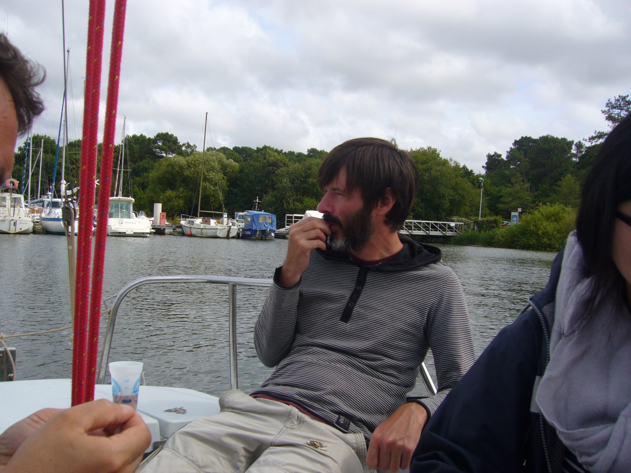 Le 5 juillet, départ de Nantes sous une pluie très peu engageante, mais arrivée au ponton avec le soleil et mon ami Jean qui devrait faire la prochaine descente en Vendée avec moi. Le moteur, mal luné, nous aura laissé décoller vers midi seulement. Jean voulait pêcher en mer, vu l’heure et la marée, ce sera finalement un petit tour sur la Vilaine, avec un petit vent d’ouest : vent arrière au départ, près au retour, assisté du moteur.