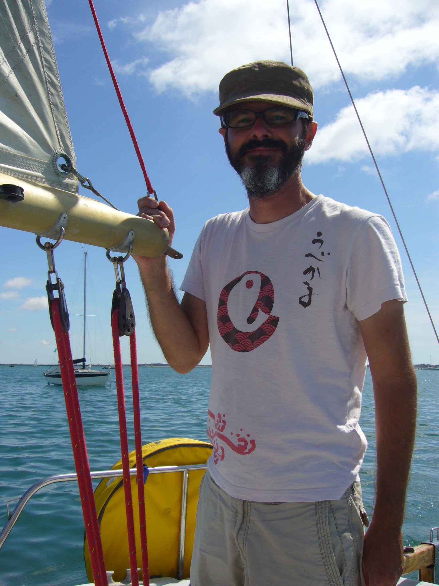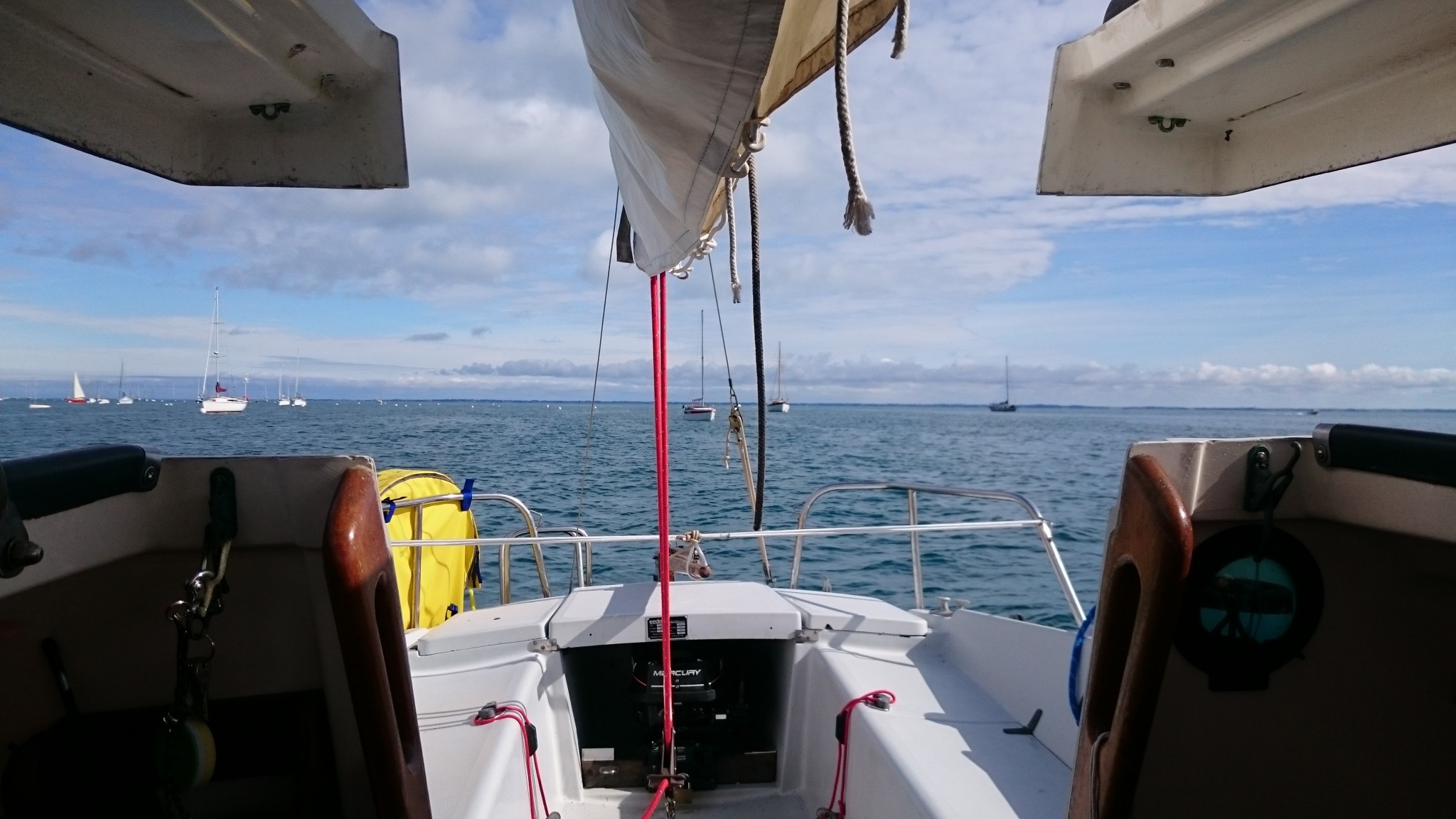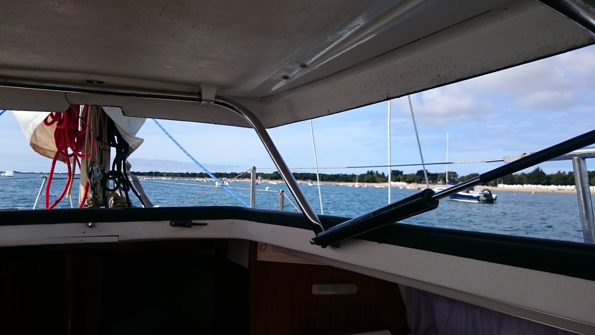 Et puis une seconde sortie en famille qui commençait plutôt très bien, le Petit à la table à carte, à faire des relevés au compas et à s’essayer à la règle de Cras, un petit incident en cours de route a rafraîchi l’ambiance, mais sans altérer mon envie de poursuivre ce dessein. Et quelques autres sorties ensuite bien agréables ainsi que quelques « trucs à aller chercher » dans le bateau, prétextes quotidiens à quelques instants à se laisser porter par les vagues, le bateau accroché à sa bouée…