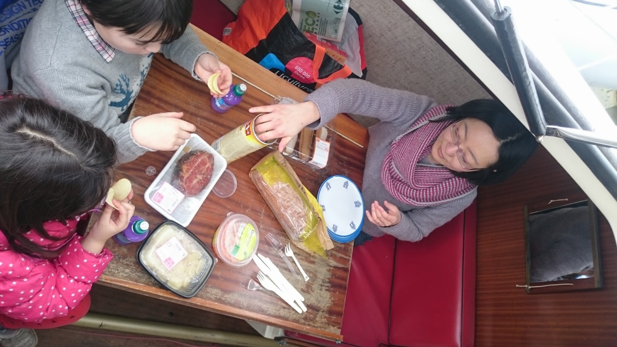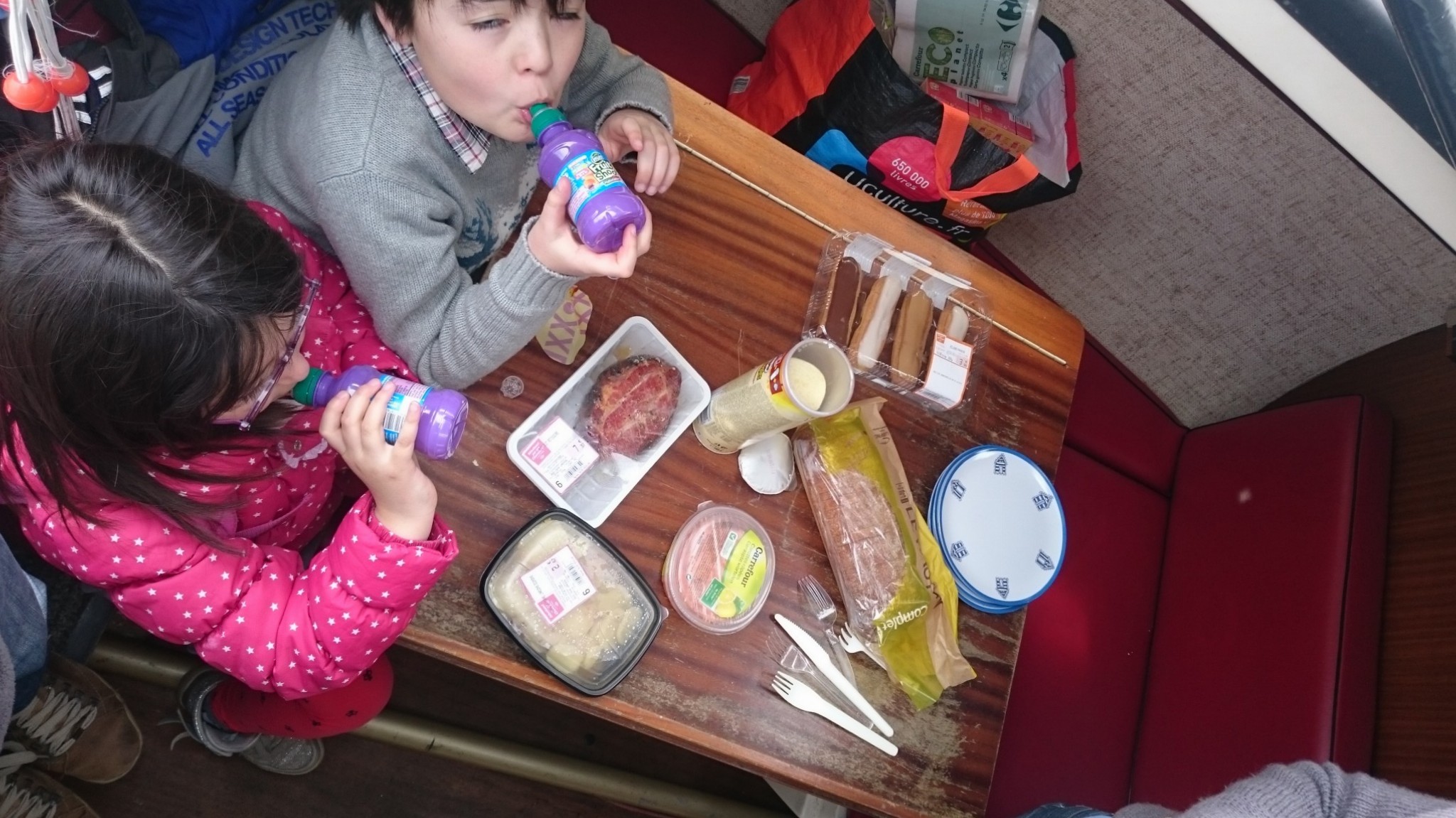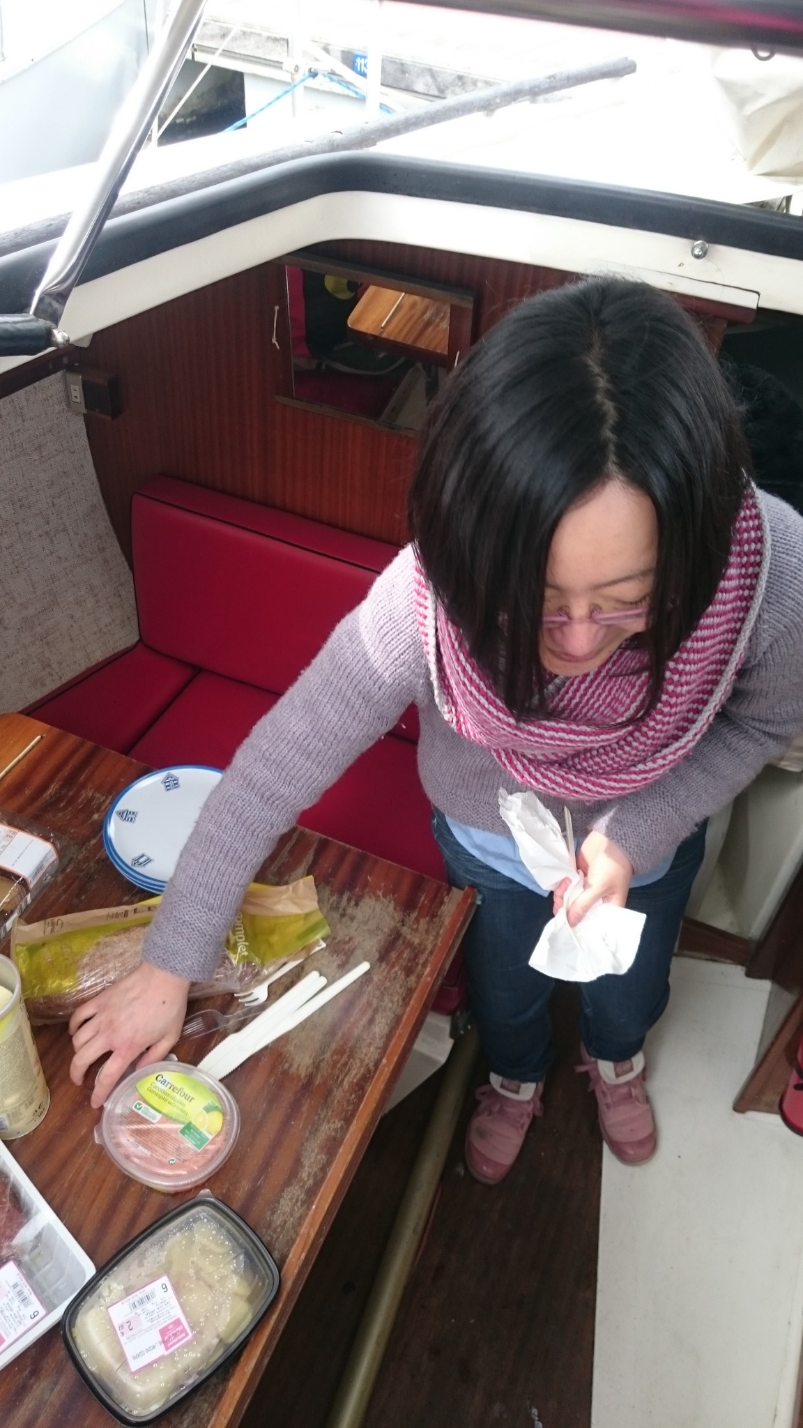 Ça s’est décidé un peu au dernier moment, mais aujourd’hui, et pour la première fois de l’année on déjeune sur le bateau sous un soleil légèrement voilé. Pas de navigation au programme, le moteur n’est pas sur sa chaise et les voiles reposent dans une célèbre grotte du centre ville (private joke, comprenne qui pourra). Au lieu de ça, quelques courses à La Roche Bernard, un roti de porc encore chaud, ses patates goûteuses et quelques autres délices dégustés sur l’eau.
