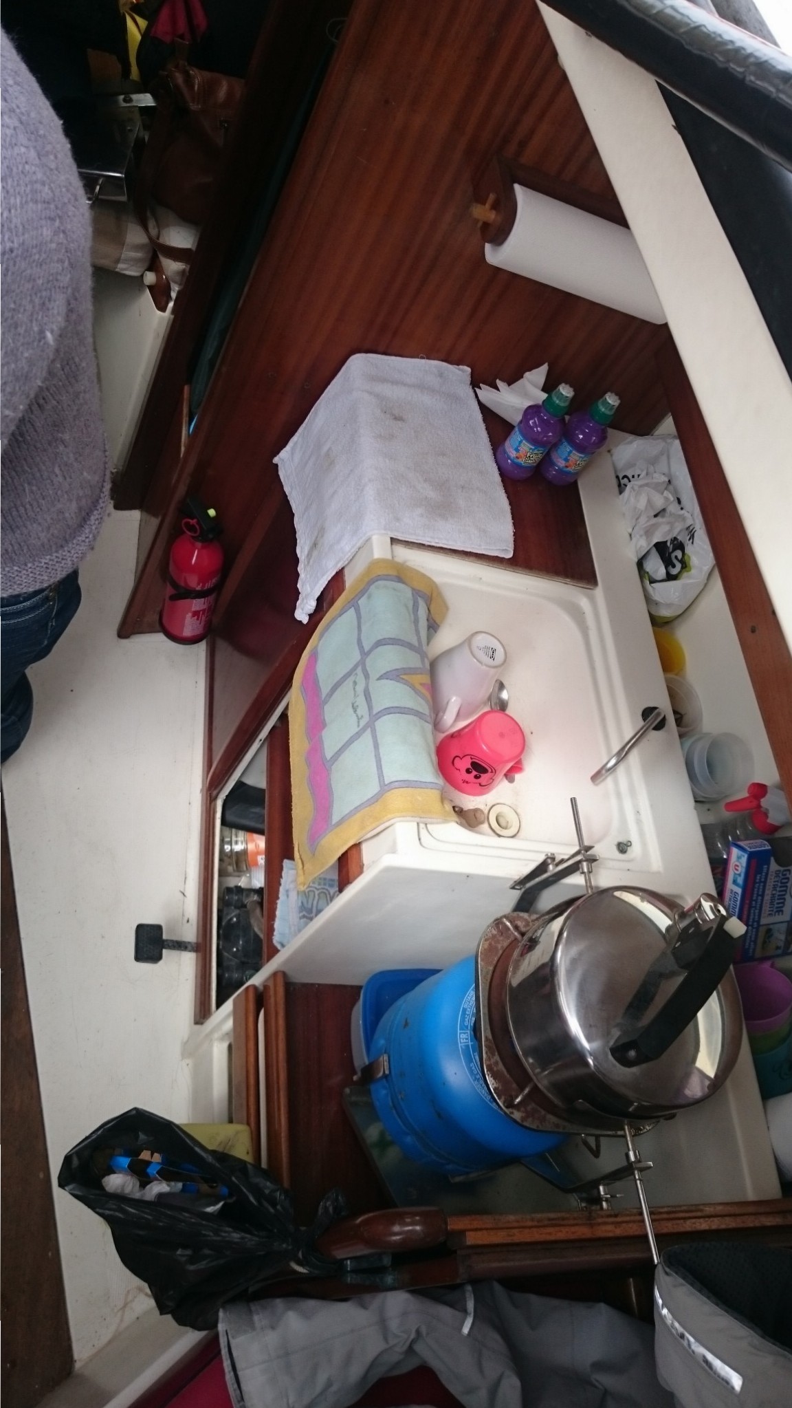 L’occasion aussi pour moi de vaquer à quelques menues occupations pour préparer la mise sur terre plein programmée semaine prochaine. On commence par recharger les batteries qui se sont totalement vidées pendant l’hiver (j’aurais du les débrancher, mais n’y ai pas pensé). Et puis remettre le safran en place que j’avais mis au sec pour l’hiver. Démonter la bôme aussi car un démâtage est prévu. Fixer une petite cadène achetée en juin dernier au fond du cockpit. Tenter de gonfler deux pare-battages achetés la semaine passée, échouer sur cette tâche, bon sang, quel type d’embout faut-il utiliser, si j’ai fini par réussir à gonfler le premier, il se dégonfle aussitôt, je n’ai du coup pas insisté pour le second.