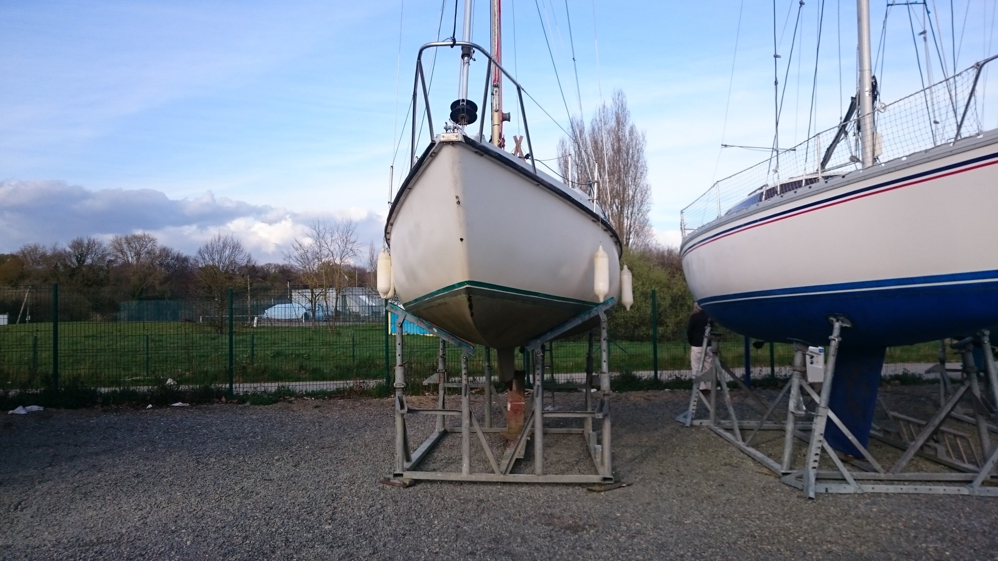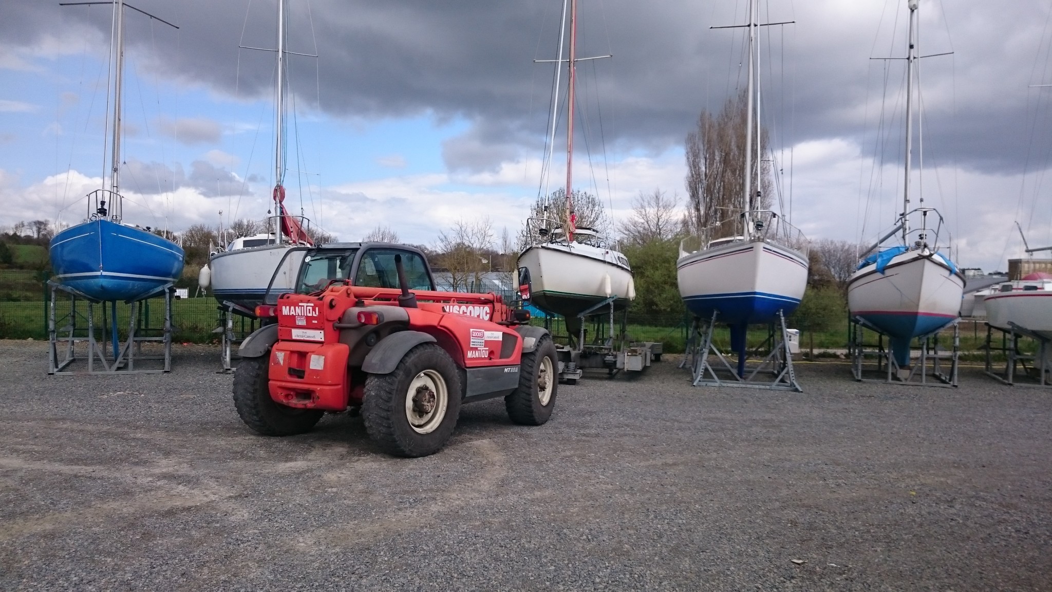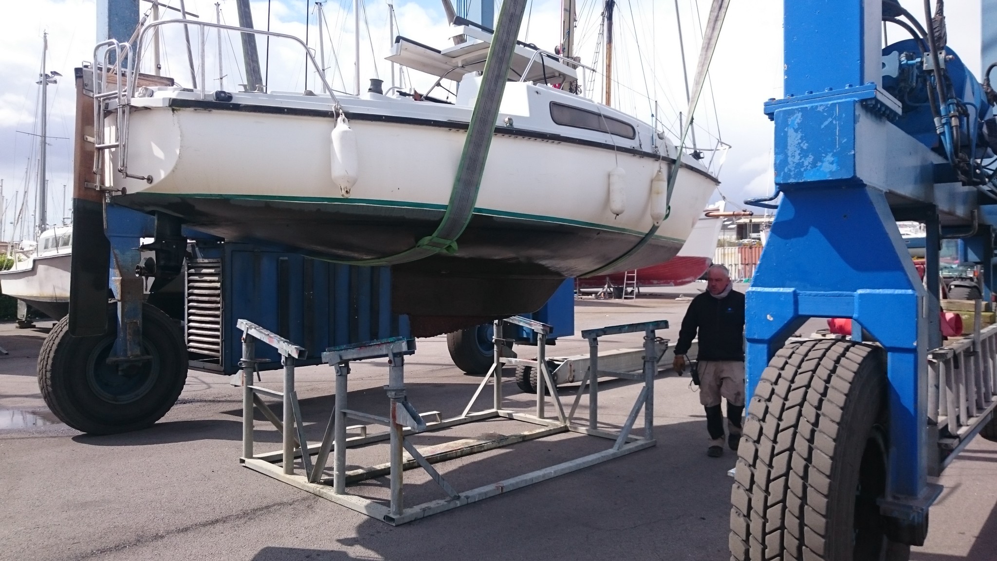 Je note les différences entre les chantiers. Notre premier chantier n’avait pas de grue et uniquement un ber hydraulique. Le second avait les deux mais n’avait utilisé que la grue pour la mise à l’eau. Mais le calage se faisait avec des bers simples, avec des chaines pour les solidariser. Ici la grue lève le bateau, le pose sur un ber à quatre pieds, un calage très rapide et à quatre mains se fait avant que le tracteur ne soulève le ber avec une plateforme hydraulique et emmène le bateau à son emplacement. Ça me laisse une forte impression d’efficacité !