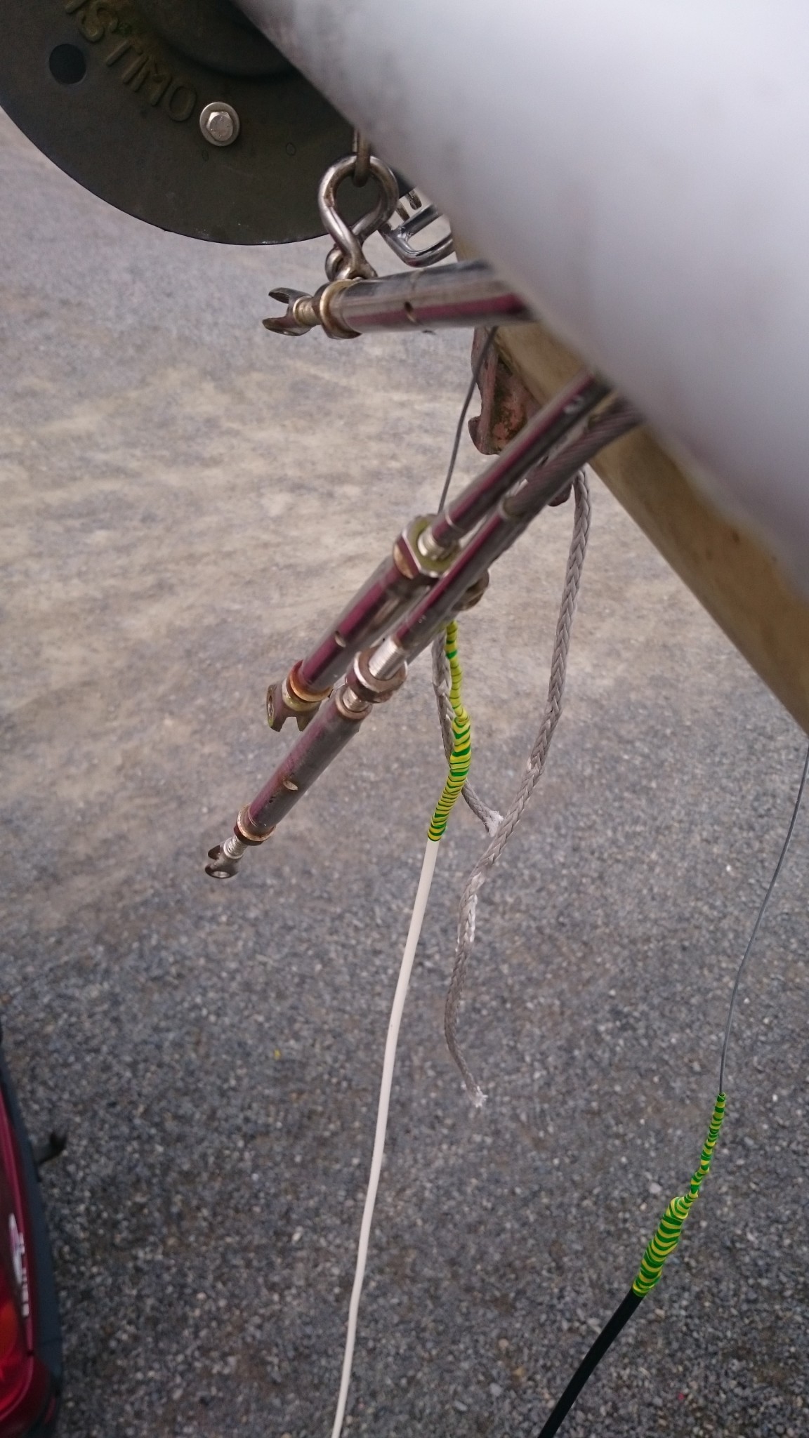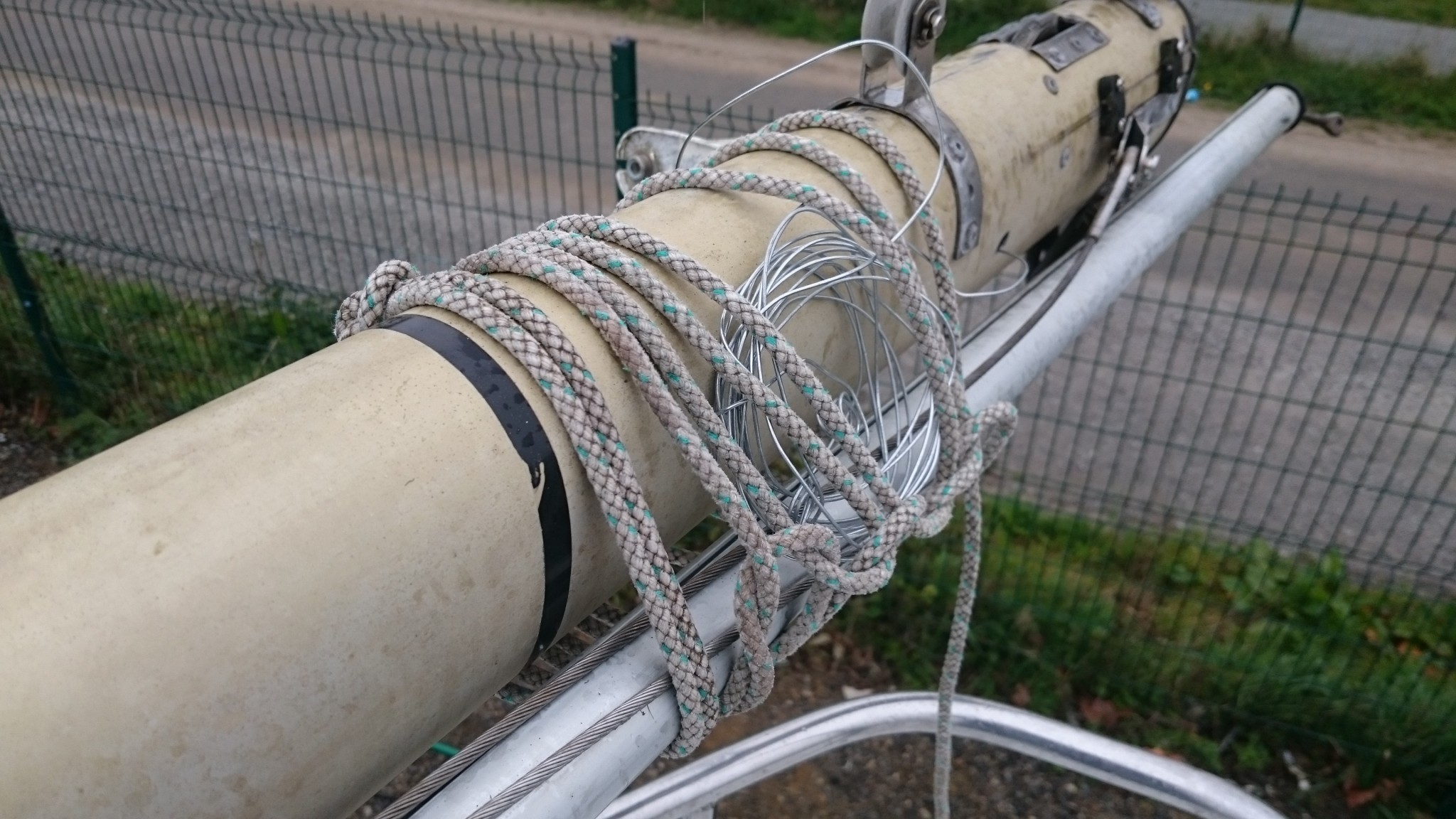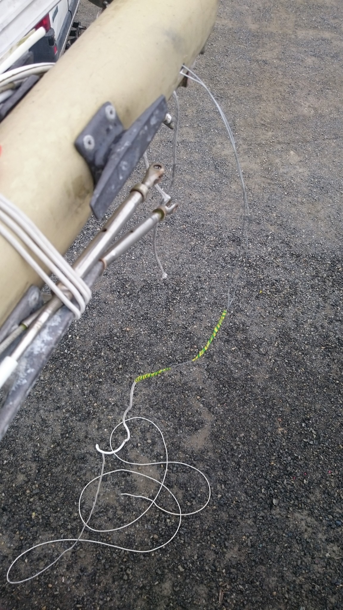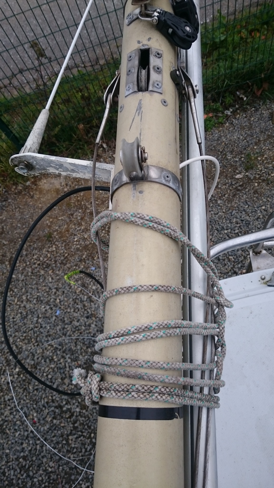 Le plan B étant d’utiliser le câble VHF, qui lui est déjà passé, comme messager de deux messagers (vous me suivez ?), ces deux messagers remonteront alors un nouveau câble VHF pour l’un et le cable électrique pour l’autre. J’accroche donc deux fils de fer au bout du câble VHF, en prenant soin de les passer chacun dans son trou, et si ça coince assez régulièrement, quelques allers-retour entre l’avant et l’arrière me feront pousser un cri de victoire lorsque le chaterton fait son apparition en pied de mât. Le voisin soulagé pour moi me met en garde : « c’est toujours là que ça déconne ». Je le sais, aussi je prend toutes les précautions pour tirer de là me deux fils de fer.