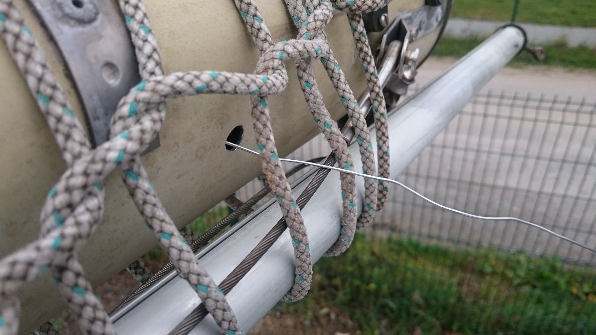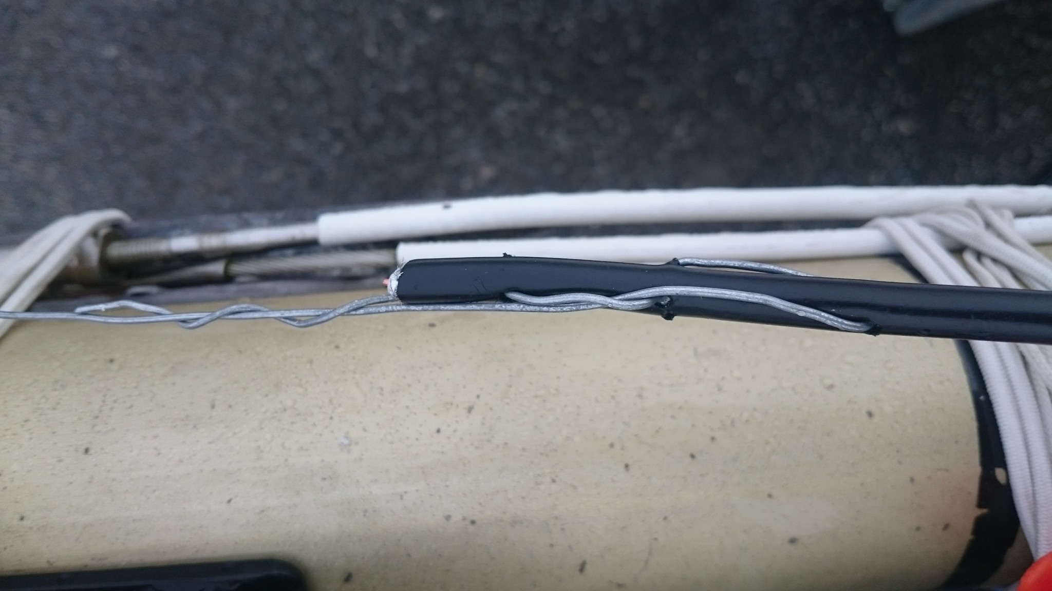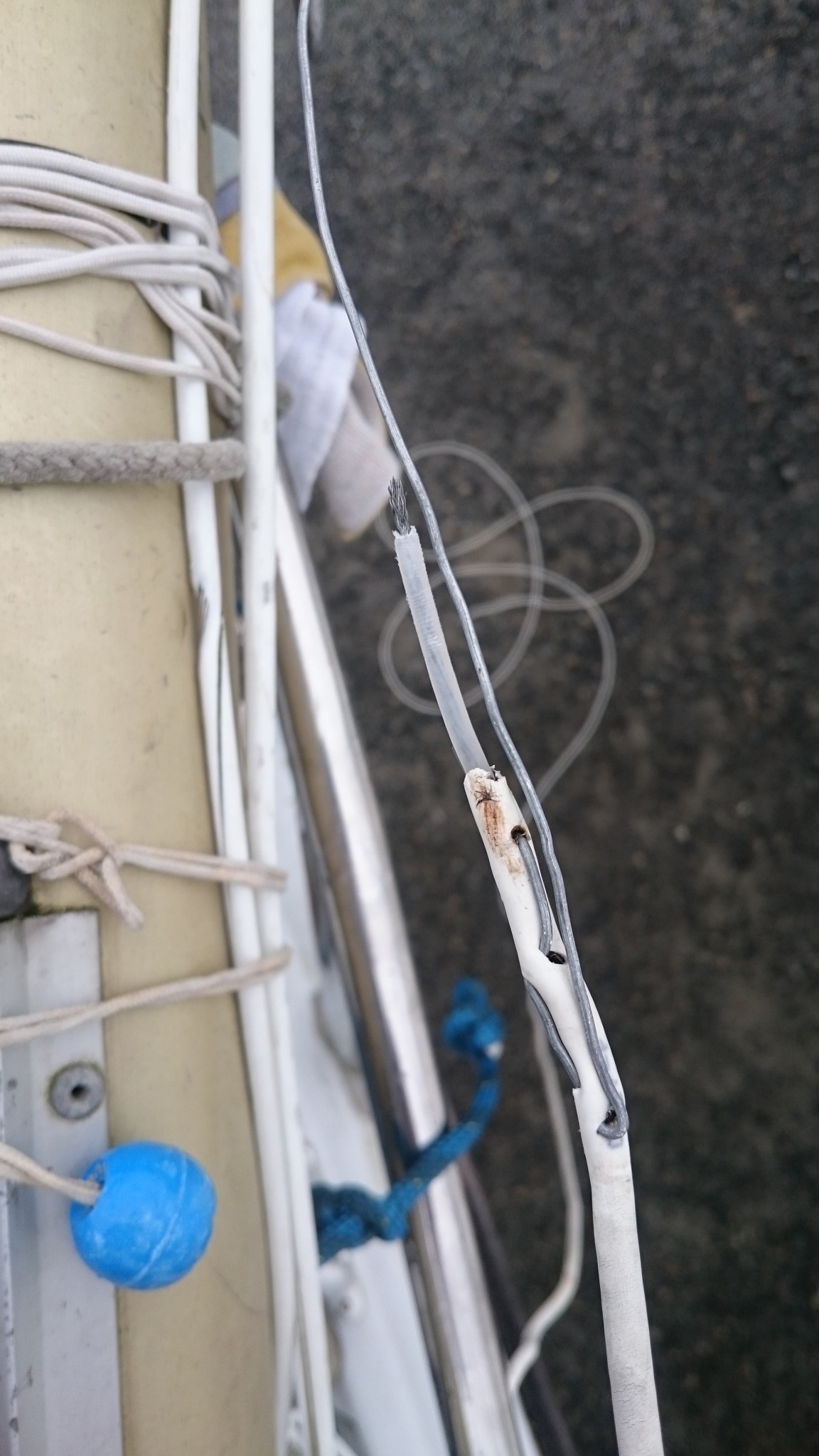 Le plan B étant d’utiliser le câble VHF, qui lui est déjà passé, comme messager de deux messagers (vous me suivez ?), ces deux messagers remonteront alors un nouveau câble VHF pour l’un et le cable électrique pour l’autre. J’accroche donc deux fils de fer au bout du câble VHF, en prenant soin de les passer chacun dans son trou, et si ça coince assez régulièrement, quelques allers-retour entre l’avant et l’arrière me feront pousser un cri de victoire lorsque le chaterton fait son apparition en pied de mât. Le voisin soulagé pour moi me met en garde : « c’est toujours là que ça déconne ». Je le sais, aussi je prend toutes les précautions pour tirer de là me deux fils de fer.