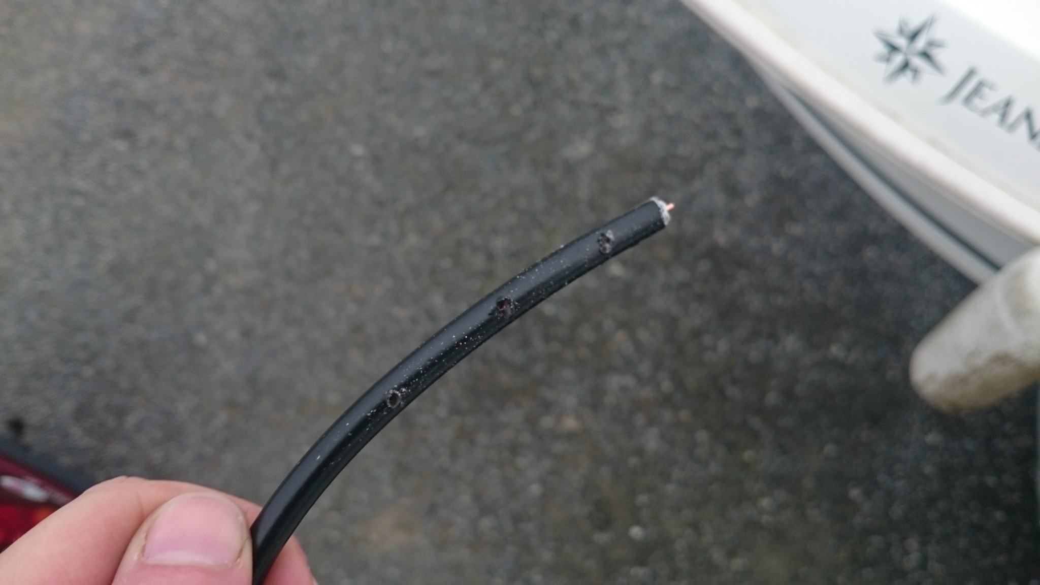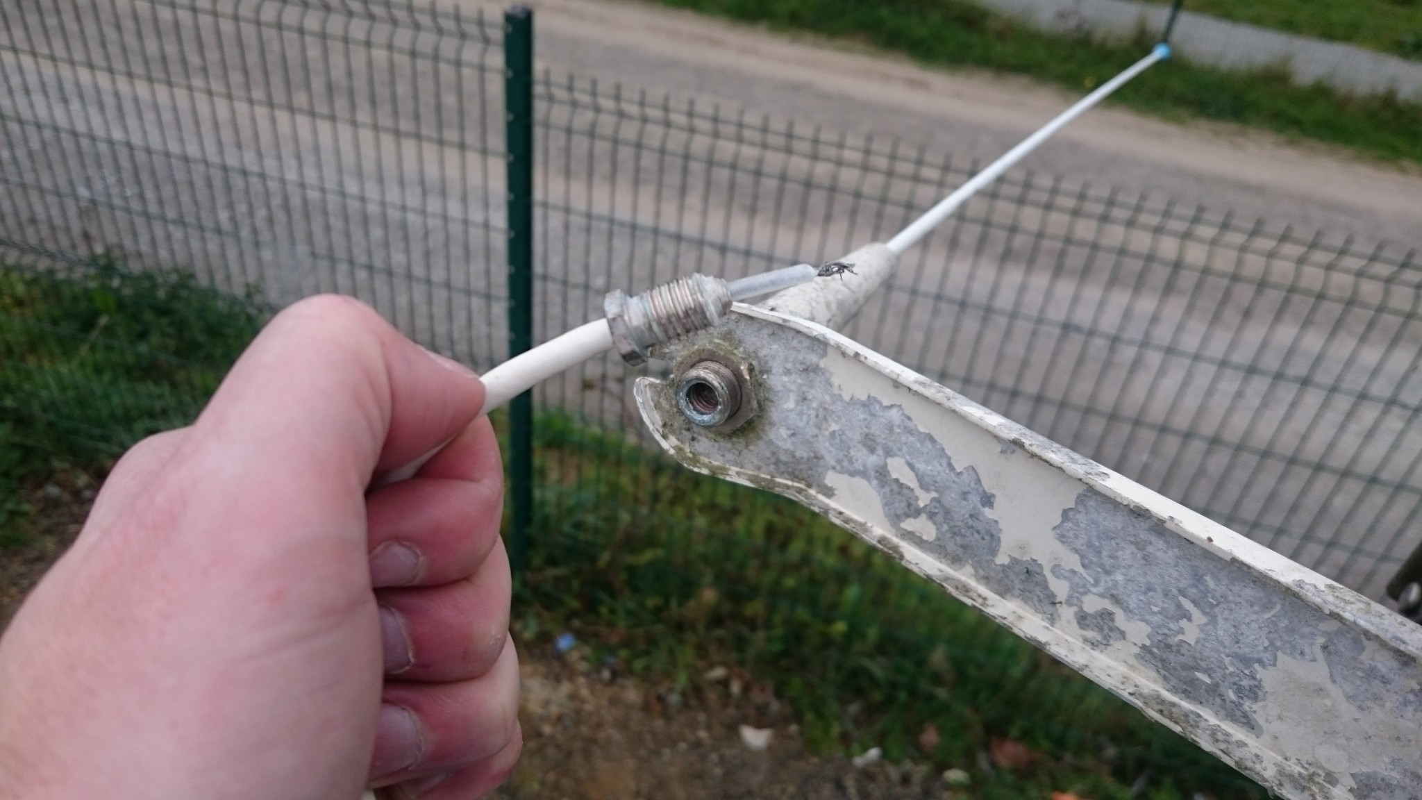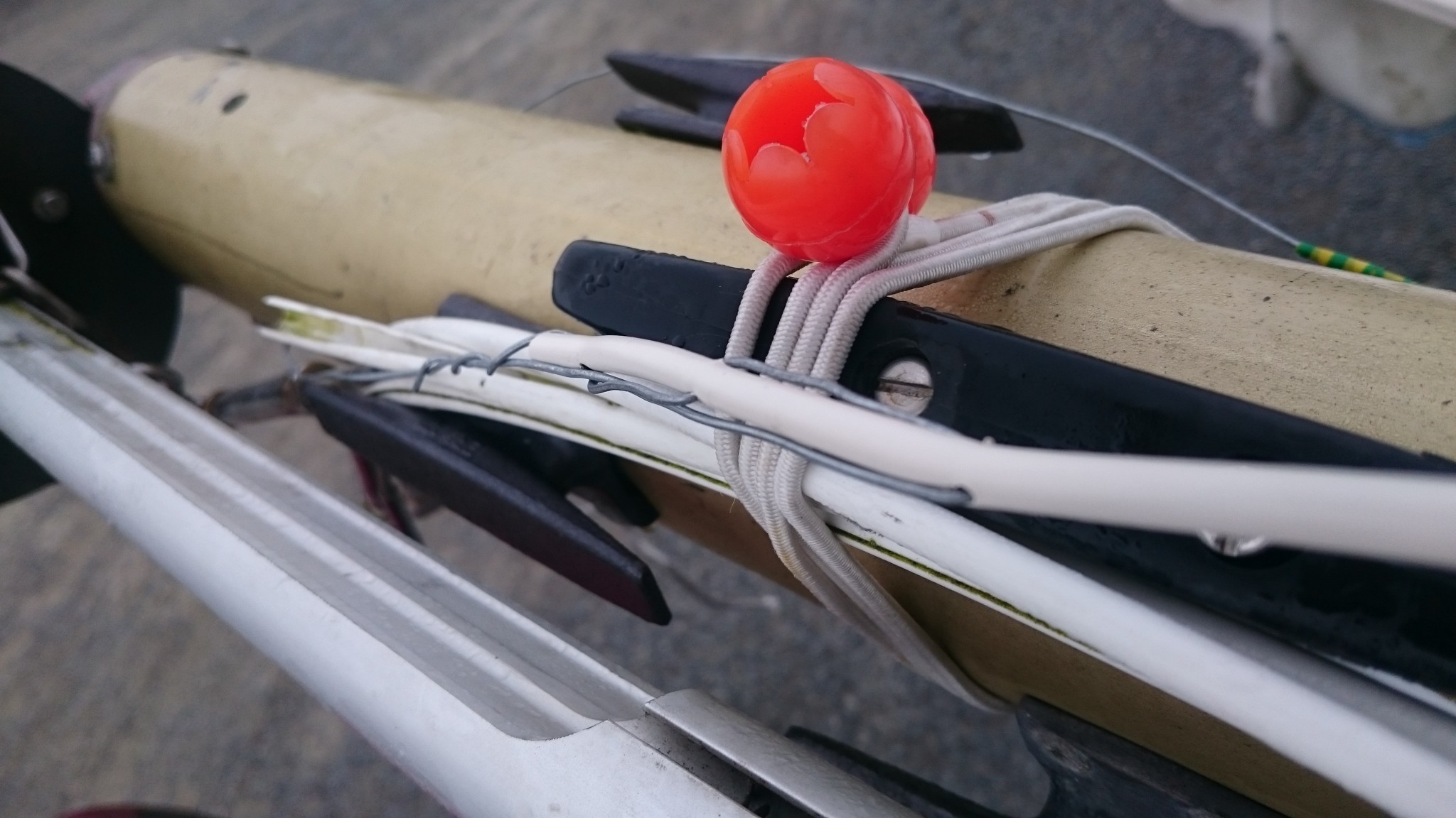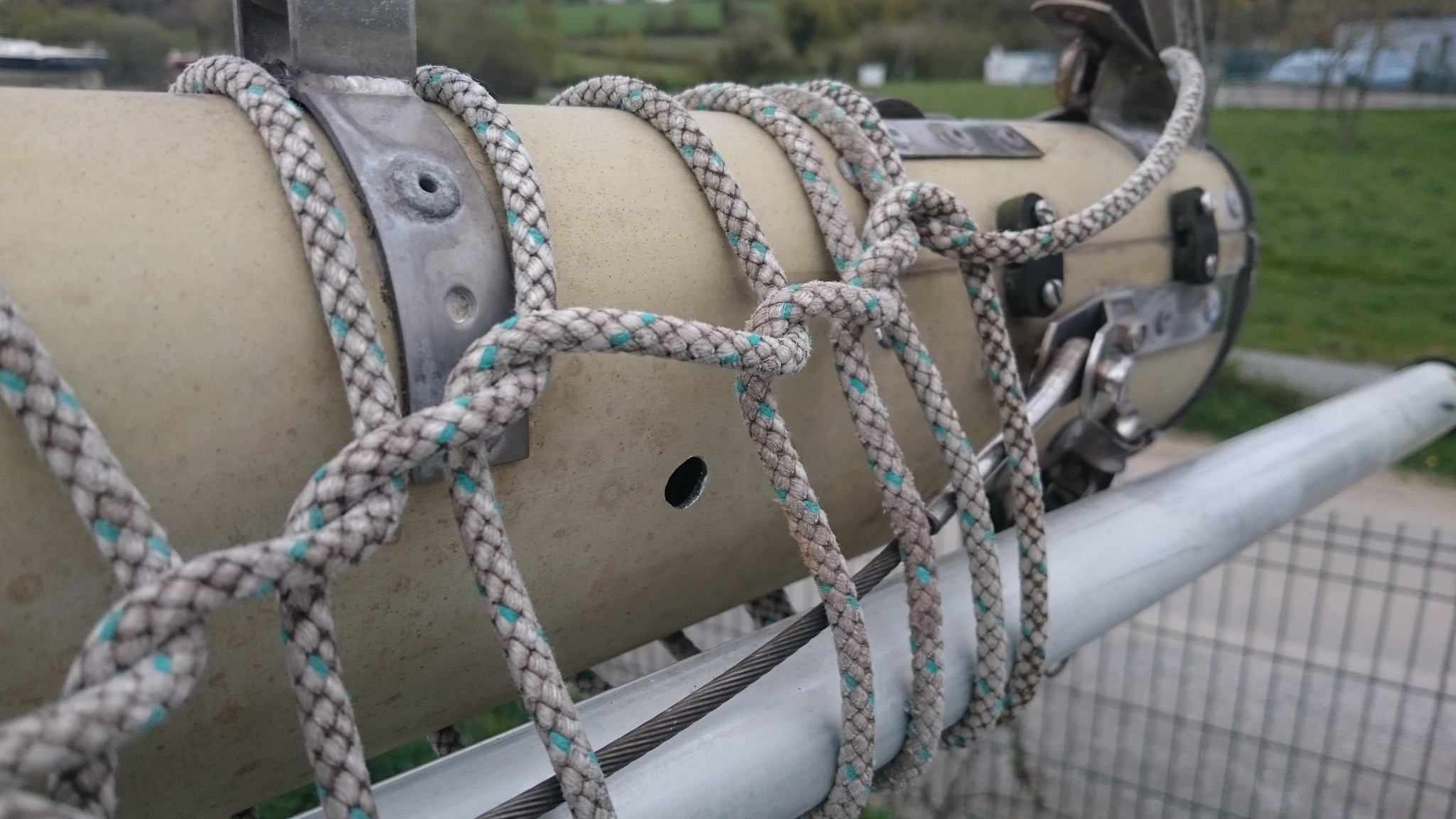 Le plan B étant d’utiliser le câble VHF, qui lui est déjà passé, comme messager de deux messagers (vous me suivez ?), ces deux messagers remonteront alors un nouveau câble VHF pour l’un et le cable électrique pour l’autre. J’accroche donc deux fils de fer au bout du câble VHF, en prenant soin de les passer chacun dans son trou, et si ça coince assez régulièrement, quelques allers-retour entre l’avant et l’arrière me feront pousser un cri de victoire lorsque le chaterton fait son apparition en pied de mât. Le voisin soulagé pour moi me met en garde : « c’est toujours là que ça déconne ». Je le sais, aussi je prend toutes les précautions pour tirer de là me deux fils de fer.