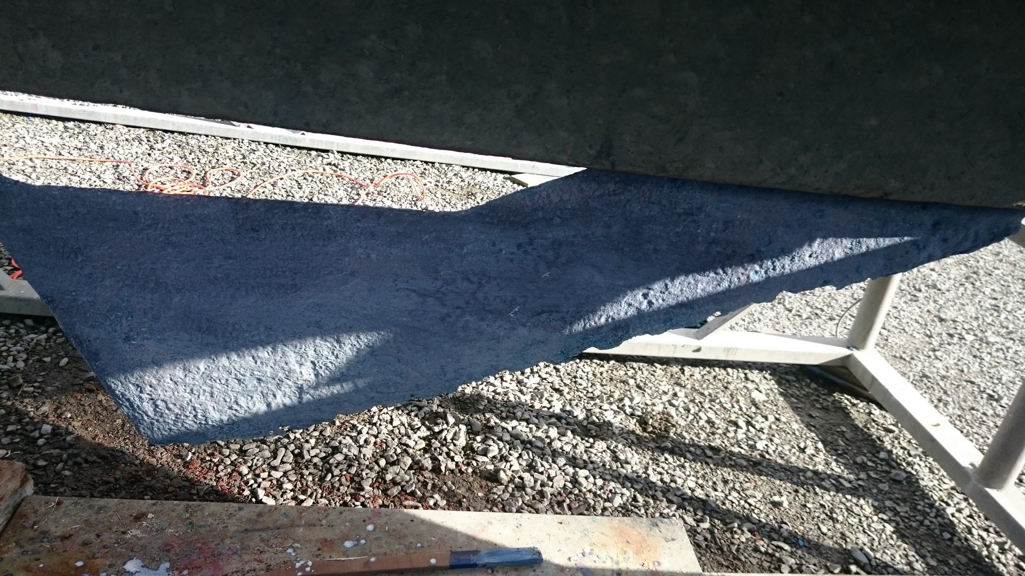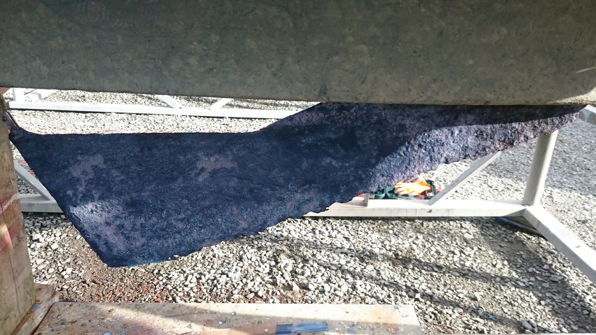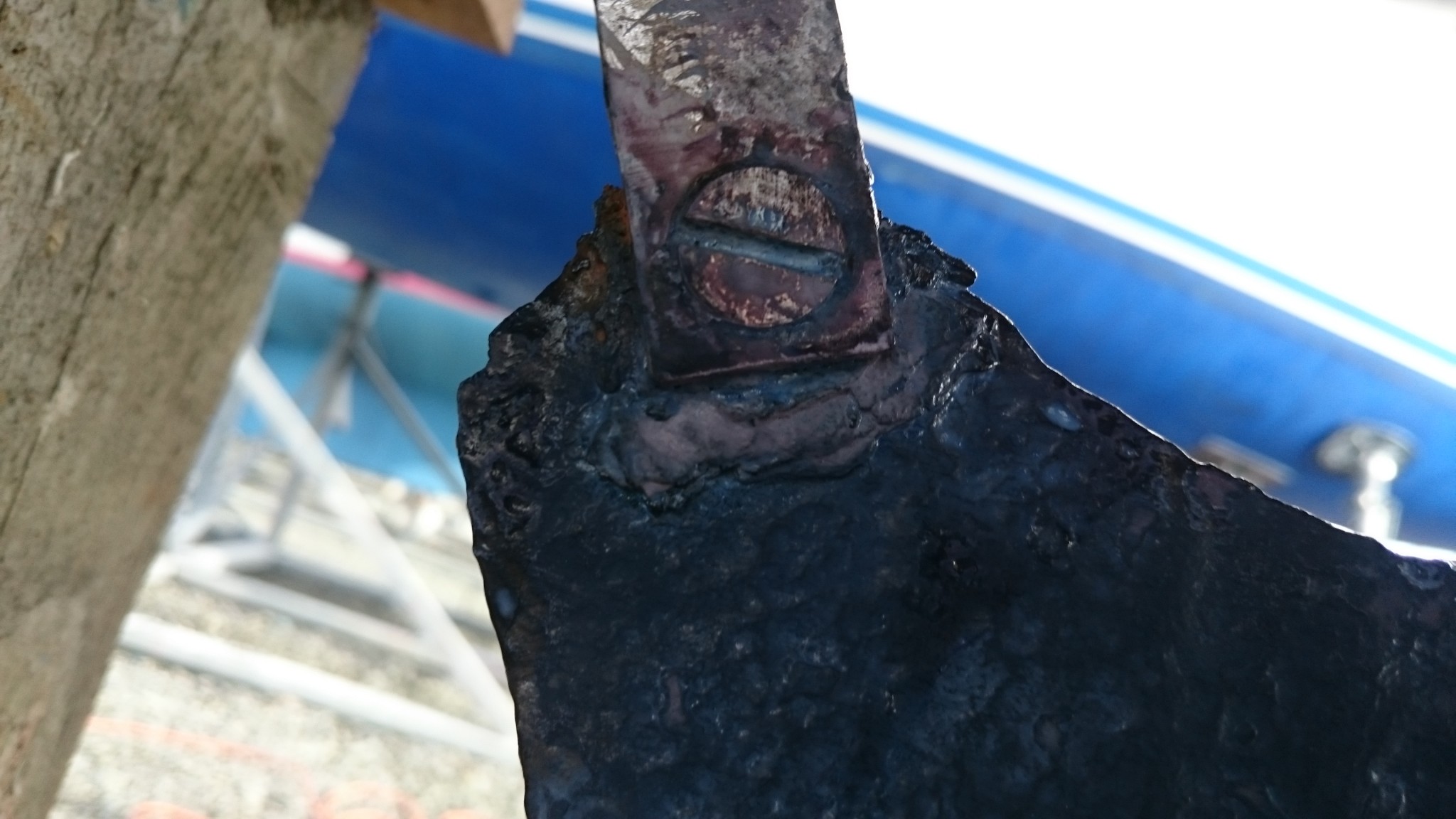 Un peu las de toutes ces allées et venues sur un pont bien encombré me font changer d’atelier : je m’occupe ensuite de traiter ma dérive. C’est la surprise de l’année, elle est bien vilaine et si j’ai décidé de faire une saison avec, je voudrais quand même la traiter anti-corrosion pour lui donner quelques chances supplémentaires de prendre sa retraite à l’hiver prochain. Avec une brosse métallique sur la perceuse, je supprime la rouille en surface. La dérive est presque belle après ça. Puis je passe dessus le produit que j’avais passé l’an dernier sur le saumon : le celtimeto. Le produit est blanc-laiteux qui devient bleuté là où le produit fait son effet.