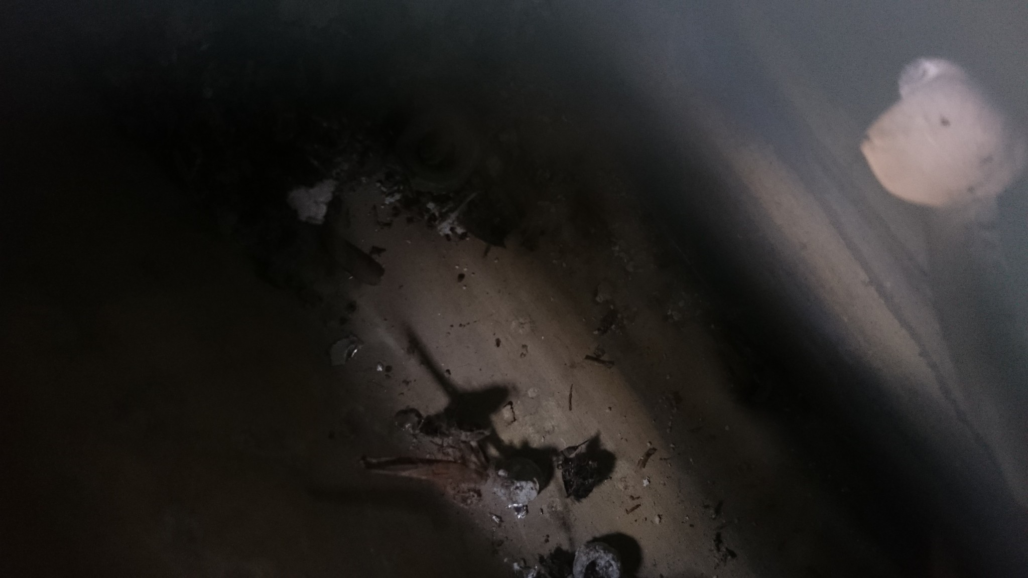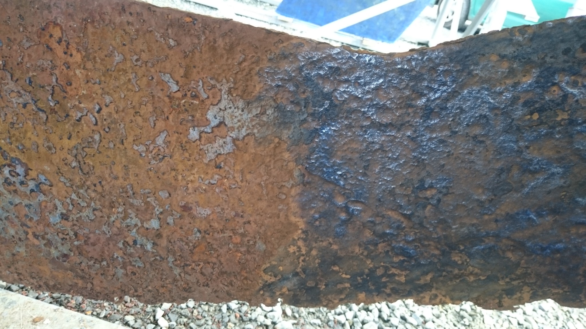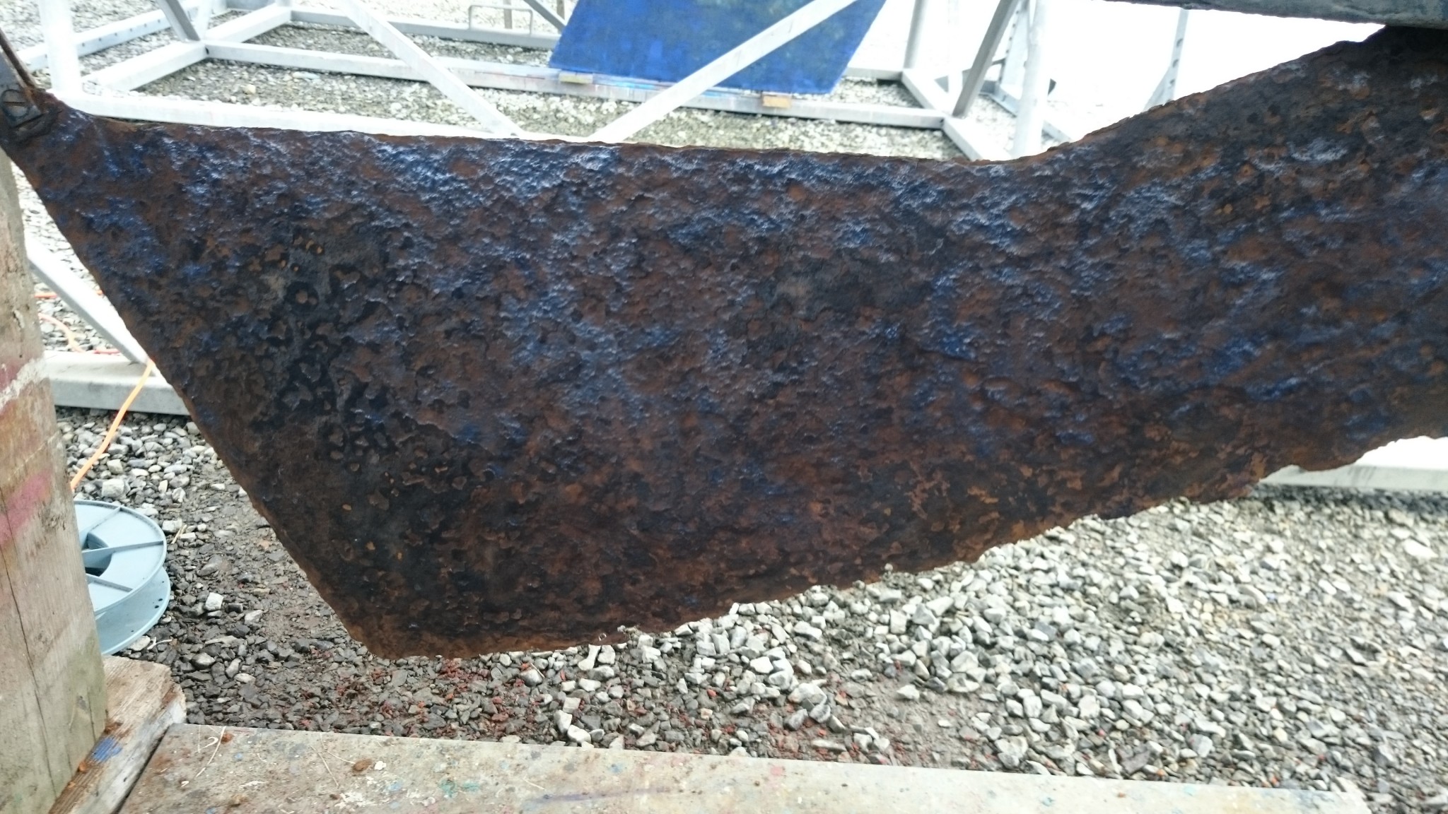 Un peu las de toutes ces allées et venues sur un pont bien encombré me font changer d’atelier : je m’occupe ensuite de traiter ma dérive. C’est la surprise de l’année, elle est bien vilaine et si j’ai décidé de faire une saison avec, je voudrais quand même la traiter anti-corrosion pour lui donner quelques chances supplémentaires de prendre sa retraite à l’hiver prochain. Avec une brosse métallique sur la perceuse, je supprime la rouille en surface. La dérive est presque belle après ça. Puis je passe dessus le produit que j’avais passé l’an dernier sur le saumon : le celtimeto. Le produit est blanc-laiteux qui devient bleuté là où le produit fait son effet.