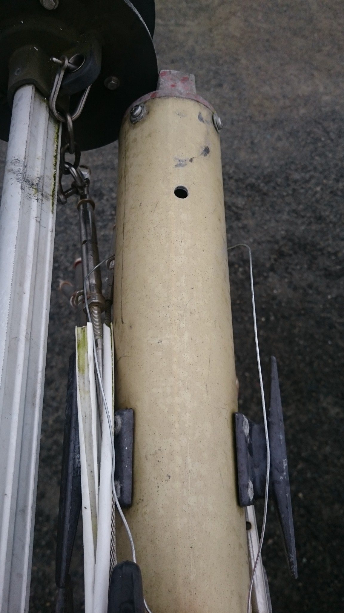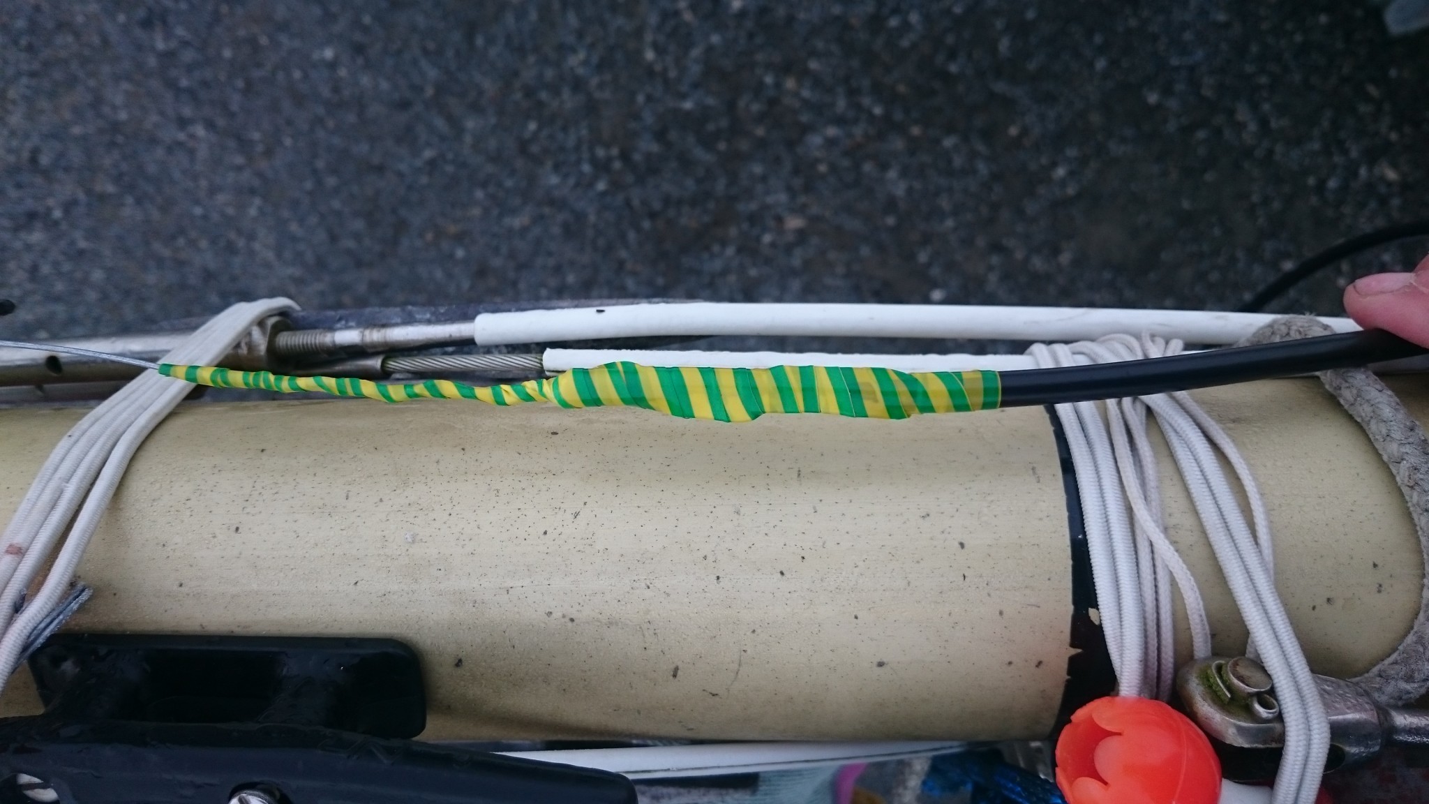 J’attaque les travaux juste après avec le passage du messager qui doit guider le fil électrique de mon futur feu de mouillage.Tant qu’à avoir le mât de posé, autant en profiter pour s’occuper de ce qui s’y passe en tête et auquel on n’aura (théoriquement) plus accès de si tôt. J’ai du fil de fer assez costaud, mais évidemment, ça coince et assez vite. Etant seul à bord, difficile de poser l’oreille sur le mât pour sonder où le messager est arrivé tout en le faisant bouger. Je ferai deux tentatives ainsi avant d’opter pour le plan B.