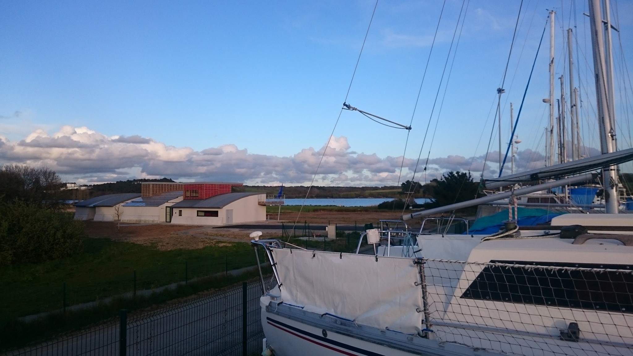 La session commence par quelques courses au Bricomarché de La Roche-Bernard. J’ai ma liste, et me répète en boucle que je dois y ajouter une tenaille pour pouvoir sectionner le fil de fer de mon messager. Sauf que ma soeur m’ayant resservi du café lorsque je cherchais chez elle son Karsher, j’ai pour priorité de trouver les toilettes… soulagé, j’en oublierai de prendre la tenaille (mais en fait, je n’en aurai pas eu besoin, j’ai à bord deux pinces multifonctions qui savent couper proprement). Ce Bricomarché est vraiment cool, on y trouve de tout, y compris une sélection de produits International. Désormais, plutôt que de faire une halte au départ je préfèrerai la faire à l’arrivée.